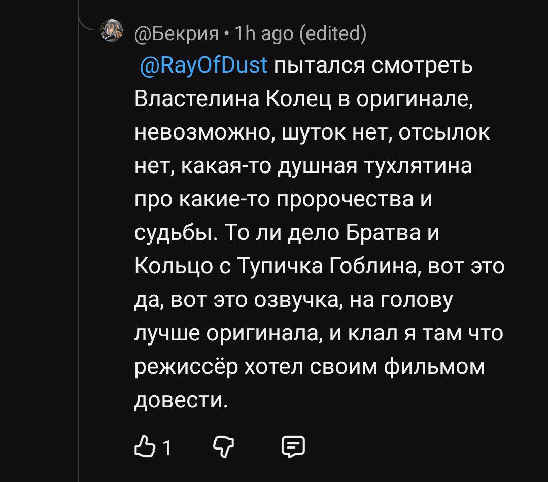A вообще я приятно удивлен отсутствию срачей и провокаций, и что тут можно обсуждать тему без перехода на личности. Я когда лет 5 назад зашел в тред и где-то упомянул что начал читать хоббита, мне сразу же прилетел спойлер - Торин сдохнет, приятного чтения.