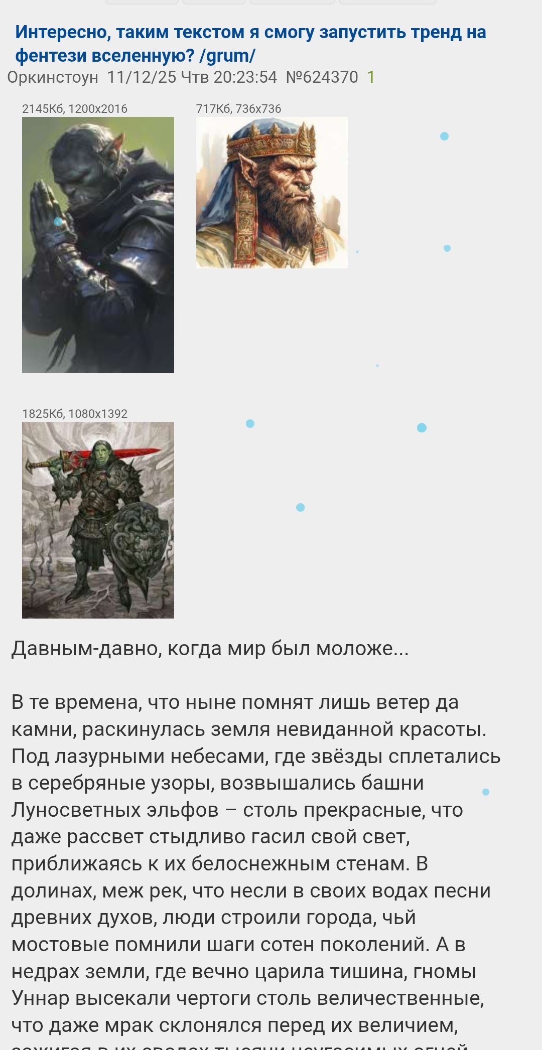 >>628673 >но наполнять его теми расами, которые нравятся? Ну так орки, тролли, гоблины и иже с ними нравятся. Люди с эльфами и дварфами нет. >Типа, зачем прописывать мирку, что светлые расы исчезли? Потому что такова была завязка того треда, откуда я эту идею подрезал. Мне эта идея просто нравится.