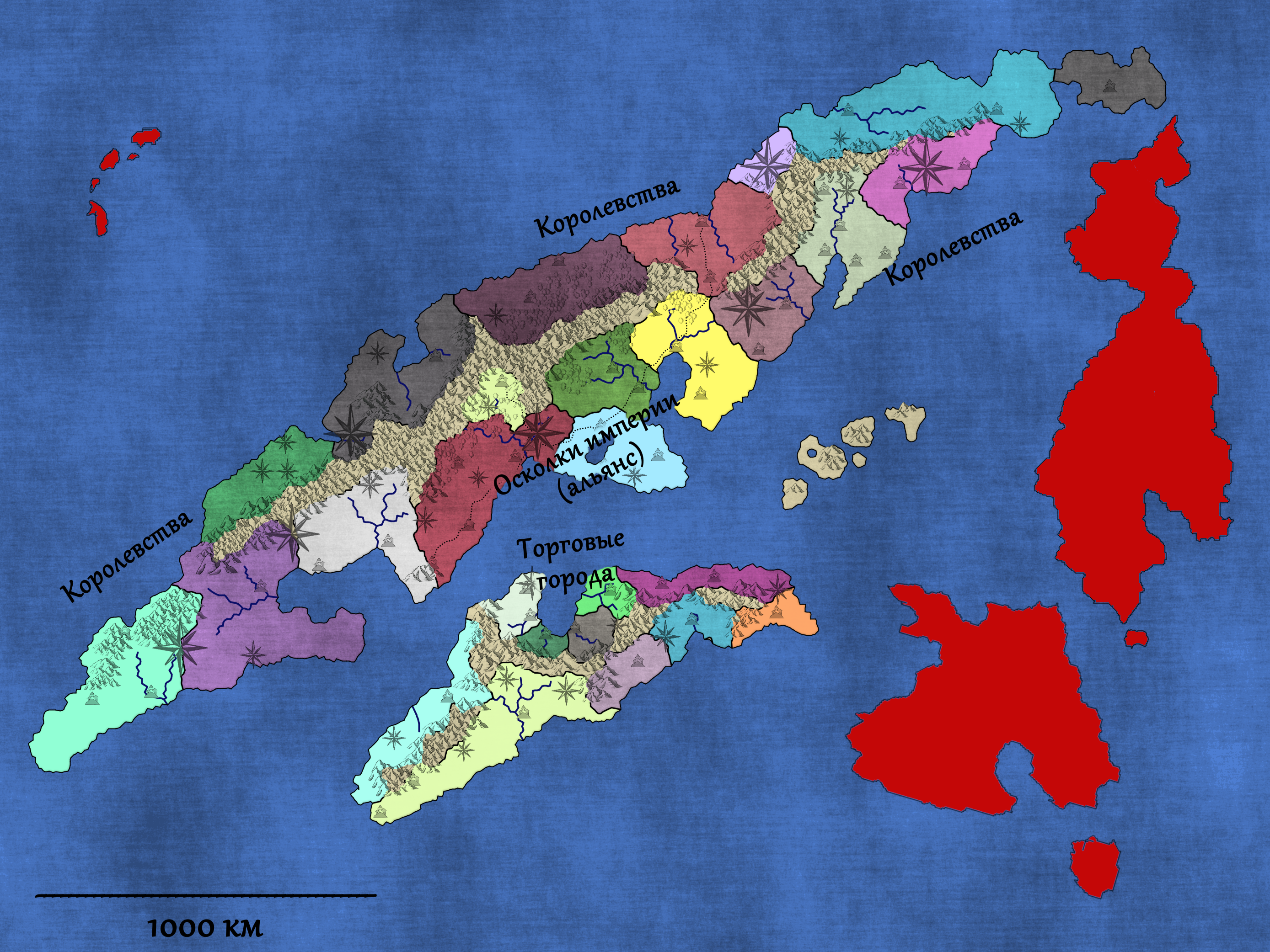 В бывших центральных провинциях образовались десятки человеческих королевств, княжеств, вольных герцогств... В общем, основали эти королевства вторгнувшиеся люди (предварительно вырезав всяких орков-гоблинов-троллей-огров и так далее, бывших их условными союзниками на первом этапе всей этой кутерьмы), вожди и наиболее выдающиеся воины которых брали себе в рабыни эльфиек. От этих связей у них рождались дети.