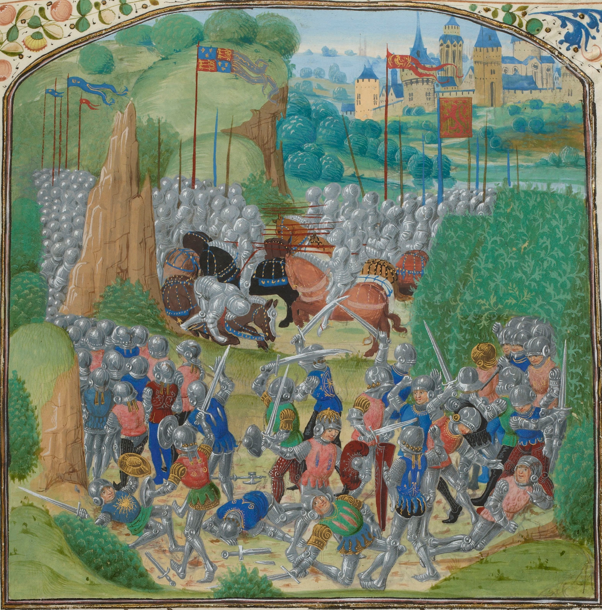 Вот смотри - изо из ирл. Что видим: укол меча пробивает кирасу/бригантину, наносит рубленые раны через шлем, мечи со щитом/баклером - стандартное оружие рыцаря/man-at-arms (фиг знает, как на русский перевести, "тяжёлый воин"?). Алебарда одна- на земле валяется.