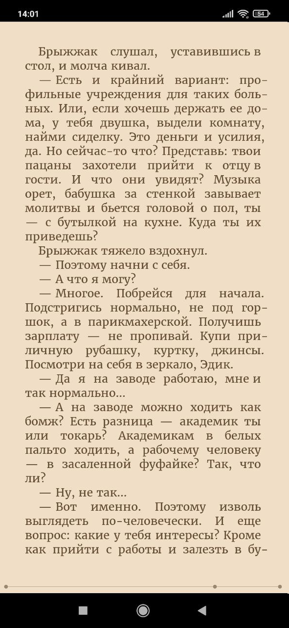 Прочитал "Из огня да в полымя" Серга Усова, до онгоинга, почти два тома. Русреальная офисная дорама про то, как сознание сельского гопника и тюти-интилихента слились в одно - уверенного в себе молодого человека, который к тому же получил сверхспособность эмпатии и чтения мыслей. Ну и этот молодой супермен карабкается по карьерной лестнице вверх, ловко уворачиваясь от подстав и интриг. В целом понравилось, хотя путь героя щедро усыпан роялями и плюшками. Пусть и без описаний, как он раскидывает с вертушки банды якудза (привет псевдояпонским атешным дорамам). Что хорошо - решает проблемы ГГ преимущественно умом. Что плохо - куча опечаток и очень заметное акынство, т.е. "что вижу - то пою", про носки, про мозоли, про банковские приложения, про сыр в пятерочке и так далее, местами пролистывал. Но, повторюсь, в целом книга понравилась, проду буду читать. Хоть и местами кринжевал с рассуждений ГГ, как же без этого. 7 пьянок с бухгалтершами из 10 А срущим в разделе политачерам хуй в жопу и перо под ребро