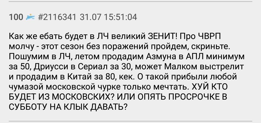и Мирзов. Кладём хуй на прочие убогие премьер-лиги, лиги двух команд, продажные серии и унылые чемпионаты, рассматриваем Дзюбин хуй и анус с различных ракурсов, ебём спермтаковских свиношлюх поедая 33 пельменя, давим ЦСКАЛ, катаемся на Камаро по Калифорнии, смываем зинит и ссым в ебло Ненину, ставим варди, глорим за свой клуб и делимся стопроцентными инсайрами