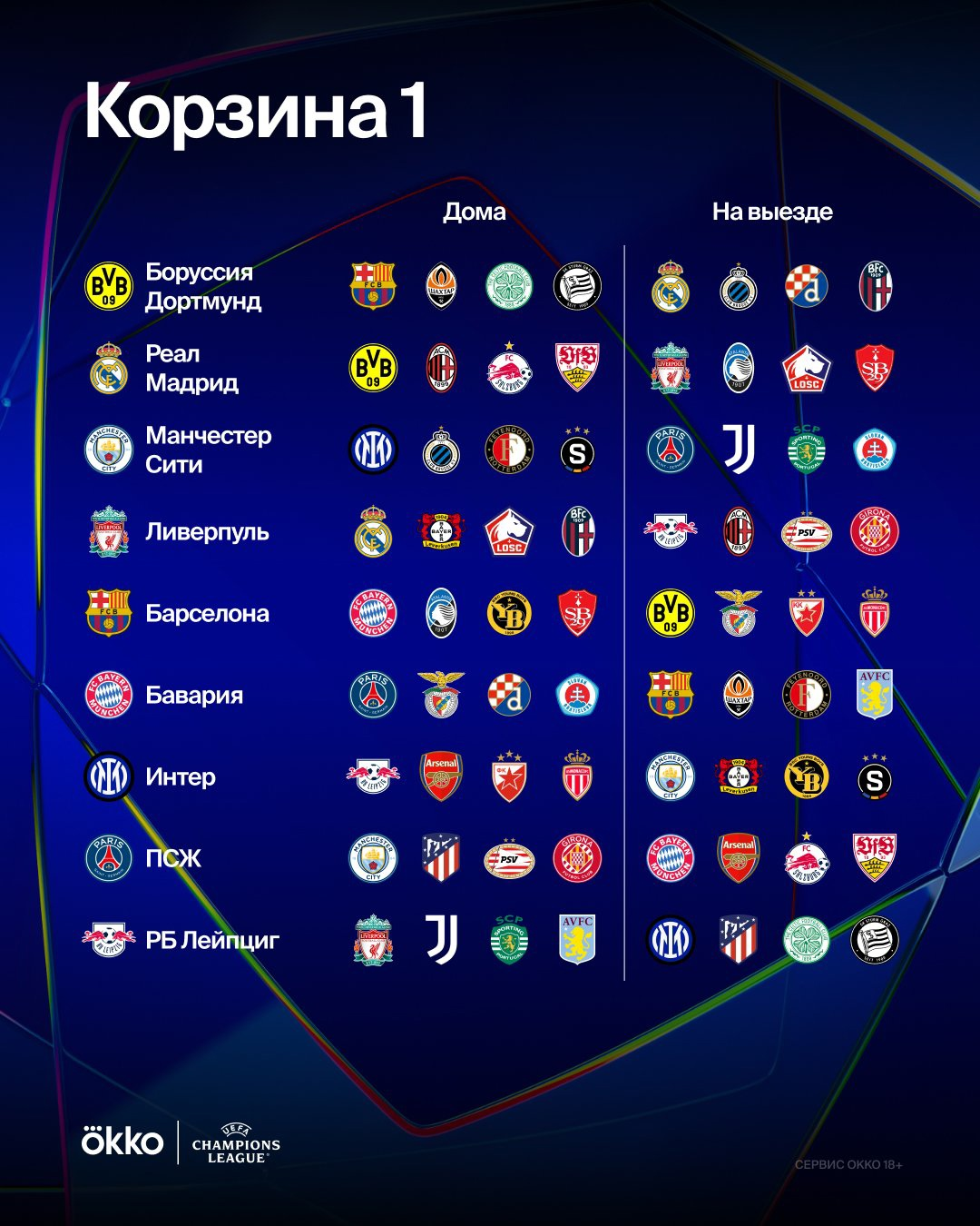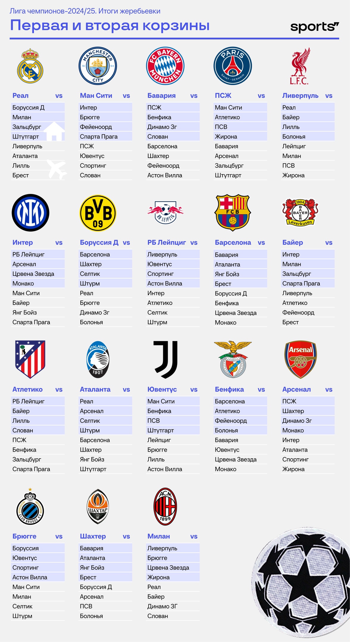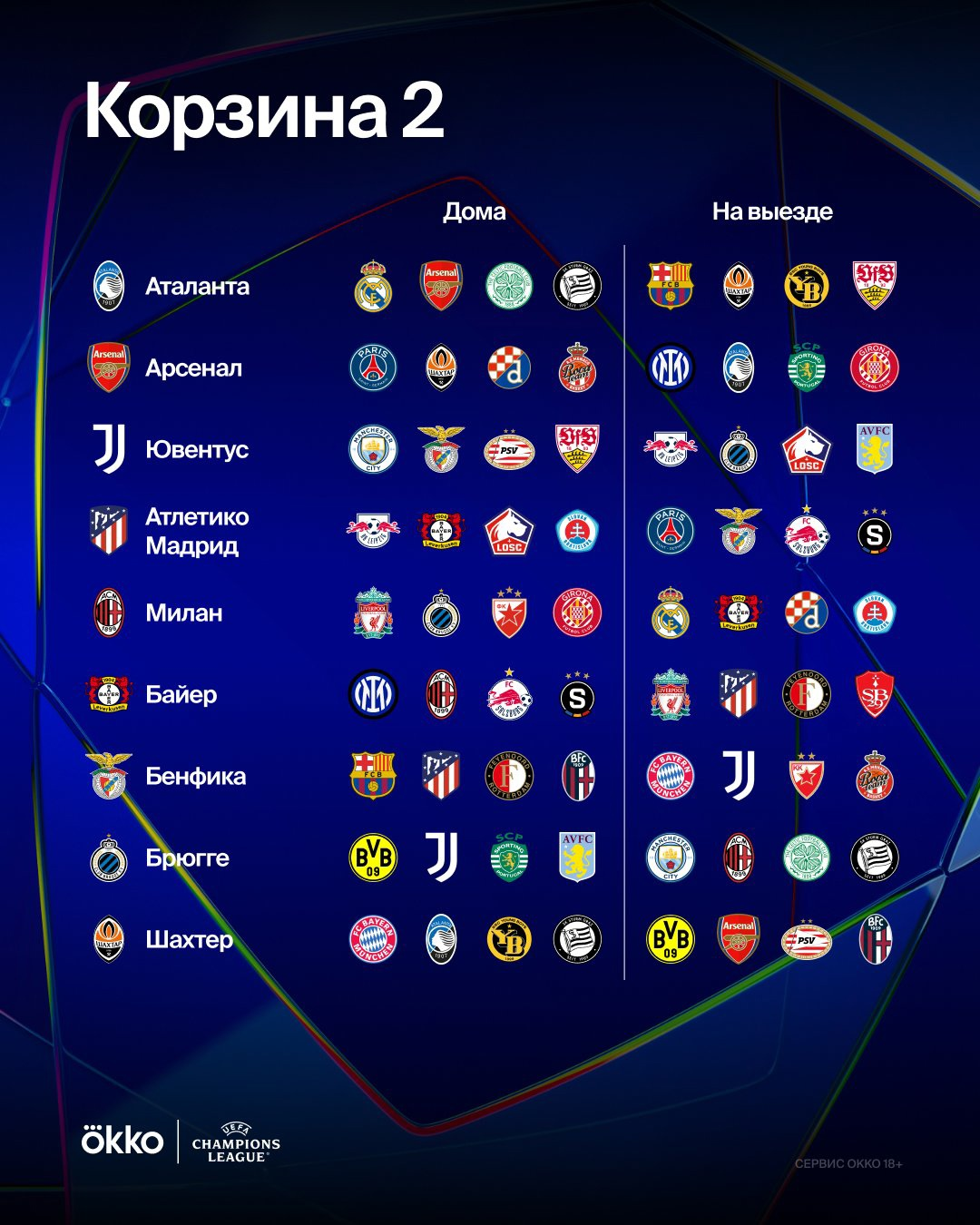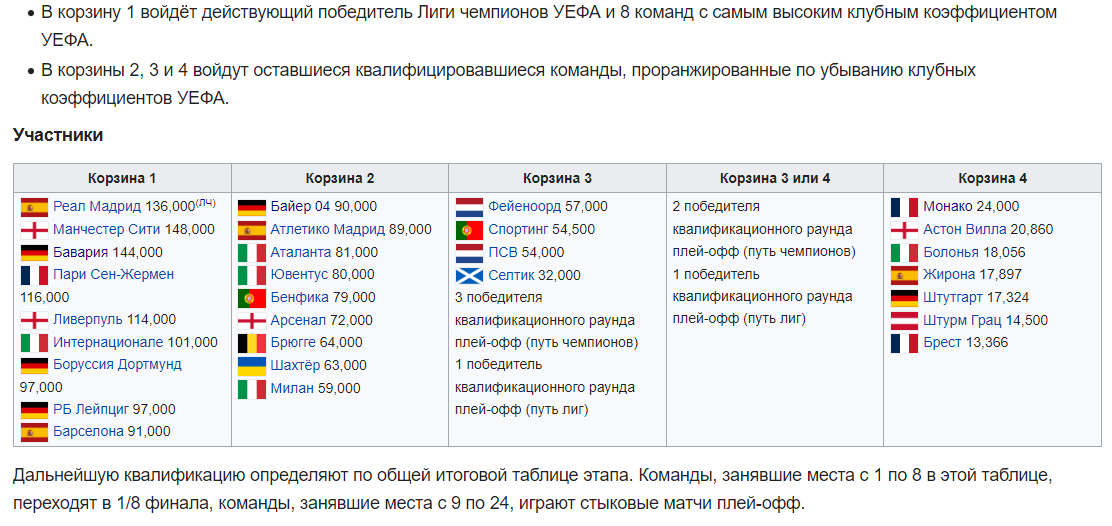 Включаю все ресурсы своего слабенького мозга, чтобы понять новый формат. Значит у нас здесь продолжается поддержка, так скажем, более слабых команд. Это не значит, что им автоматически выдают медаль за участие, но значит, что им дают шанс себя проявить. 36 команд распределяются в 4 группы. И здесь самое интересное. Группы распределены по силе команд. Соответственно, в первой корзине мы увидим одно место для победителя ЛЧ прошлого сезона и, внимание, следующие 8 команд - это команды с наиболее высоким коэффициентом УЕФА. - Первая корзина ЛЧ 2024/45: Реал, МС, Бавария, ПСЖ, Ливерпуль, Интер, Боруссия, Лейпциг, Барселона. 2, 3 и 4 корзины формируются аналогичным образом - только по коэффициенту УЕФА и ни по какому другому параметру. Например: - Вторая корзина: Байер, Атлетико, Аталанта, Ювентус, Бенфика, Арсенал, Брюгге, Шахтёр, Милан.