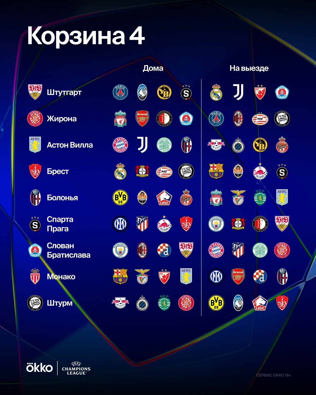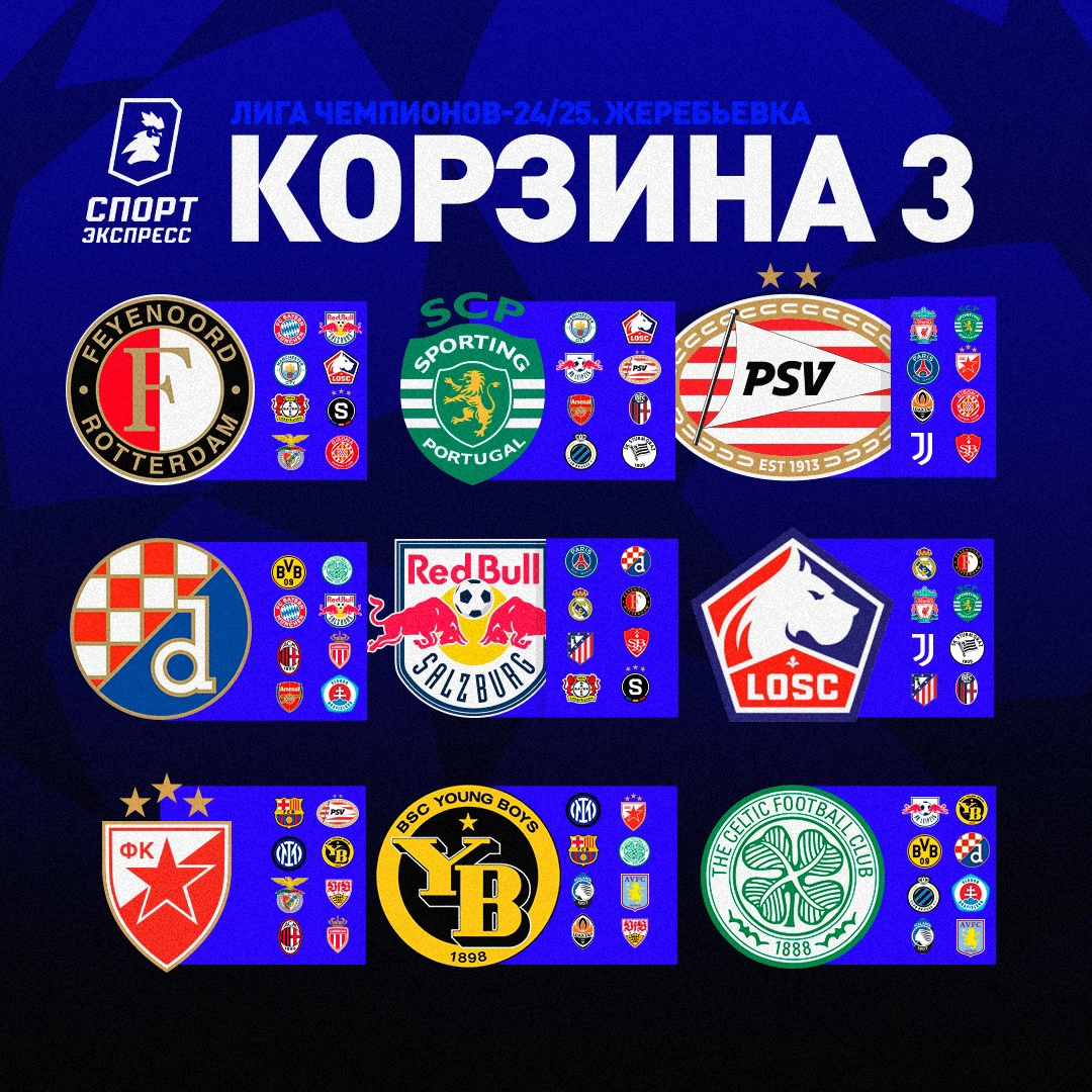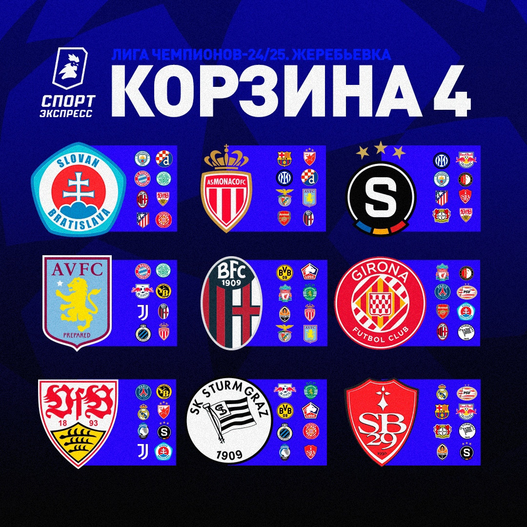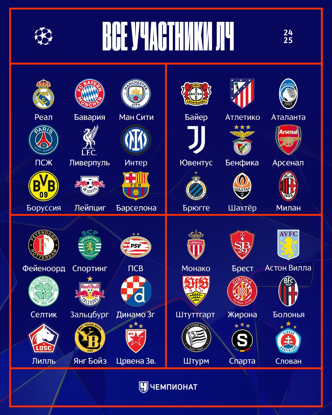 Включаю все ресурсы своего слабенького мозга, чтобы понять новый формат. Значит у нас здесь продолжается поддержка, так скажем, более слабых команд. Это не значит, что им автоматически выдают медаль за участие, но значит, что им дают шанс себя проявить. 36 команд распределяются в 4 группы. И здесь самое интересное. Группы распределены по силе команд. Соответственно, в первой корзине мы увидим одно место для победителя ЛЧ прошлого сезона и, внимание, следующие 8 команд - это команды с наиболее высоким коэффициентом УЕФА. - Первая корзина ЛЧ 2024/45: Реал, МС, Бавария, ПСЖ, Ливерпуль, Интер, Боруссия, Лейпциг, Барселона. 2, 3 и 4 корзины формируются аналогичным образом - только по коэффициенту УЕФА и ни по какому другому параметру. Например: - Вторая корзина: Байер, Атлетико, Аталанта, Ювентус, Бенфика, Арсенал, Брюгге, Шахтёр, Милан.