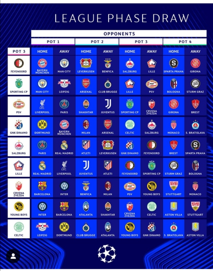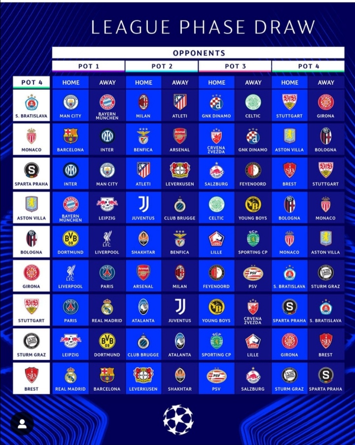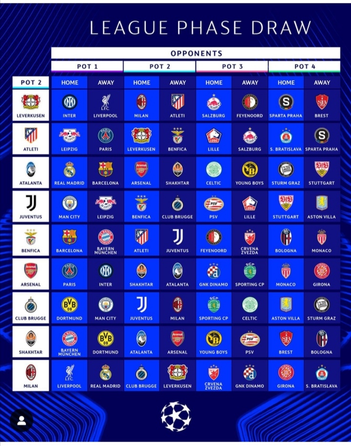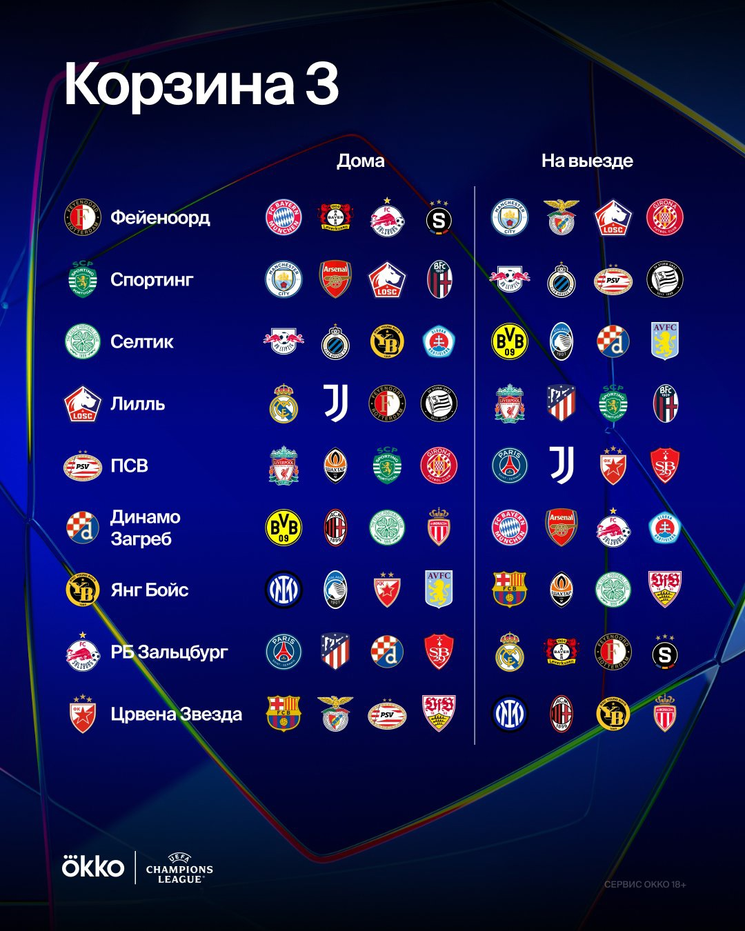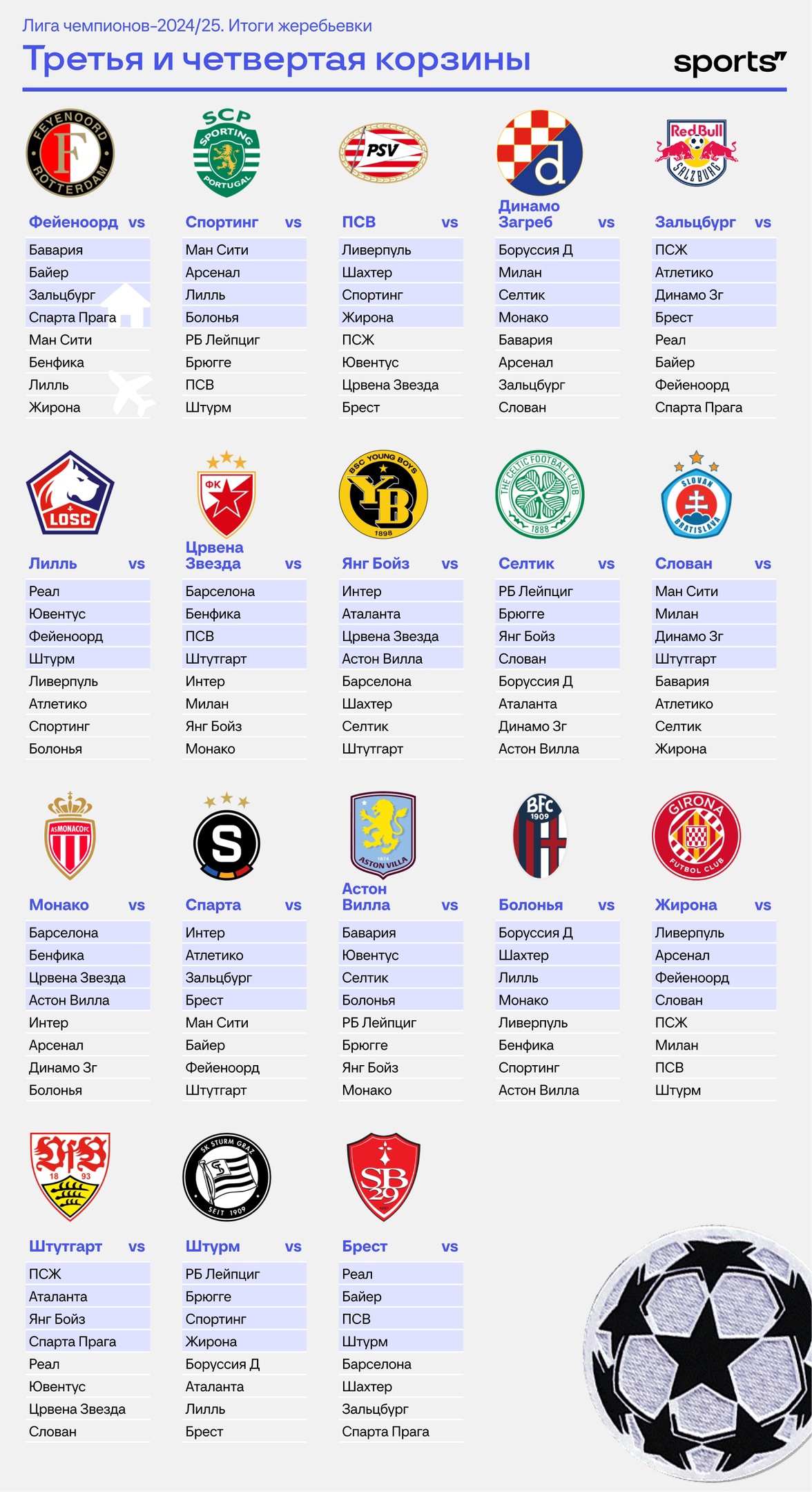Включаю все ресурсы своего слабенького мозга, чтобы понять новый формат. Значит у нас здесь продолжается поддержка, так скажем, более слабых команд. Это не значит, что им автоматически выдают медаль за участие, но значит, что им дают шанс себя проявить. 36 команд распределяются в 4 группы. И здесь самое интересное. Группы распределены по силе команд. Соответственно, в первой корзине мы увидим одно место для победителя ЛЧ прошлого сезона и, внимание, следующие 8 команд - это команды с наиболее высоким коэффициентом УЕФА. - Первая корзина ЛЧ 2024/45: Реал, МС, Бавария, ПСЖ, Ливерпуль, Интер, Боруссия, Лейпциг, Барселона. 2, 3 и 4 корзины формируются аналогичным образом - только по коэффициенту УЕФА и ни по какому другому параметру. Например: - Вторая корзина: Байер, Атлетико, Аталанта, Ювентус, Бенфика, Арсенал, Брюгге, Шахтёр, Милан.