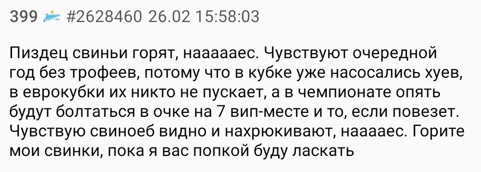 Смотрел игру в Махачкале и диву давался, как это убожество под названием спартак умудрилось диктовать нам свою игру две трети матча на Крестовском даже без относительно удаления Эраковича? Это Зенит был так плох тогда или свиньи играют матч жизни, выпрыгивая из штанов, только с нами, а потом возвращаются в своё привычное состояние унылого говна?