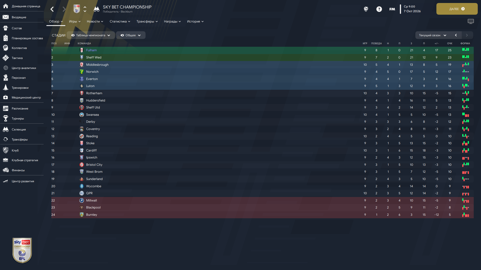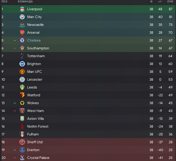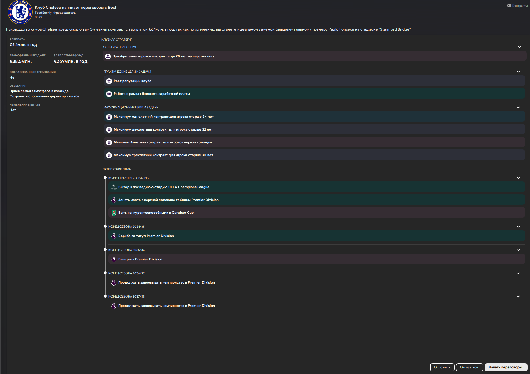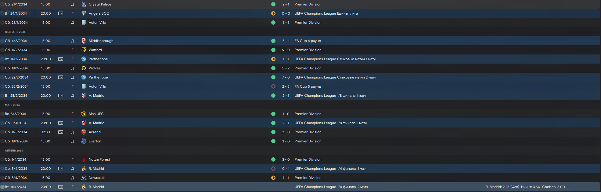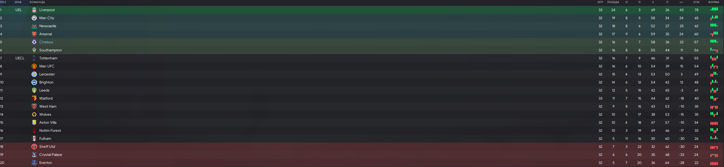 ползём на 4-ом месте, имея 3 игры в запасе. сезон в некотором смысле перестроечный, в центре полузащиты много анскильных новичков, которым потребуется целый сезон чтобы нафармить показатели. так же в арендах набирается опыта неплохое подспорье. из Челси выпизднули Фонсеку и я на дурака кинул заявку туда и в Бильбао. никогда не тренил топ-клуб и топ-5 лиг. а Челси так вообще работа мечта. если примут - откатаю там 20-25 сезонов и закончу сейв нах. если выпизднут раньше, то буду думать. как не смешно, а Тэдди Боулинг обещает 32 миллиона на усиление в зимнее окно. совсем ёбнулся