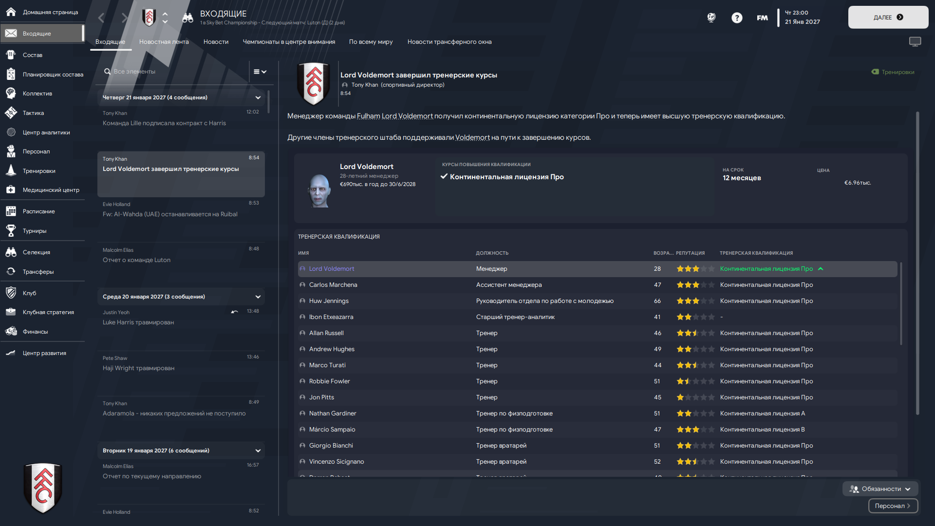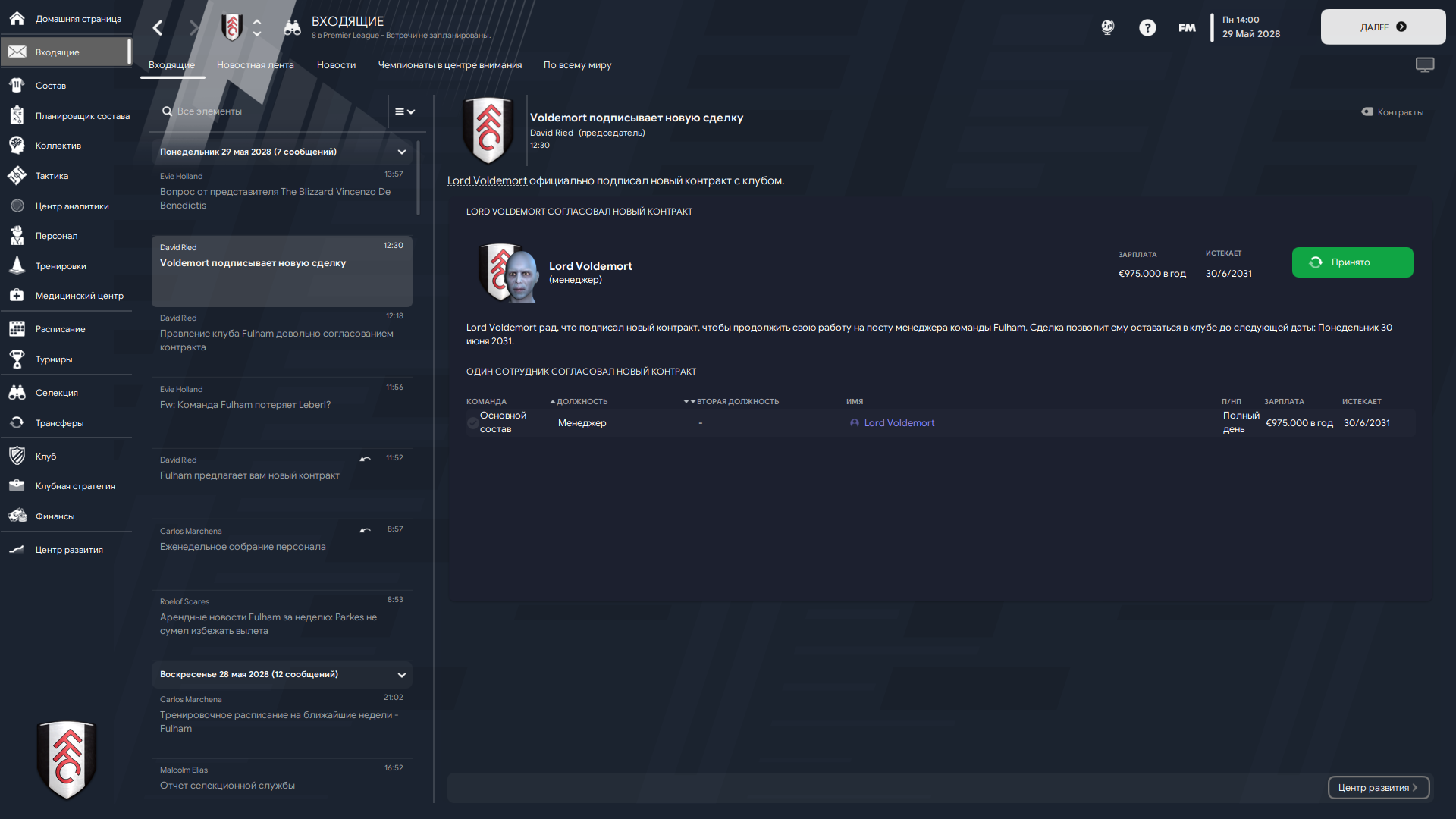На этом карьера в пердях была закончена, как казалось, и Лорд Волан-де-Морт стал искать уже топ-клуб. На прицеле были Ньюкасл и Лацио - везде Лорд был послан нахуй. Однако, был на горизонте ещё один клуб - Фулхэм, который в самый последний момент умудрился пролететь мимо выхода из Чемпионшипа и уволил тренера.