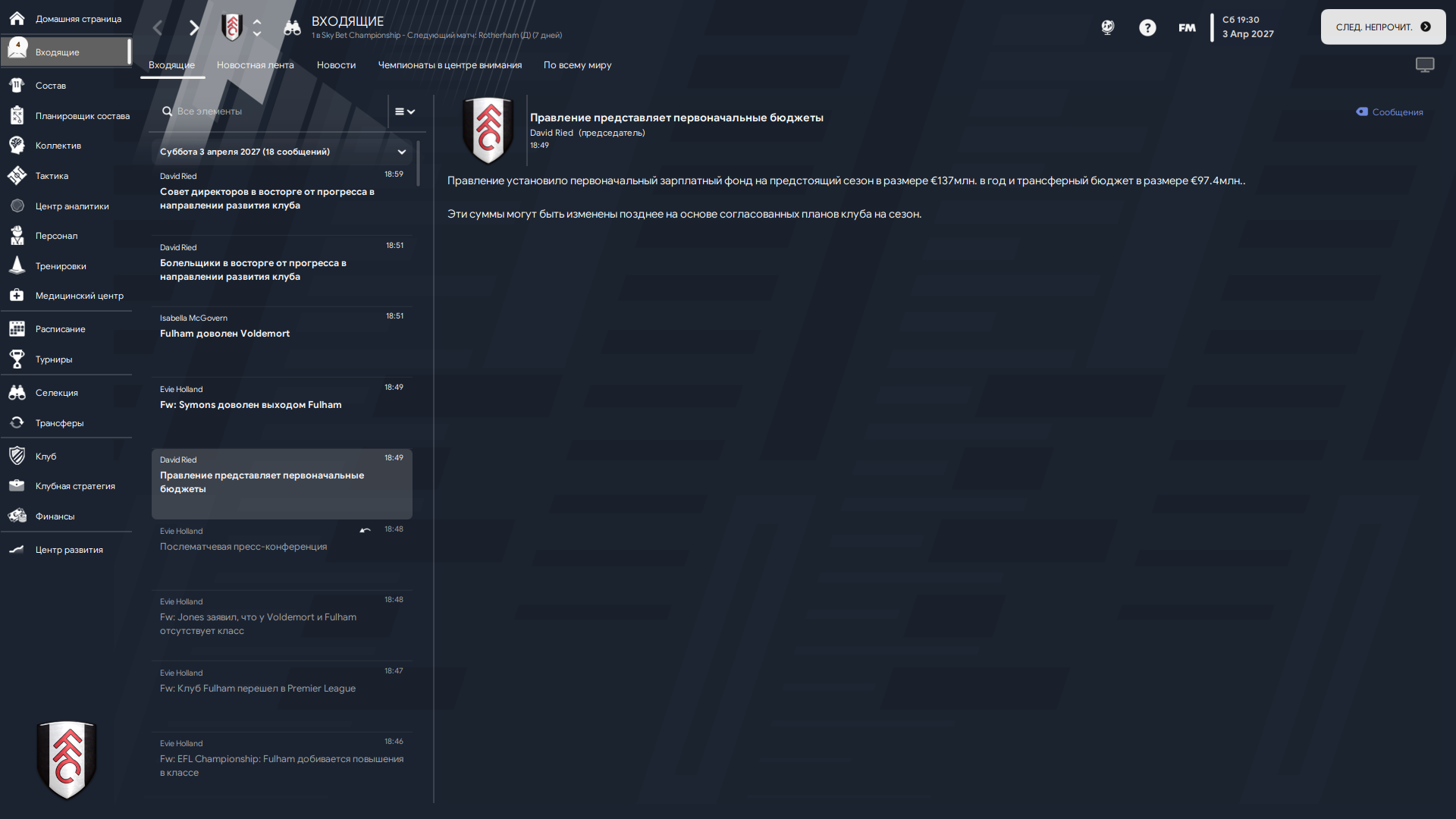 Один минус есть - хитрый олигарх решил не докидывать со своих в трансферный бюджет и оставить меня с суммой, которая и была. Жаль, ну ладно, может потом побольше дадут, когда исчерпаемся в ноль.