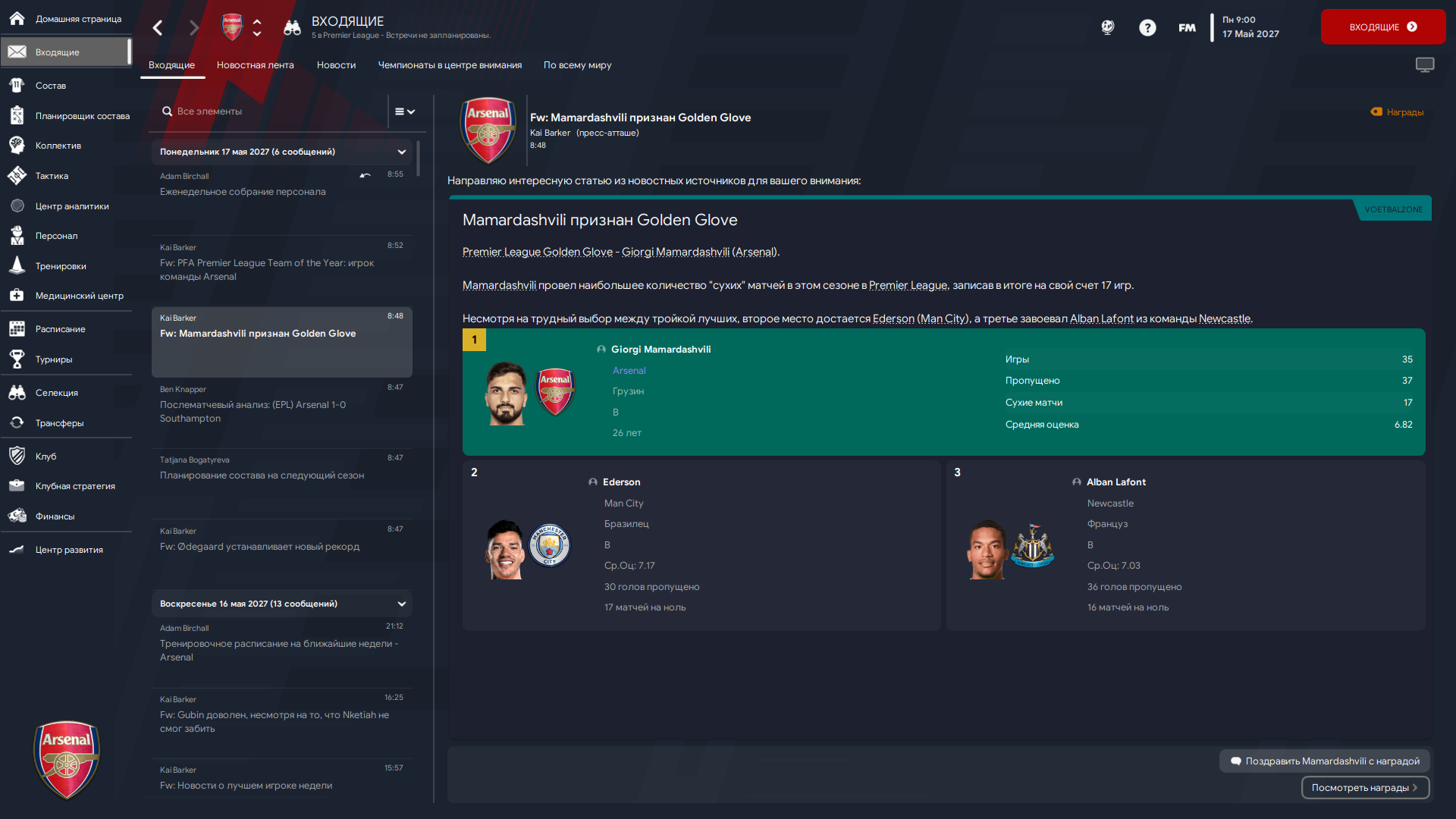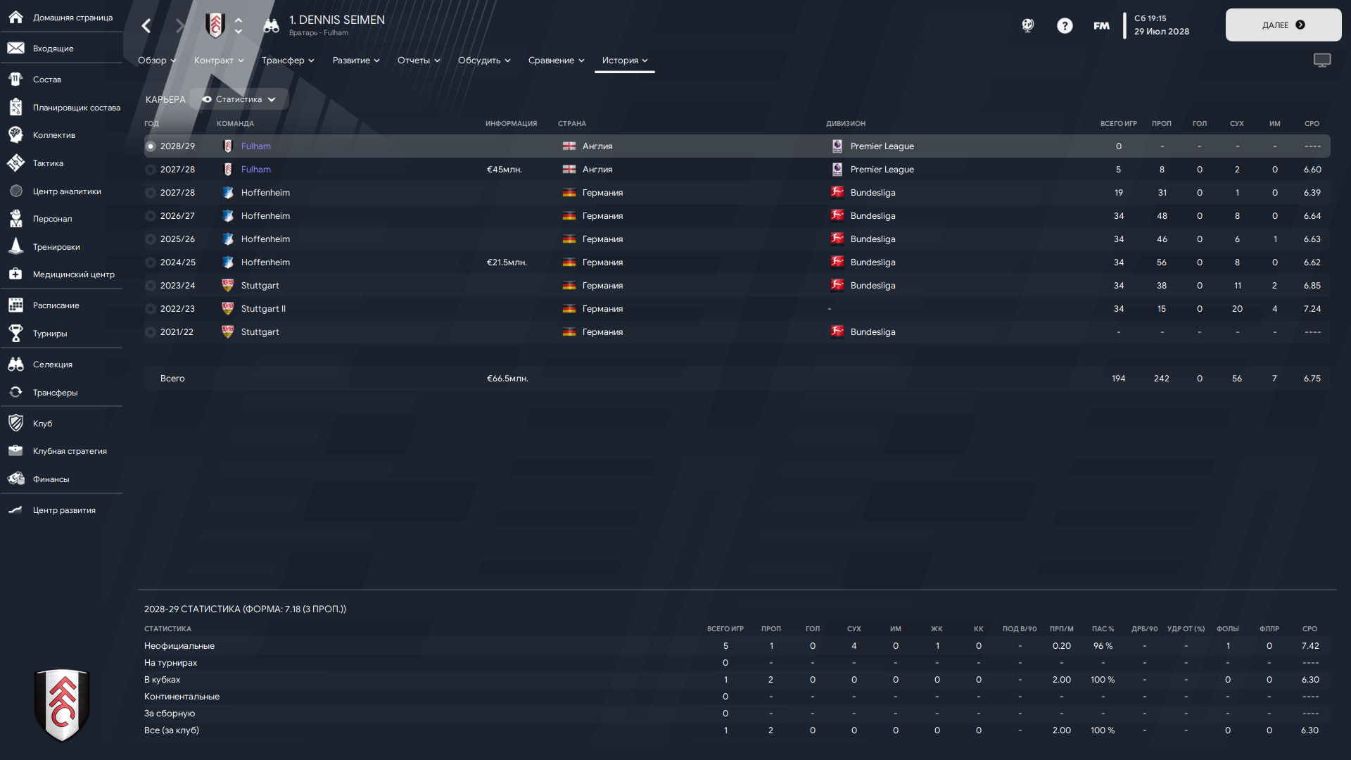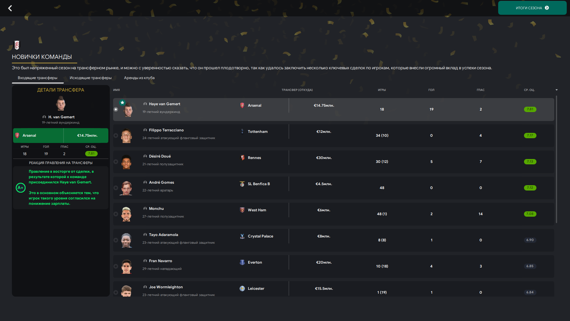 Хайе ван Гемерт (5+) - лучший новичок по мнению руководства, я согласен, освежил линию атаки. После его подписания спокойно выпизднул с клуба охуевшего Азмуна, видимо забухавшего на Кубке Азии и позвонившего ко мне с претензиями, типа "э баля, я перерос фулхэм уууу" и ещё такой "озлобленный". Я его нах послал, он стал "разъярённый". Бросил трубку и нашёл ему повышение в классе - Азмун уехал в Мексику. Или куда-то туда, да и хуй с ним. Благодаря этому нытику мы нашли Хайе, настоящий бриллиант, всего за 15 миллионов, задача на это ТО - переподписать с ним контракт, убрав или значительно повысив отступные, пока не увели. 19 голов в 18 матчах, браво!