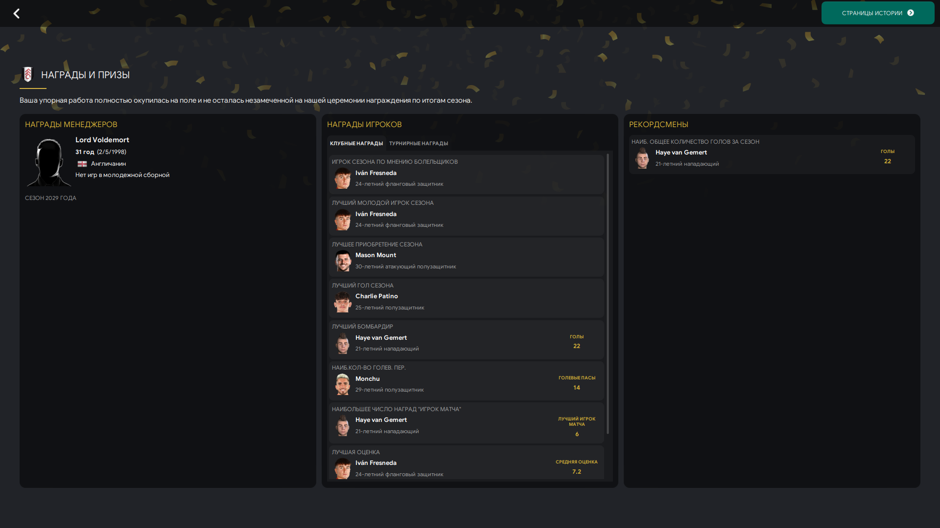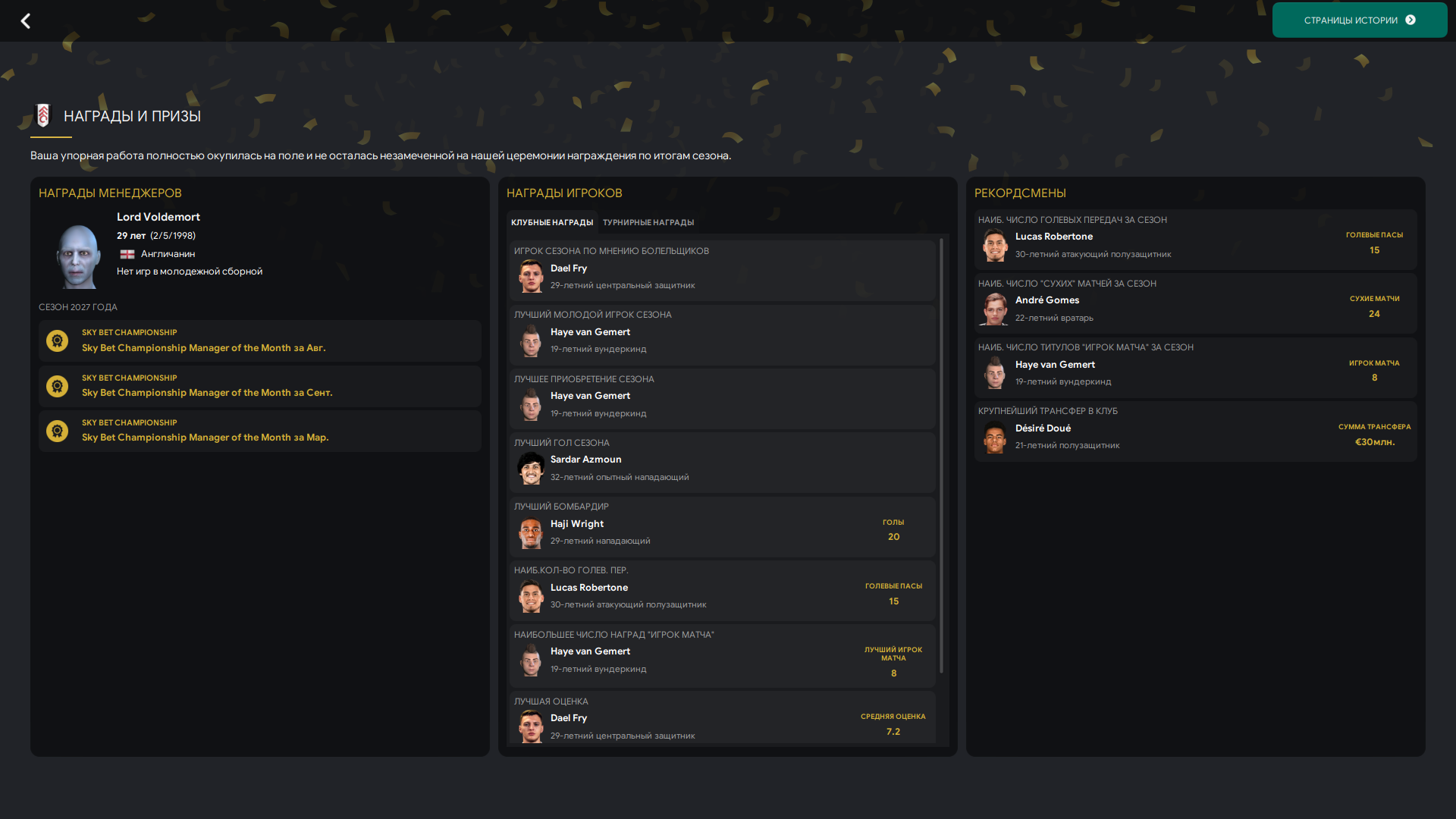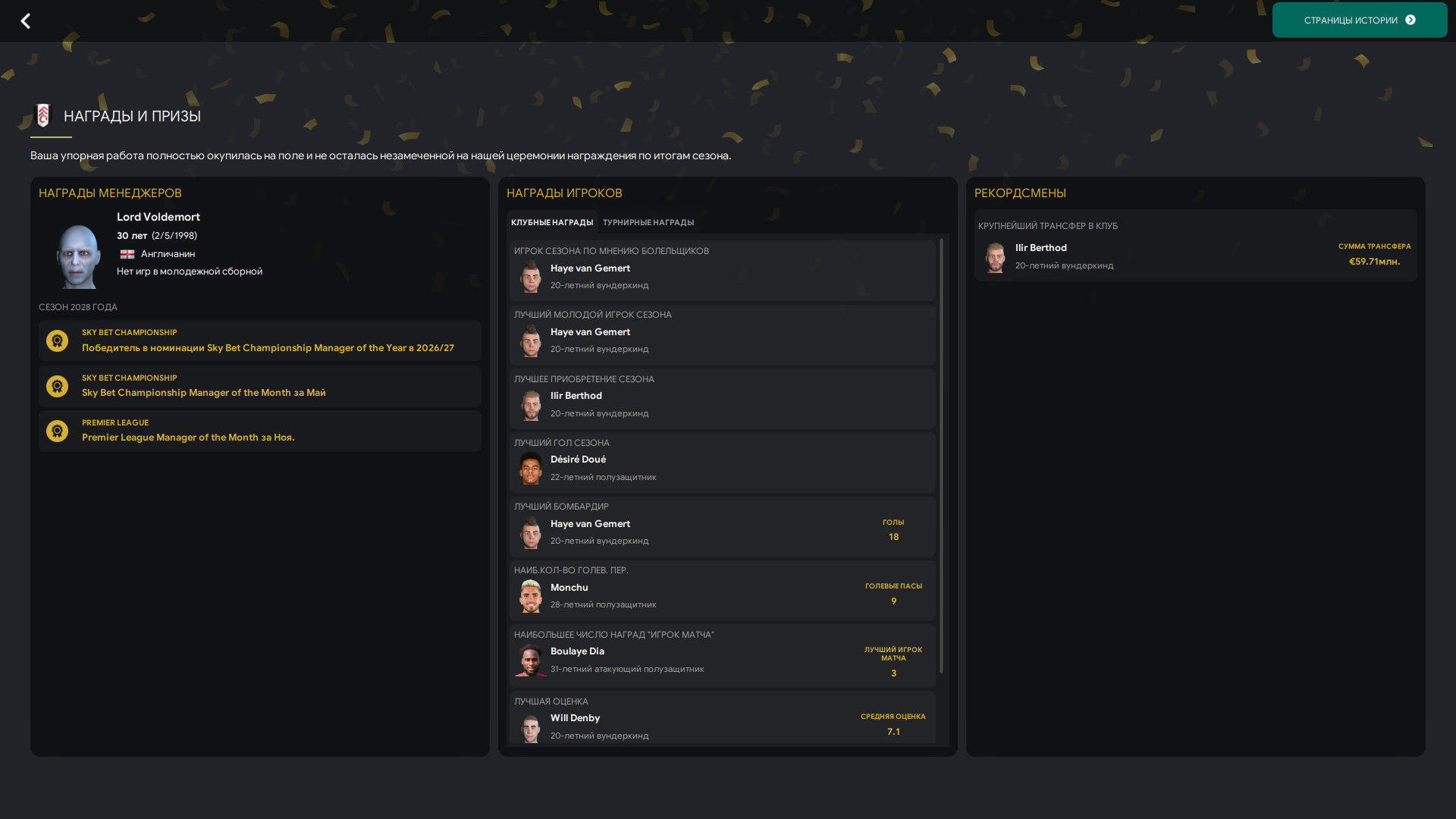 Игрок сезона по мнению болельщиков, лучший молодой игрок сезона, лучший бомбардир, лучший игрок Евро-2028 (!), член символической сборной Евро-2028 (!!), лучший молодой игрок Евро-2028 (!!!) - Хайе ван Гемерт.