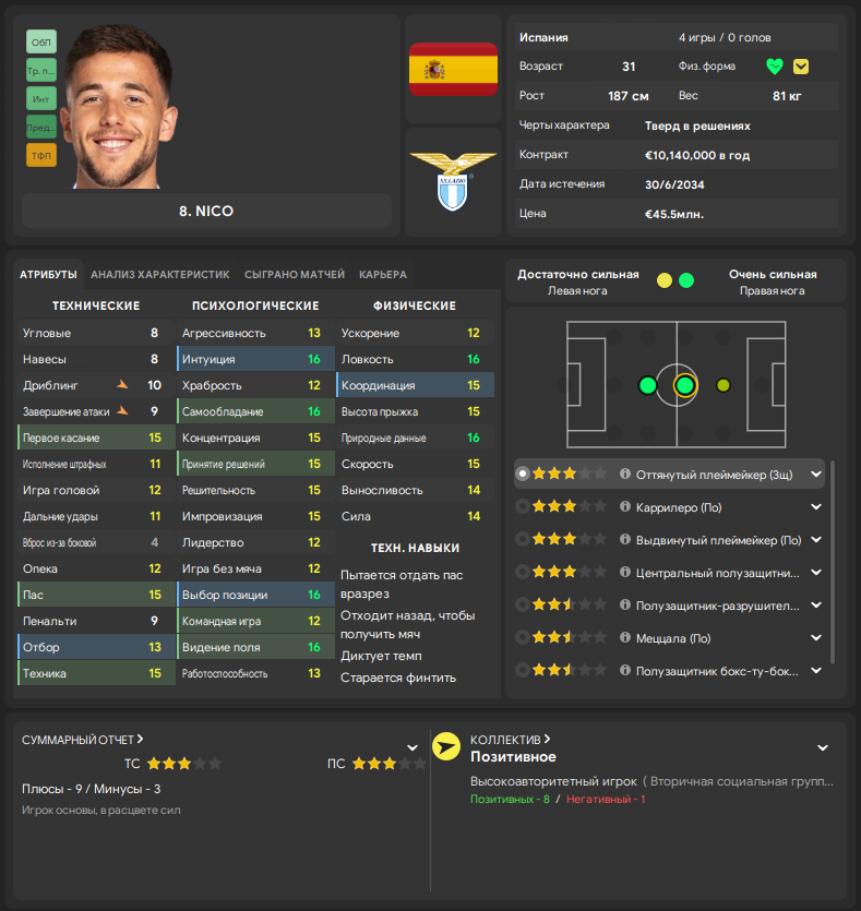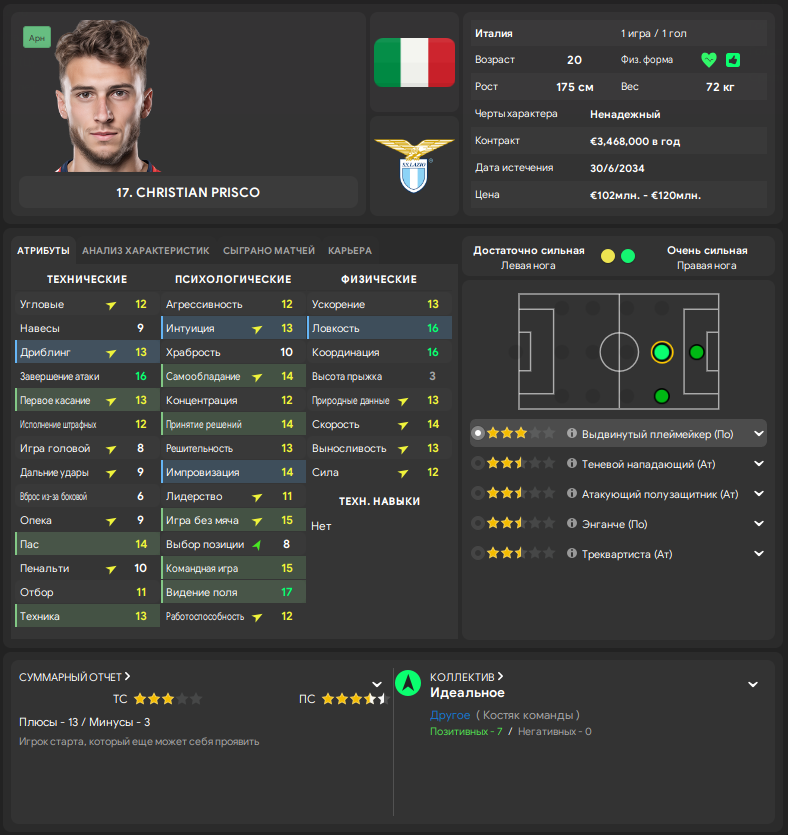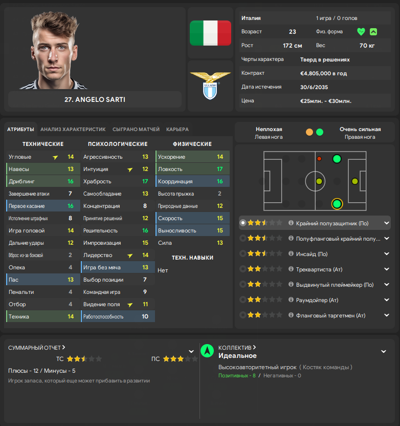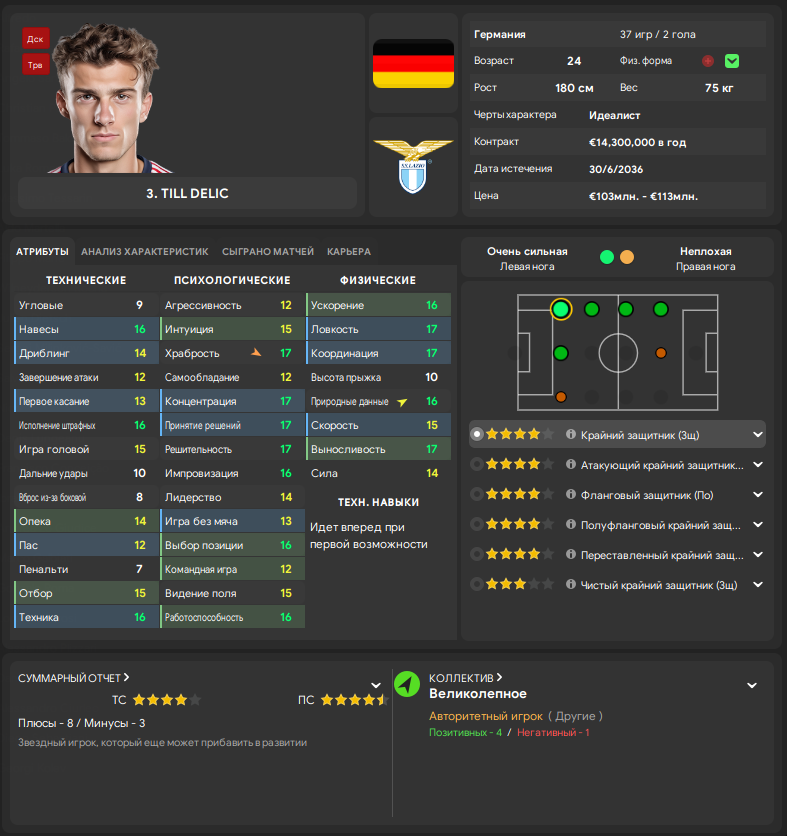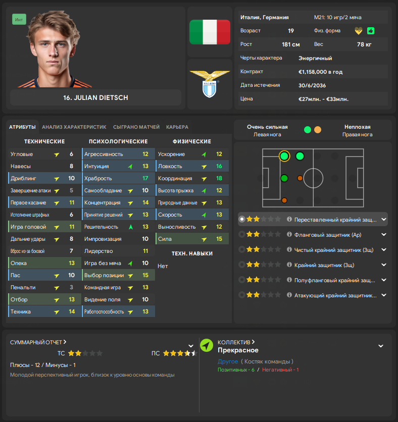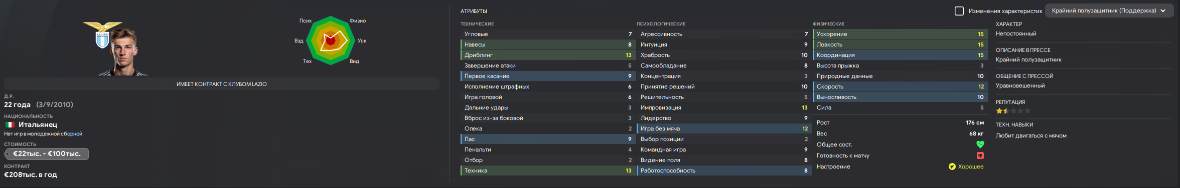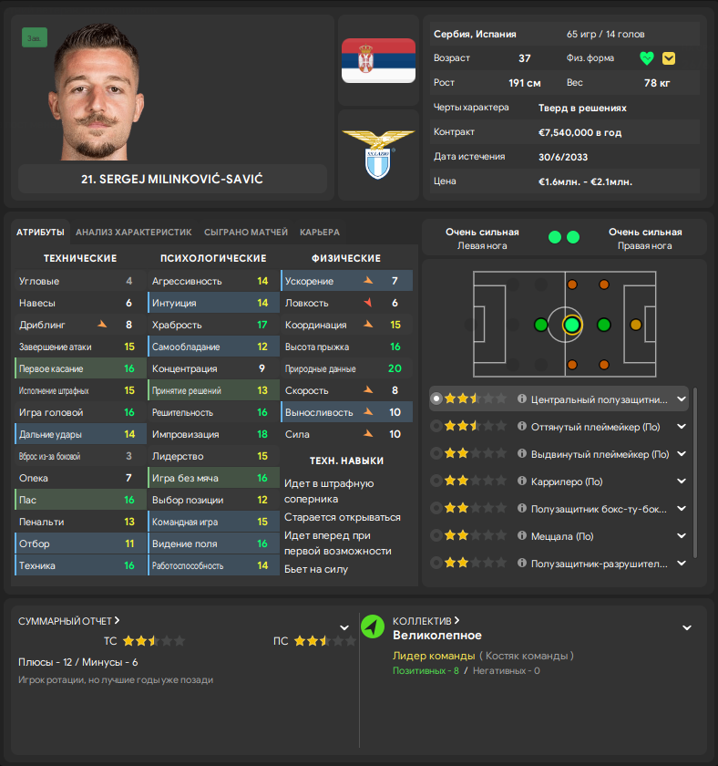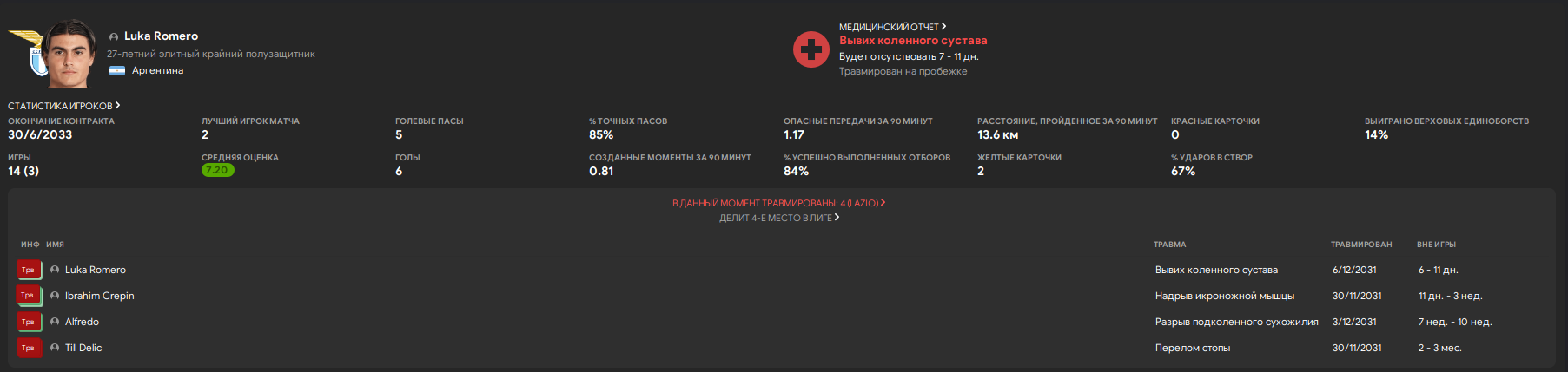 продолжаю верховодить в Лацио без контракта на руках ))))) как такое возможно - хз. по одному богу известным причинам я не прошел собеседование в Лудогорец))))) хотя и соглашался на зарплату в районе 300к в ГОД блять)))))) может оно и к лучшему. прокликал их состав и у меня душа к горлу подошла. 90% хламарей старше 30 + расовое разнообразие таково что кажется будто при комплектации состава предыдудщий физрук консультировался с sweet baby inc. тут тебе и турки, и австралийцы, и лебедь, и рак и щука. попутно сразу три опорника смазывают лыжи. один едва отбегав два сезона возвращается в реал в котором полировал банку -надцать лет. второй для нас вообще "сердце и диспетчер", но по характеру к сожалению наёмник и проститутка. а третий просто старый конь с истёкшим контрактом и при подписании нового требующий место в старте. по факту есть один опорник 30+, способный тянуть уровень основы еще 2-3 сезона. в идеале хочется иметь четверых. на усиление есть 65 миллионов. в закромах молодежки нашелся Буратино которым хотя бы временно можно заткнуть дырку пик 1 и на рассмотрении два варианта с рынка пики 2 и 3. предпочтительнее кончено аргентинец. параллельно жду приглашения куда-нибудь, хотя на рынке вакансии ничего привлекательного нет совсем
