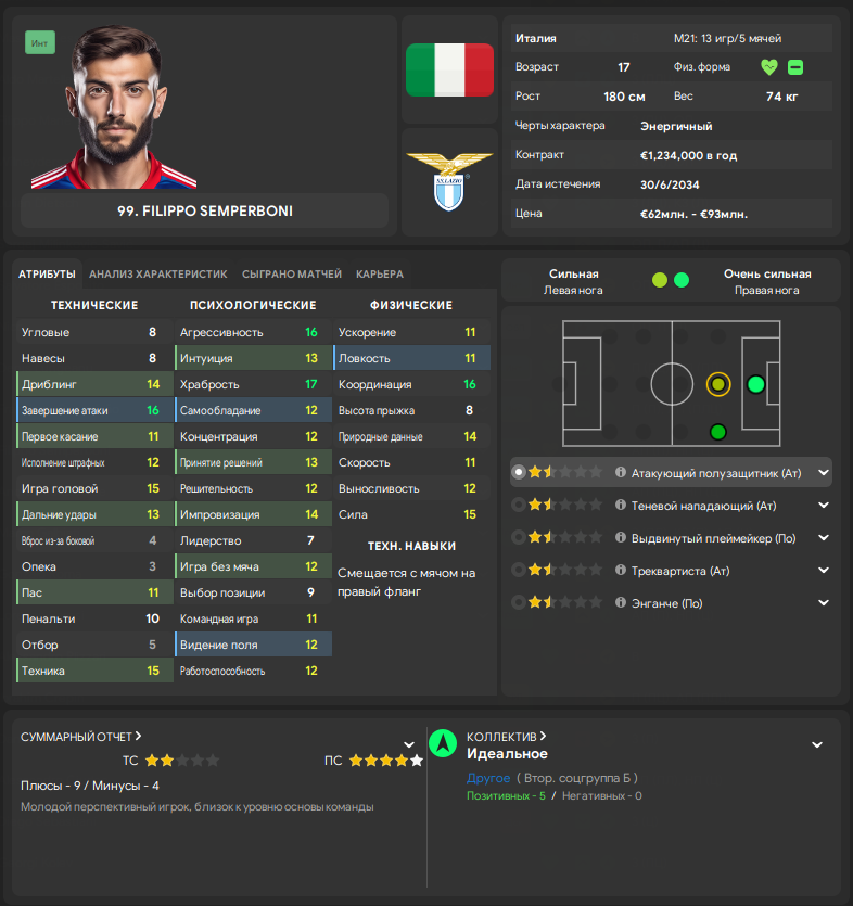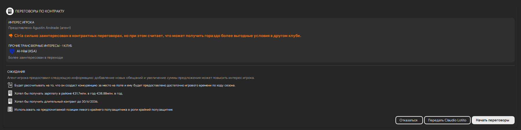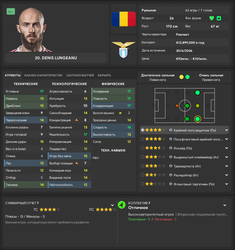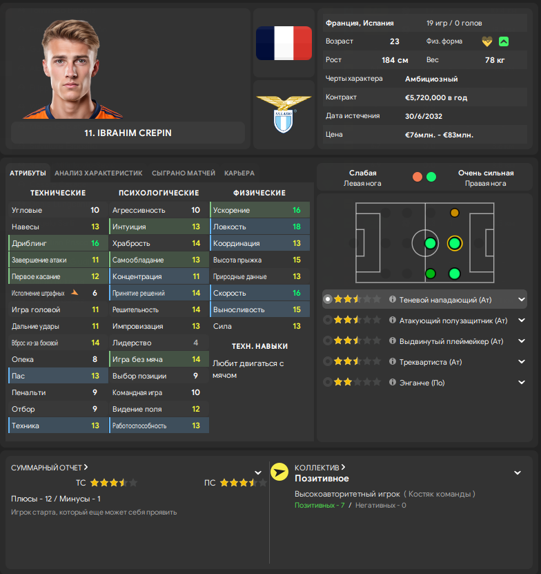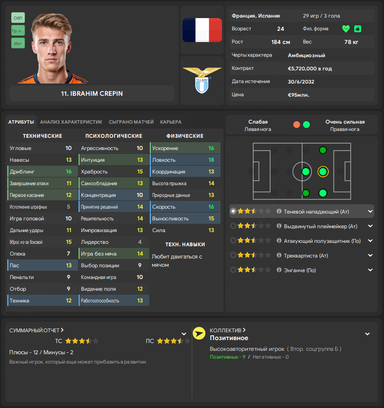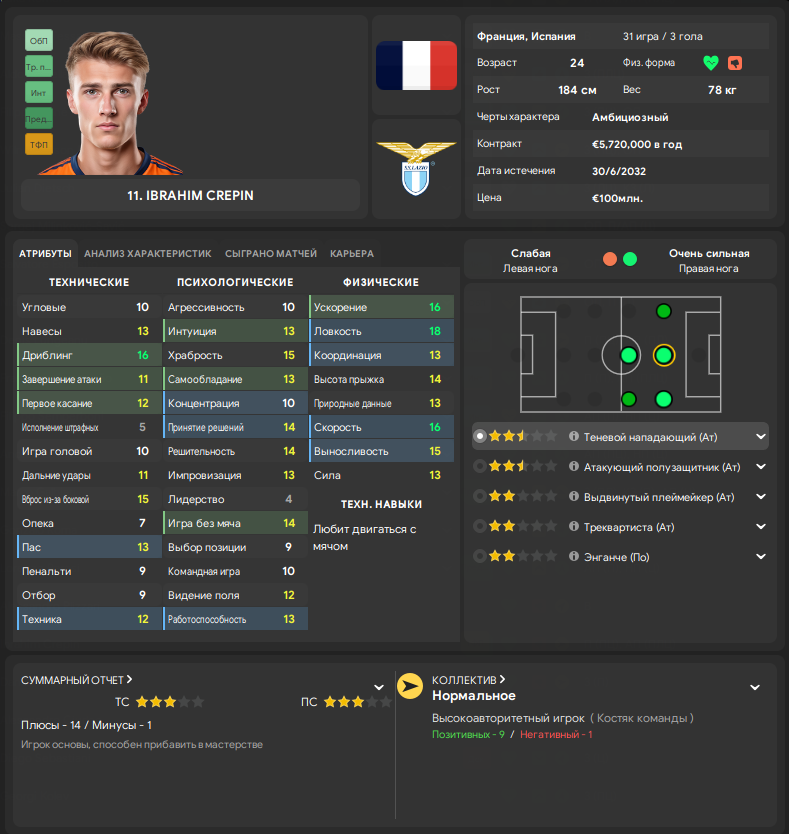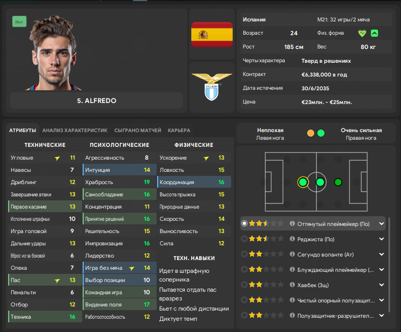 продолжаю верховодить в Лацио без контракта на руках ))))) как такое возможно - хз. по одному богу известным причинам я не прошел собеседование в Лудогорец))))) хотя и соглашался на зарплату в районе 300к в ГОД блять)))))) может оно и к лучшему. прокликал их состав и у меня душа к горлу подошла. 90% хламарей старше 30 + расовое разнообразие таково что кажется будто при комплектации состава предыдудщий физрук консультировался с sweet baby inc. тут тебе и турки, и австралийцы, и лебедь, и рак и щука. попутно сразу три опорника смазывают лыжи. один едва отбегав два сезона возвращается в реал в котором полировал банку -надцать лет. второй для нас вообще "сердце и диспетчер", но по характеру к сожалению наёмник и проститутка. а третий просто старый конь с истёкшим контрактом и при подписании нового требующий место в старте. по факту есть один опорник 30+, способный тянуть уровень основы еще 2-3 сезона. в идеале хочется иметь четверых. на усиление есть 65 миллионов. в закромах молодежки нашелся Буратино которым хотя бы временно можно заткнуть дырку пик 1 и на рассмотрении два варианта с рынка пики 2 и 3. предпочтительнее кончено аргентинец. параллельно жду приглашения куда-нибудь, хотя на рынке вакансии ничего привлекательного нет совсем