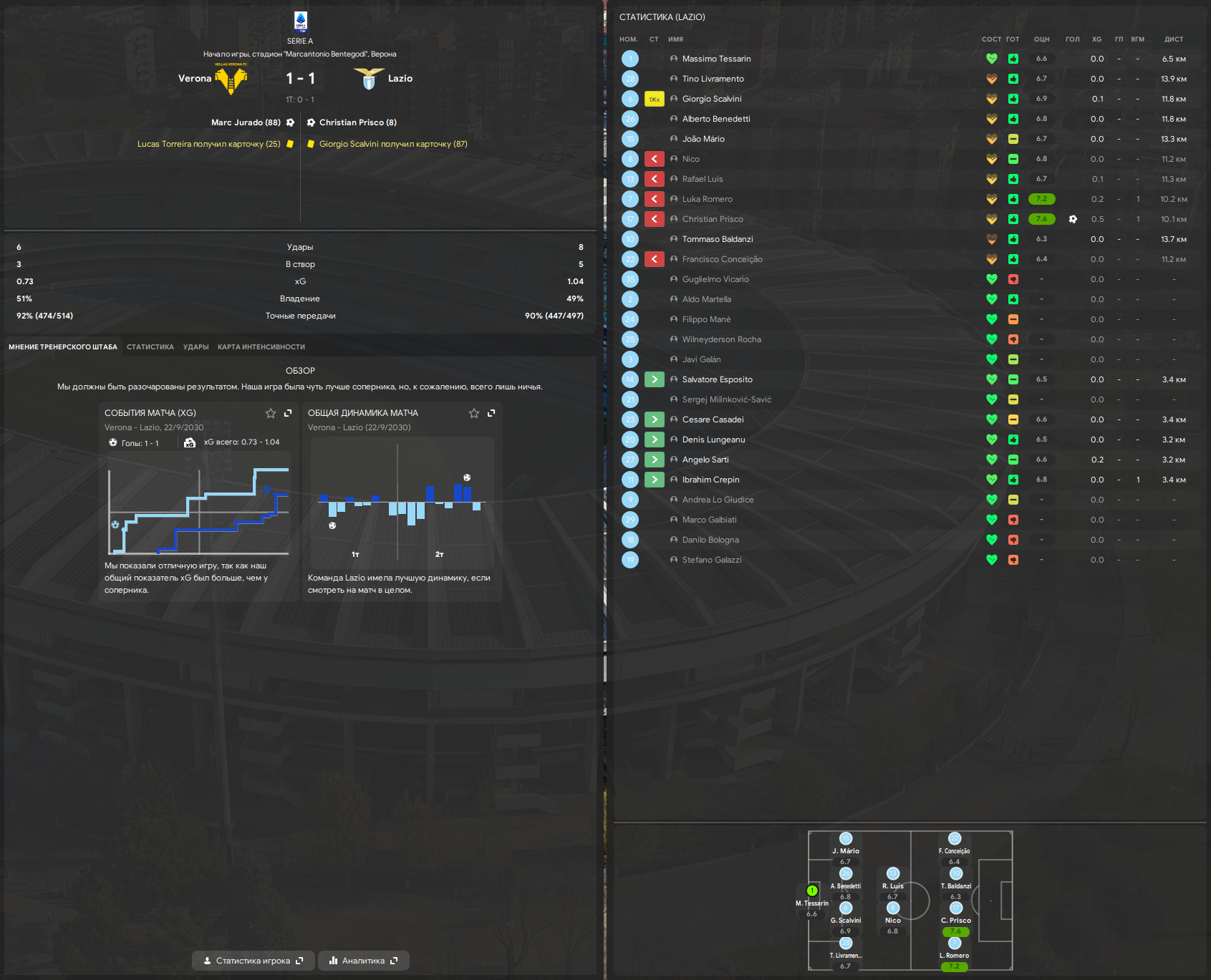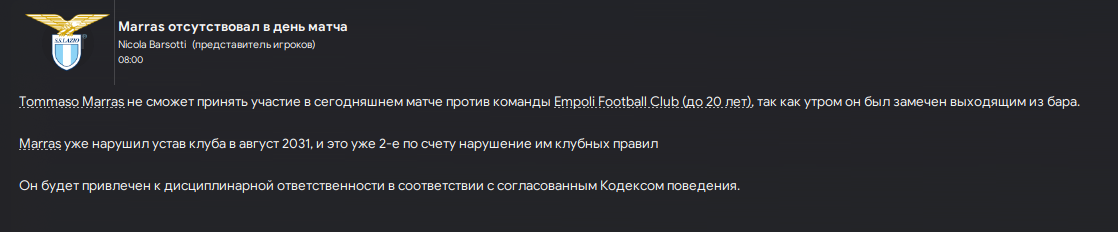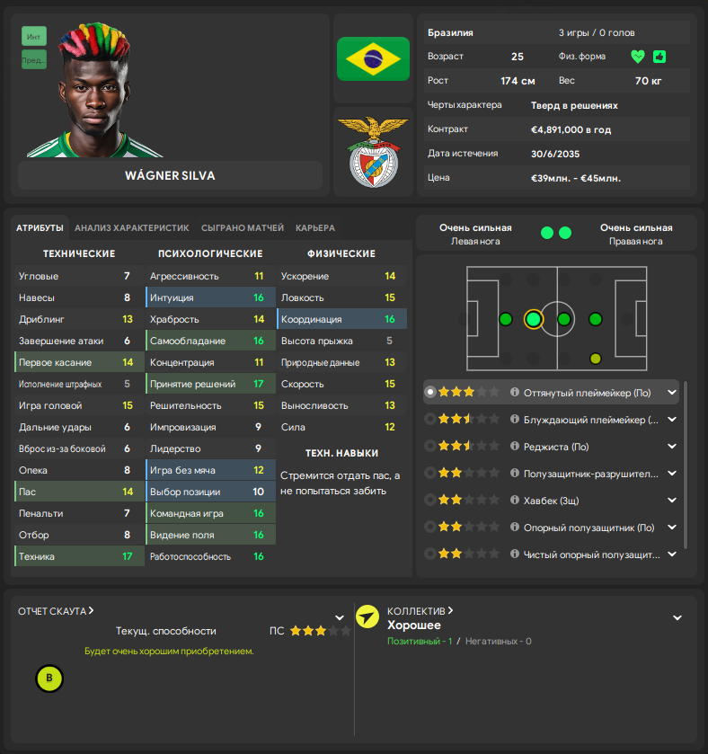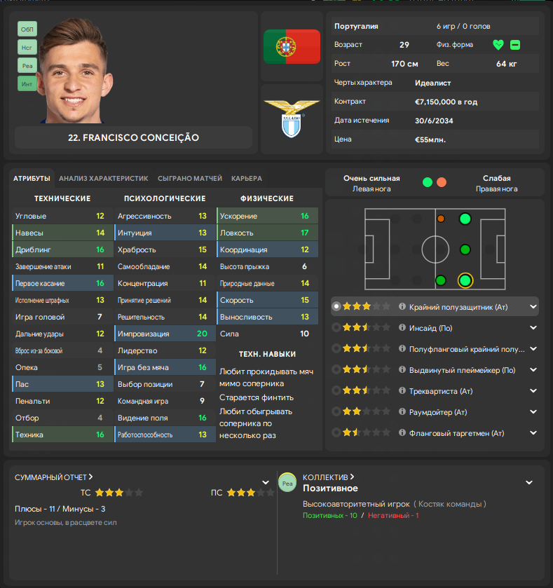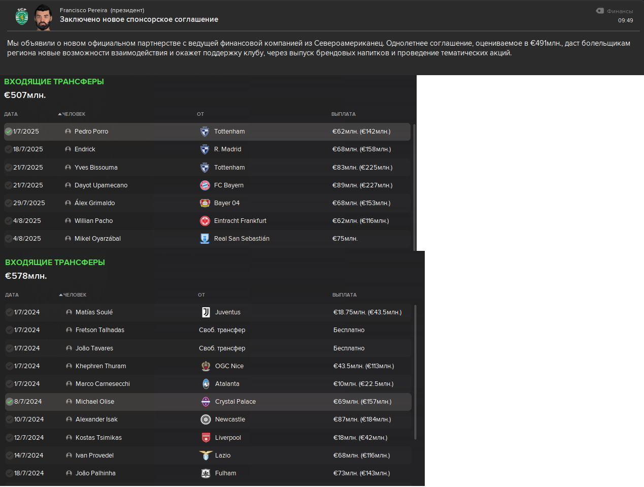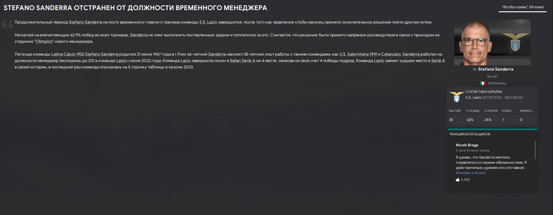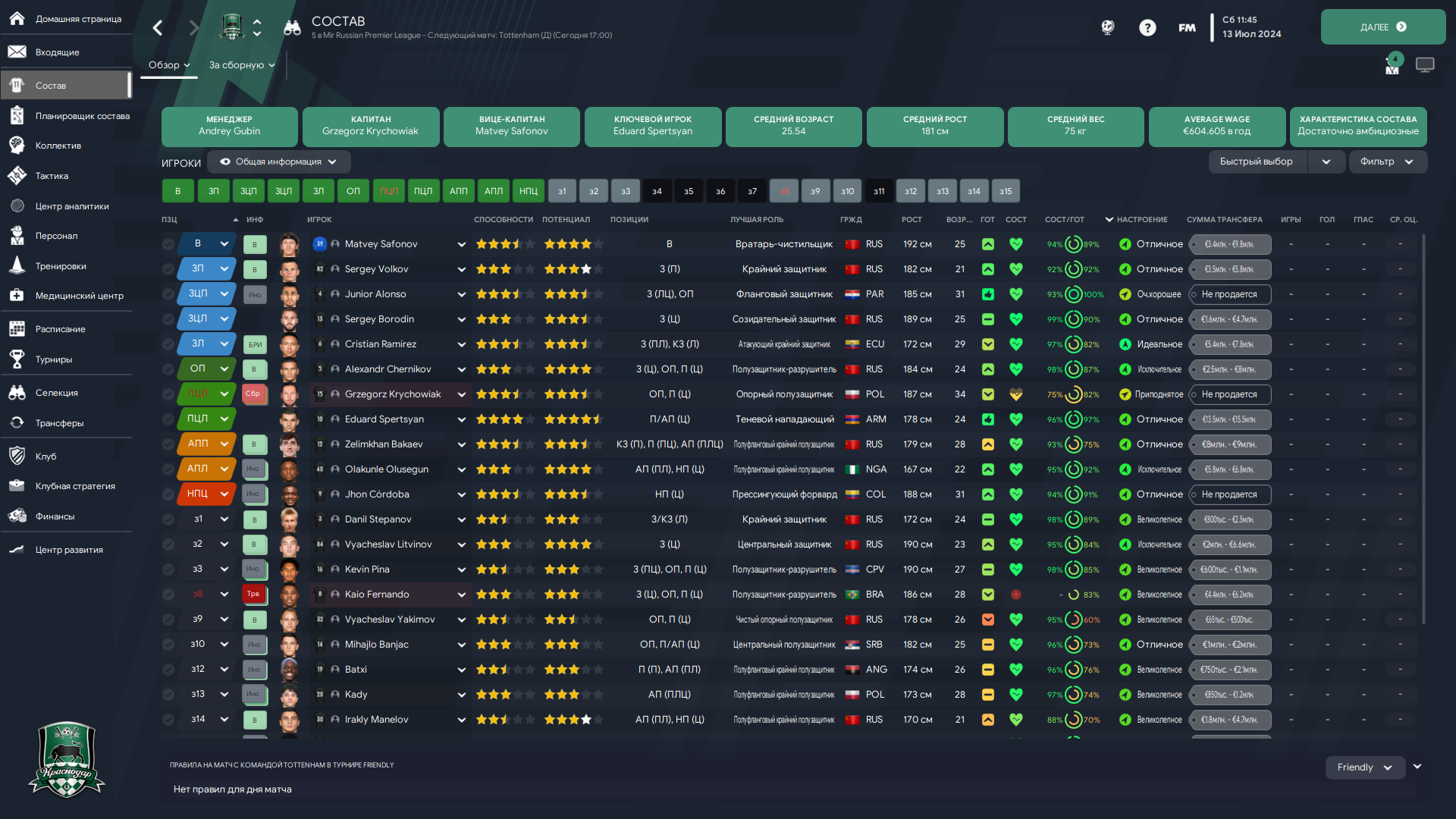 продолжаю верховодить в Лацио без контракта на руках ))))) как такое возможно - хз. по одному богу известным причинам я не прошел собеседование в Лудогорец))))) хотя и соглашался на зарплату в районе 300к в ГОД блять)))))) может оно и к лучшему. прокликал их состав и у меня душа к горлу подошла. 90% хламарей старше 30 + расовое разнообразие таково что кажется будто при комплектации состава предыдудщий физрук консультировался с sweet baby inc. тут тебе и турки, и австралийцы, и лебедь, и рак и щука. попутно сразу три опорника смазывают лыжи. один едва отбегав два сезона возвращается в реал в котором полировал банку -надцать лет. второй для нас вообще "сердце и диспетчер", но по характеру к сожалению наёмник и проститутка. а третий просто старый конь с истёкшим контрактом и при подписании нового требующий место в старте. по факту есть один опорник 30+, способный тянуть уровень основы еще 2-3 сезона. в идеале хочется иметь четверых. на усиление есть 65 миллионов. в закромах молодежки нашелся Буратино которым хотя бы временно можно заткнуть дырку пик 1 и на рассмотрении два варианта с рынка пики 2 и 3. предпочтительнее кончено аргентинец. параллельно жду приглашения куда-нибудь, хотя на рынке вакансии ничего привлекательного нет совсем