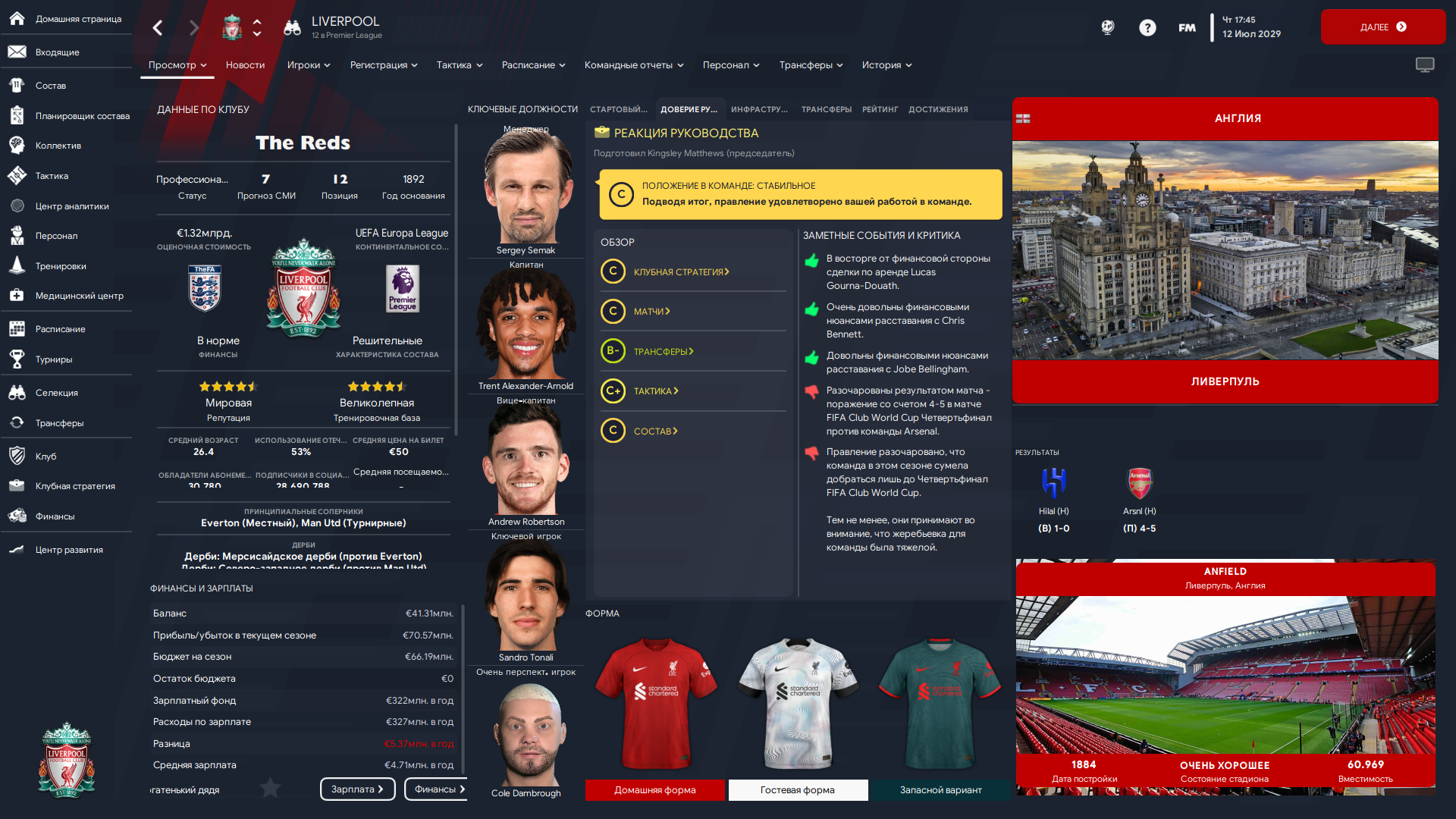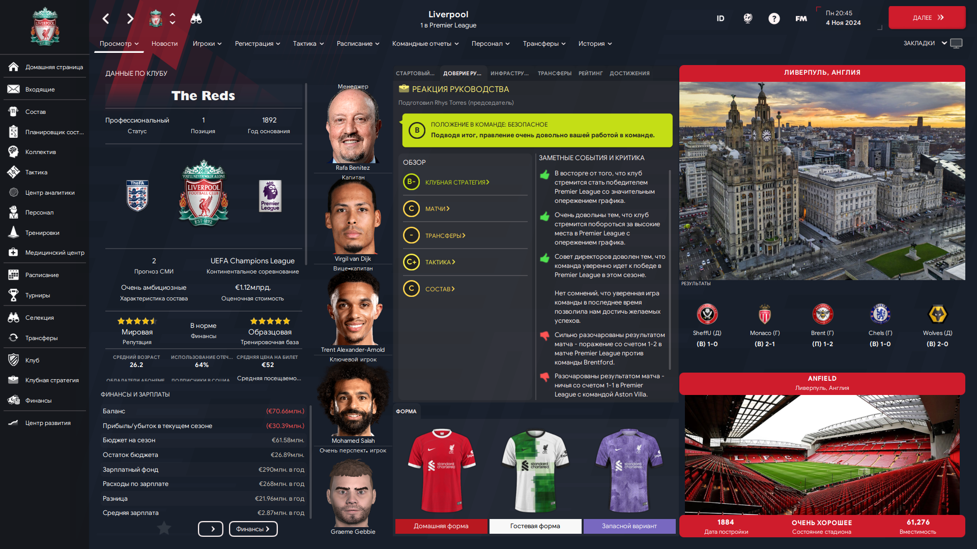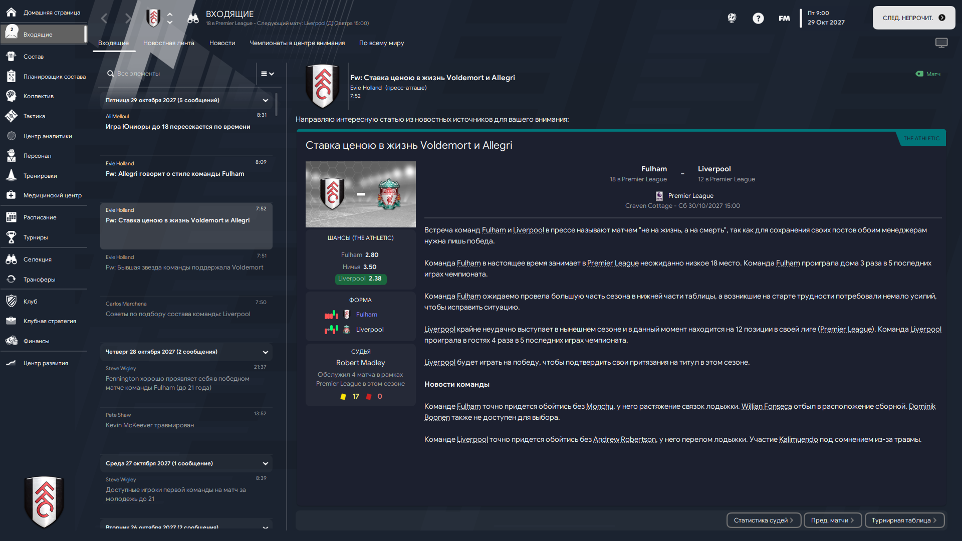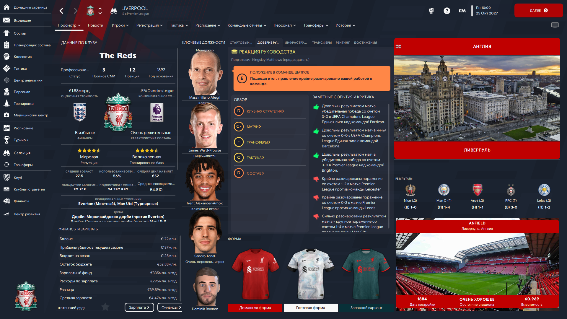 >>3341148 у меня был положительный баланс в районе 10-15 миллионов к середине сезона и полностью укомплектованный состав. в лазарете валялся какой-то лавочник-хламарь который вообще никак не влиял на игру. так вот одним погожим зимним утром на электронку приходит письмо в духе "Правление берет кредит для того чтобы мы могли уверенно побороться за награды в этом году". чтобы ты понимал, к тому моменту я шел в чемпионате на первом месте с 17-очковым отрывом от 2-го места, обеспечил себе место в весенней стадии ЛЧ и в кубке тоже был в 1/4. куда еще увереннее? размер кредита был что-то типа 70 000 000 евро. и теперь у меня каждый месяц откусывают от баланса по 600к в пользу уплаты. в разделе финансы вообще висит "ИПОТЕЧНЫЙ КРЕДИТ". какой нах ипотечный кредит????? а в прессе то и дело появляются сообщения о продаже клуба вместе с ДОЛГАМИ. хотя у меня даже сейчас на балансе в районе 150 миллионов евро