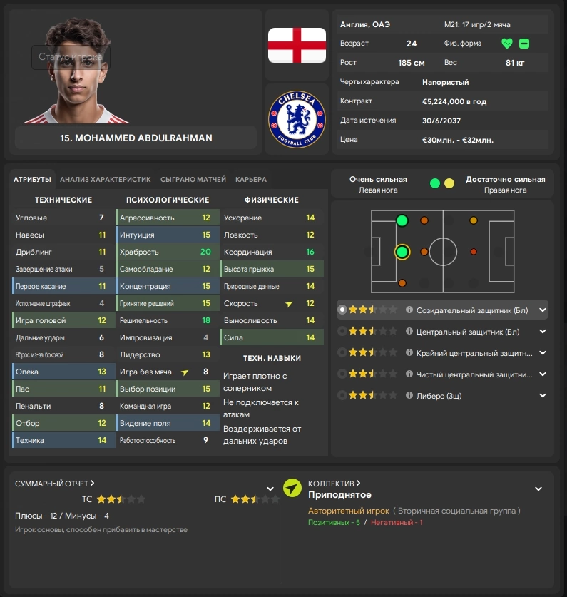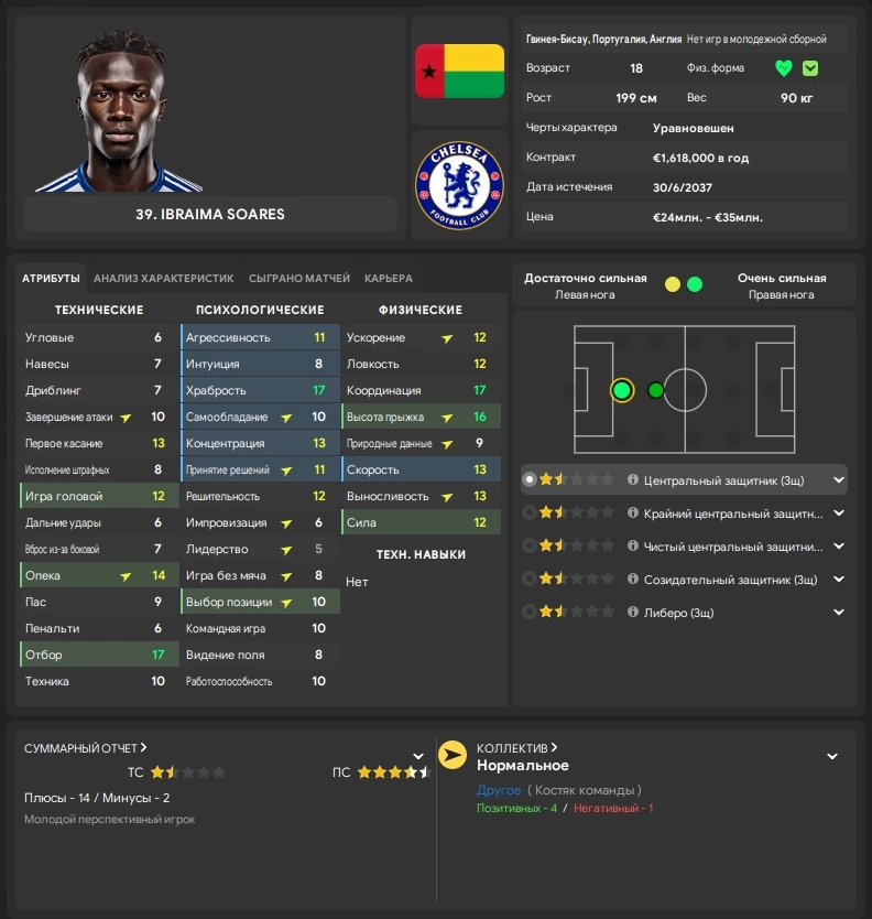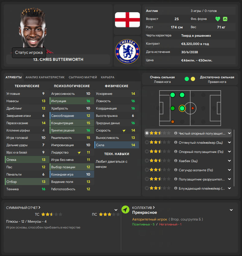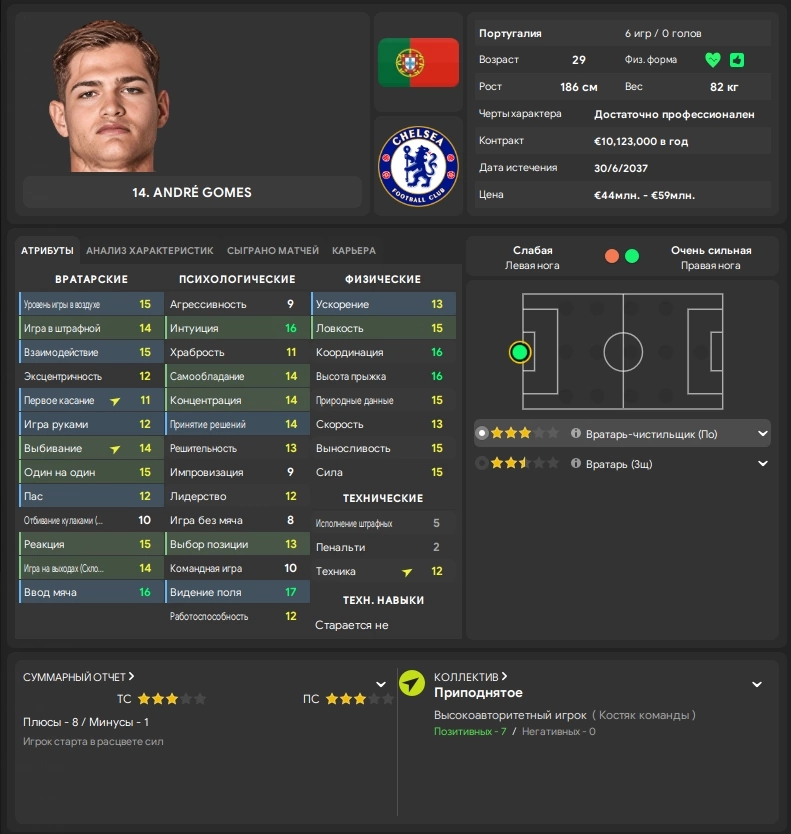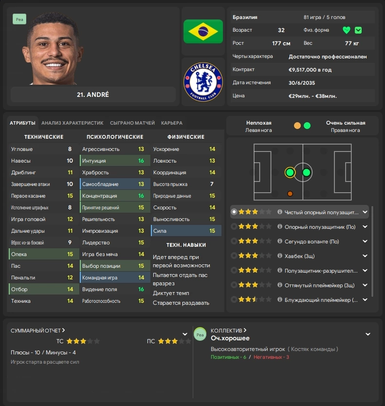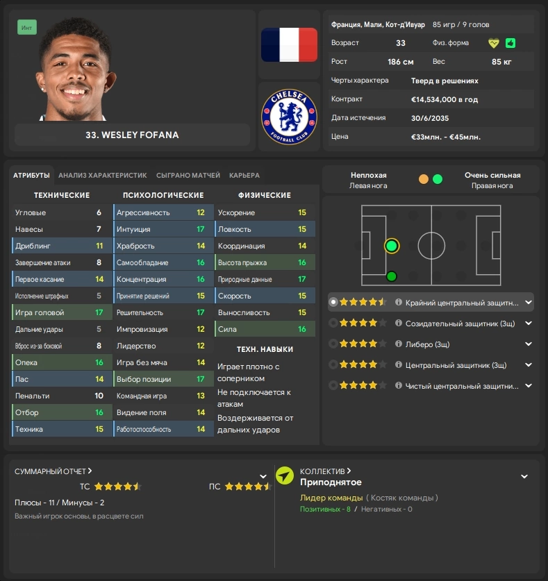 пик 1 смешно, но вот этот Аладдин наш основной левый фланговый защитник. почему так? да хуй его знает. кроме него нет никого вообще. если вдруг сломают, придется перходить на схему с тремя центральными. поэтому вставляем палец в жопу (на удачу) и молимся, чтобы этот чумазенький не траванулся кебабом или не подорвал себя поясом шахида в лондоском метро пик 2 старый знакомый. два сезона побегал у меня в лацио. был молодцом. забивал, отдавал, не ломался. ушел в Челси за хороший прайс сейчас в принципе продолжает строить игру. если поддавшись моде не убежит к шейхам, доведу его до почетного выхода на пенсию пик 3 в представлении не нуждается. человек в честь которого организуются товарищеские матчи. в мою короткую бытность тренером - лучший бомбардир команды. один из китов на которых держится Челси и просто красава. спасибо что есть. пик 4 в футбольном смысле недееспособный пидорас с средней оценкой 6.2 в последних пяти играх. почему он продолжает выходить на поле и вообще числится в списках клуба? у него есть скиллы и я почему-то верю в то что он когда-нибудь внесёт импакт. пока что просто мертвая душа. просто есть чтобы был. если защитники соперника отвлекаются на него и стягиваются, то хотя бы за это ему спасибо. стоят ли его услуги 5 с гаком миллионов в год? да ну нахуй. будет с нами пока я не соберу костяк новой команды