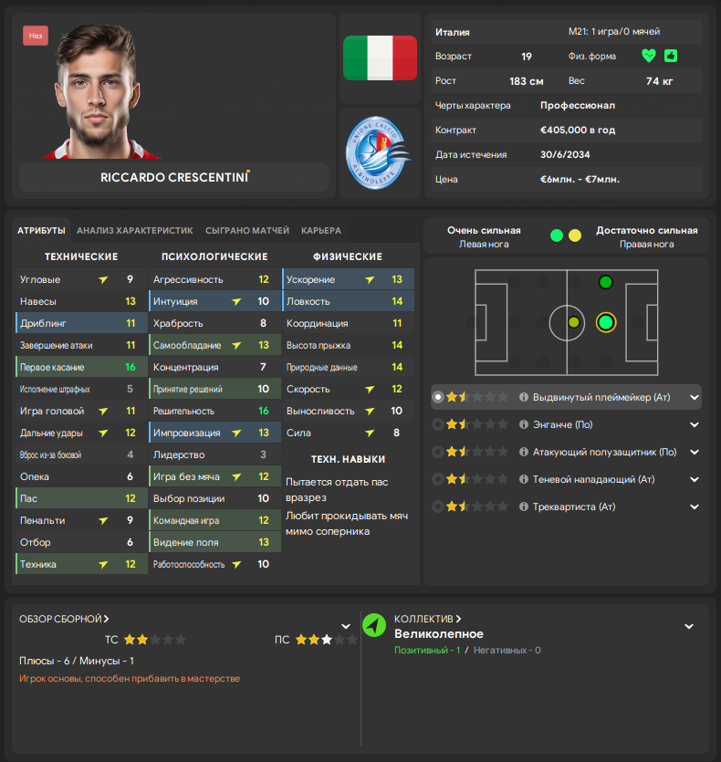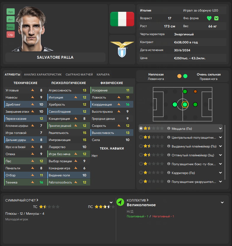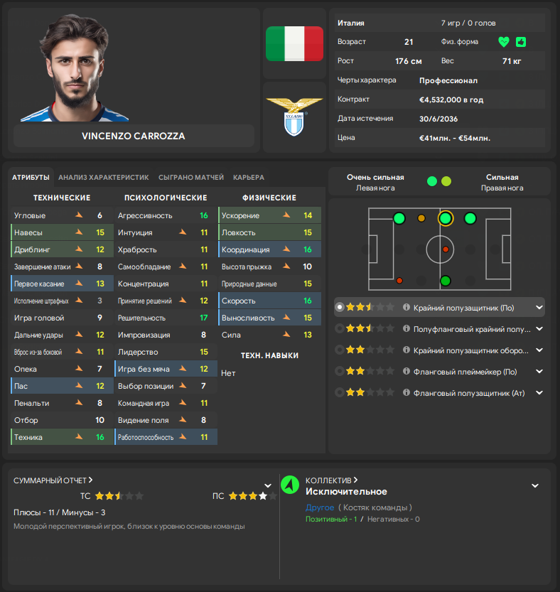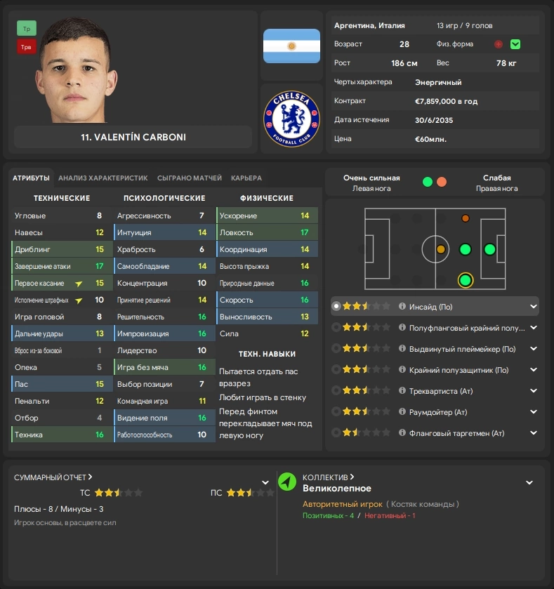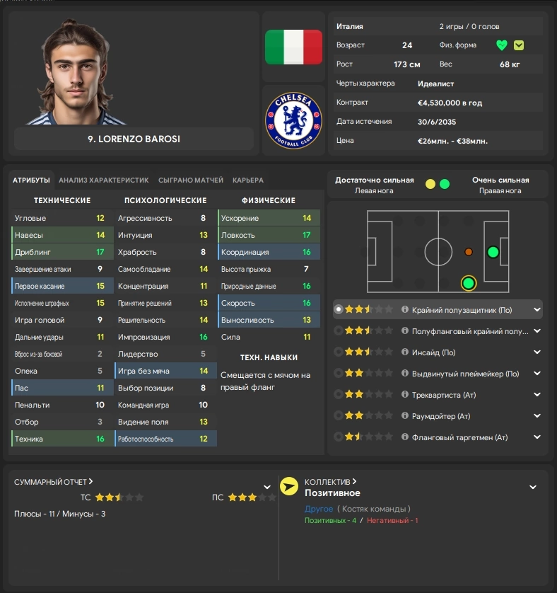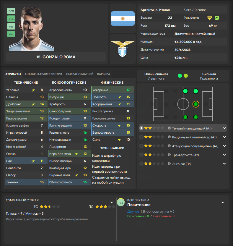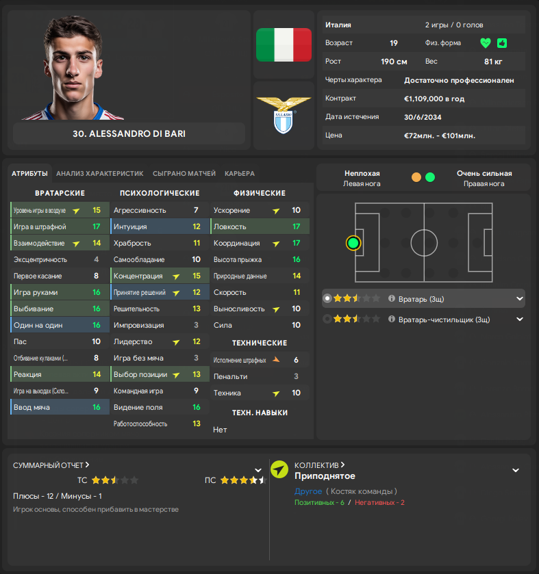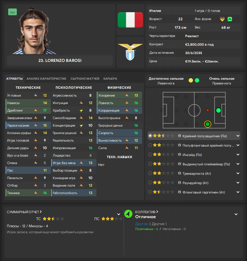 за этим пик 1 красавой каждое ТО выстраивается очередь из наивных европейских грандов. каждый офер - это смешные цифры в выплатах и куча статей с невыполнимыми бонусами. на что рассчитывают - неизвестно. по скиллам не самый сильный в составе, фактически выходит с банки или в основе против мусора. по ощущениям - сильнейший игрок в команде. каждый матч - бенефис. не уходит без голевого действия. видимо таит обиду и посему отказывается подмахнуть улучшенный контракт. ближе к экватору сезона буду пытаться слить хотя бы за сотку. пик 2 перекочевал из Арсенала за 11 млн. сразу согласился на роль резервиста. по скиллам вроде не вау, но хуярит с обеих ног + закрывает каждую позицию в нападении на уровне прирожденный/уверенный. для ротации годится. тоже кстати имеет двойное гражданство аргентина/италия. Барози был выписан из Милана за 25 млн не потому что был нужен, а просто чтобы насрать Милану. судя по отчету скаута он часто выходил и вносил импакт. 20+ матчей в старте, средняя оценка 7.01. от нас наверное будет кататься по арендам т.к. острой нужды в нем нет. ну и результаты текущего сезона