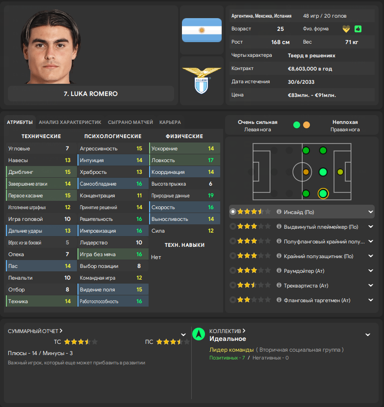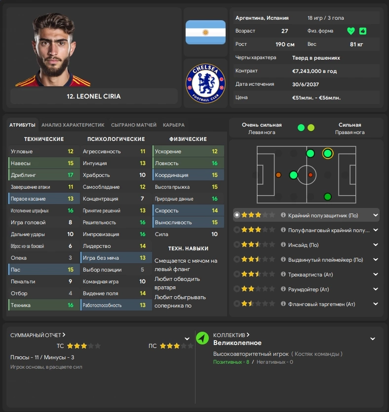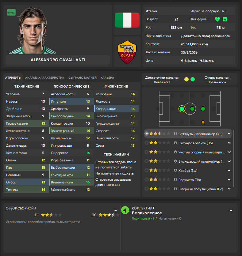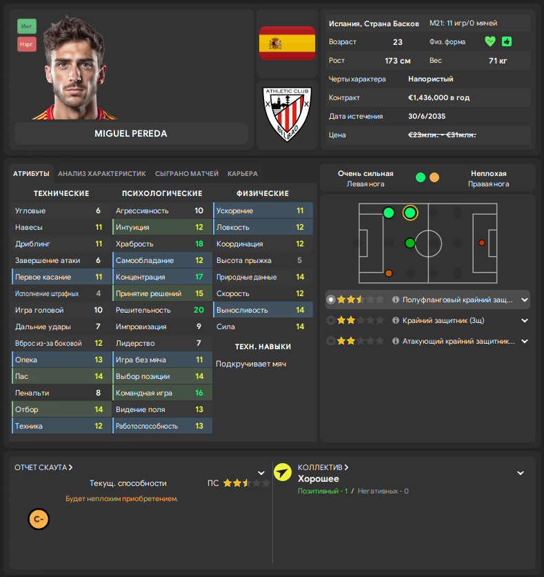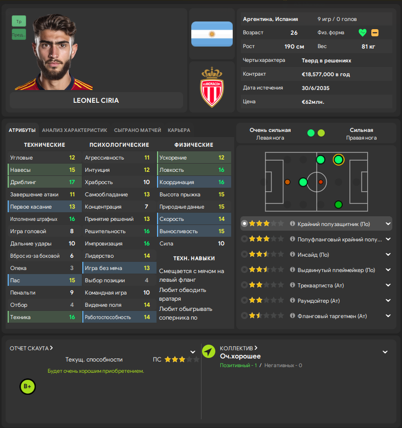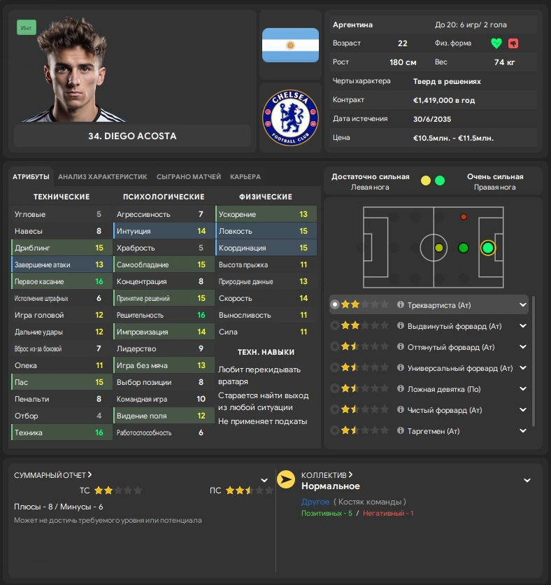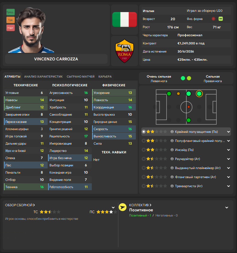 за этим пик 1 красавой каждое ТО выстраивается очередь из наивных европейских грандов. каждый офер - это смешные цифры в выплатах и куча статей с невыполнимыми бонусами. на что рассчитывают - неизвестно. по скиллам не самый сильный в составе, фактически выходит с банки или в основе против мусора. по ощущениям - сильнейший игрок в команде. каждый матч - бенефис. не уходит без голевого действия. видимо таит обиду и посему отказывается подмахнуть улучшенный контракт. ближе к экватору сезона буду пытаться слить хотя бы за сотку. пик 2 перекочевал из Арсенала за 11 млн. сразу согласился на роль резервиста. по скиллам вроде не вау, но хуярит с обеих ног + закрывает каждую позицию в нападении на уровне прирожденный/уверенный. для ротации годится. тоже кстати имеет двойное гражданство аргентина/италия. Барози был выписан из Милана за 25 млн не потому что был нужен, а просто чтобы насрать Милану. судя по отчету скаута он часто выходил и вносил импакт. 20+ матчей в старте, средняя оценка 7.01. от нас наверное будет кататься по арендам т.к. острой нужды в нем нет. ну и результаты текущего сезона