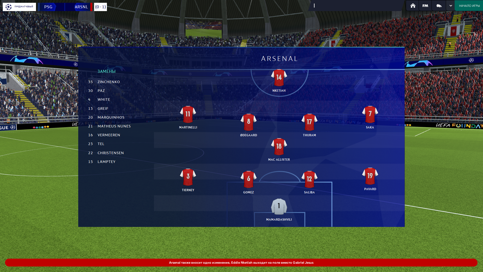 Идём все в атаку, теряем важнейшего игрока полузащиты, благо я сохранил одну замену и мы не остались в меньшинстве.