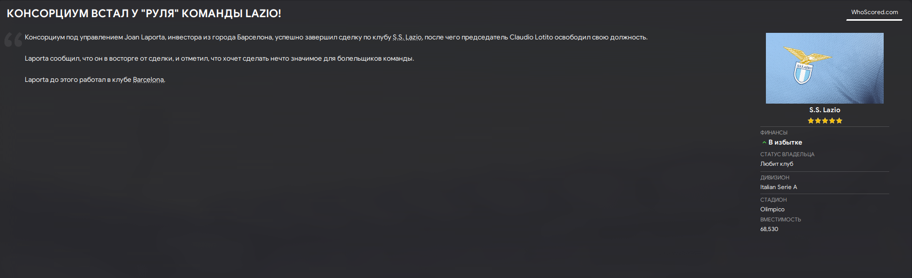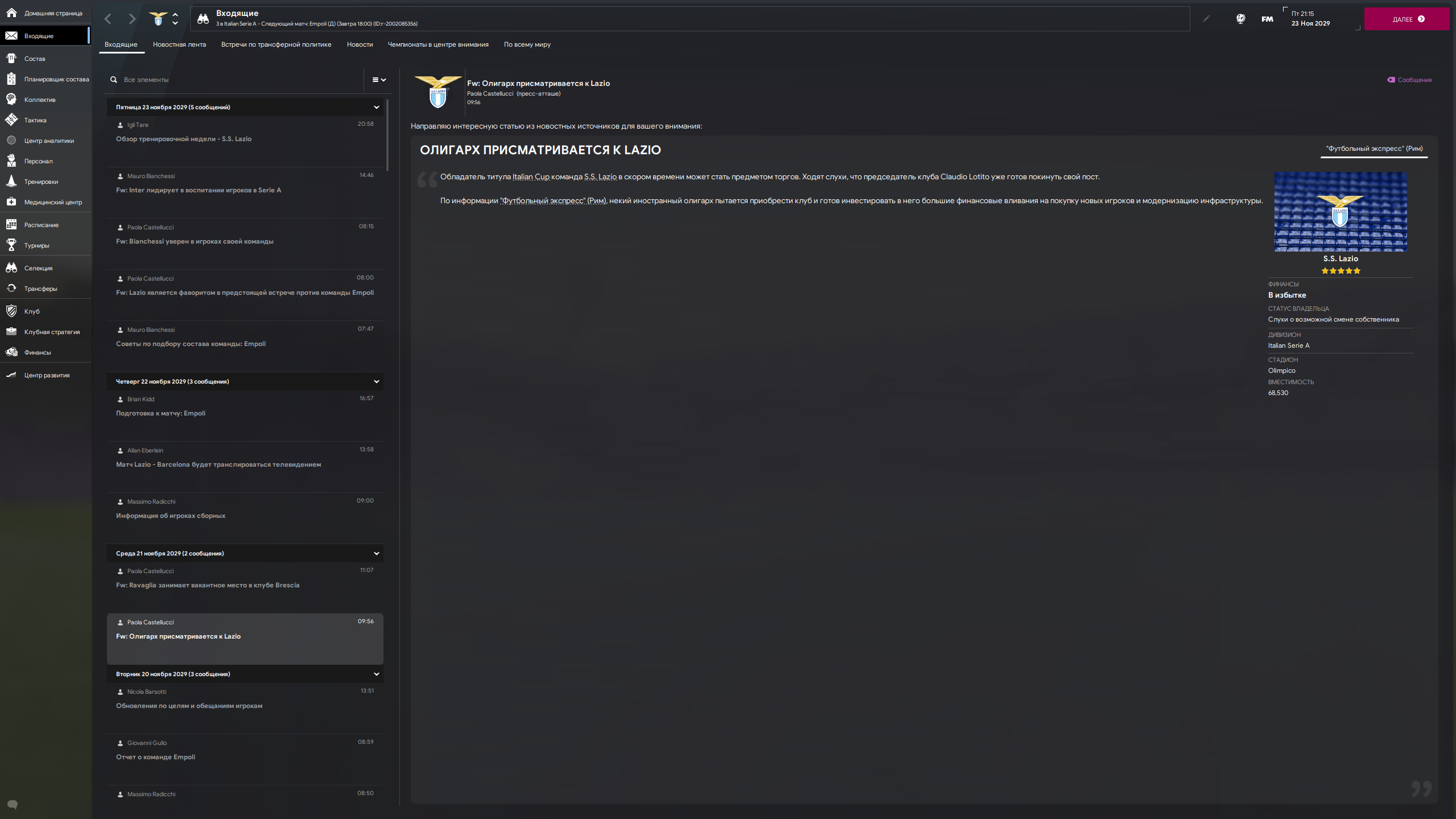 несмотря на 4-ую победу в ЛЧ, Лапорта уволил временного менеджера Лацио, за то что команде заняла лишь 5-ое место в регулярке. худший результат со времён 23-го года, когда был уволен мой предшественник. на место и.о., на постоянной основе пригласили Артету. подбор игроков у римлян сейчас ебейший. лучший форвард сейва, лучший ЦЗ сейва, да и просто большинство игроков стоят от 150 до 200+ миллионов. у нас же пока в краткосрочных целях кровь из носа подписать защитника универсала, чтобы закрывал оба фланга, умел навешивать, обводить и обороняться. ведём переговоры по воспитаннику Барсы, который может быть и имеет не самые выдающиеся скиллы, но по крайней мере позволяет уложиться в бюджет и подписать кого-нибудь ещё. помимо защитника так же остро необходим опорник. пока в Роме не одумались и ценник сильно ниже, забираем Боччи за 20 миллионов. если кто-нибудь и придёт еще, то только за счет трансферов на выход.