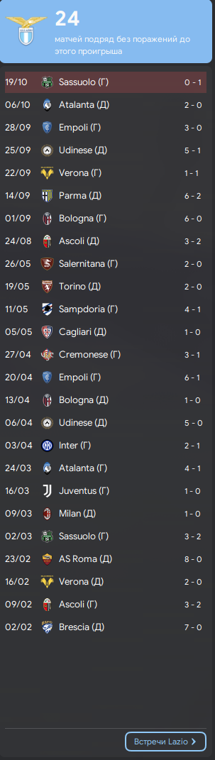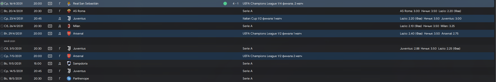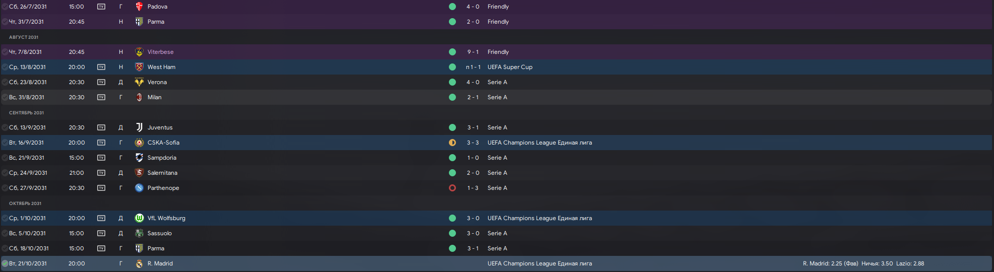 закрываем сезон второй к ряду победой в ЛЧ и третьей подряд в серии А. из кубка на стадии 1/4 отлетели от Интера, суперкубок слит Милану. не жалко, пускай несчастные хоть какие-то чашки пощупают. в итоговом протоколе сериала фиксируем 35-2-1, однажды споткнувшись об Наполи как всегда ёпта. там уже играть некому, а все равно поперёк горла встают и скатав ничейки с Интером и Удинезе. в ЛЧ на стадии 1/8 был на волоске от вылета, когда въебал первый матч 2-0 ПСЖ. перед ответкой швырнул бытулку в лоснящееся ебало Милинковича-Савича и остальные кабаны охуев от таких мер запорхали что пчёлки в период роения, натолкав в очко Доннаруммы три безответных мяча. дальше Барса, Арсенал и Реал в финале на сладенькое. свой первый финал ЛЧ я въебал именно Реалу. свою первую победу в ЛЧ отпраздновал тоже против Реала. Милинкович-Савич после 17 лет в клубе и бутылки в ебало, решил что с него хватит. подмахнул контракт на должность тренера по физподготовке в U-18 и теперь уже сам посредством бутылки в ебало будет прививать чемпионский менталитет подрастающим поколениям. Консейсан объявил что достиг ВСЕГО и попросил отпустить его за новым вызовом. как раз нужно расчистить место под пребывающих новичков, скатертью дорожка. а еще в преддверии чемпионата Европы меня обвинли в предвзятом формировании состава сборной. типа из 23 кабанов - 11 это игроки Лацио. разве я виноват что лучшие представители нации воспитаны и собраны под знамёнами моей команды? предлагаете вызывать в сборную престарелое говно за которым по газону тянется песчаный шлейф? нет, спасибо. если честно очень хочется остаться и довести взращенное мной поколение до футбольной пенсии, но так как ебут они и встречного и поперечного, играется уже не так интересно. контракт отверг, посмотрим что будет дальше. в Сити освободилась должность, но это уже совсем бутылка. предпочтительные варианты Партизан/Рапид/Лудогорец. поглядим куда будут сватать