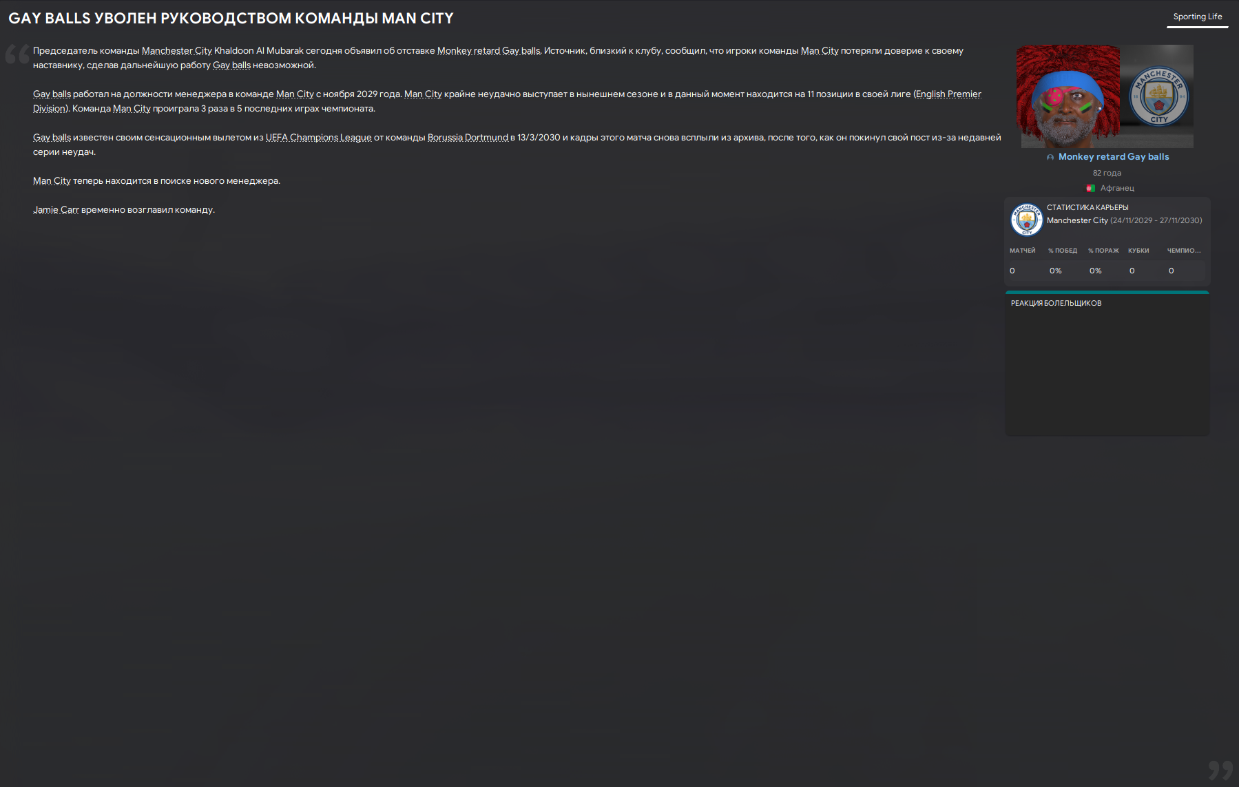 ситуация в Челси плачевная. с самого первого матча у руля и далее у меня в горле стоит вопль отчаяния. хочется просто весь клуб нахуй сравнять с землёй и начать с нуля. все-таки насколько бездарно бот рулит клубами. во-первых всем известный плотный график АПЕЛЕ, игры каждые два дня. 25 игроков в заявке на сезон. не новость конечно для меня, но это пиздец. первые результаты на скрине. в последний матч Фонсеки у руля Гвардиол вылетел сразу на 4 месяца и я принял команду без лучшего центрального защитника и с Рисом Джеймсом, который уже согласовал съёб в Аль-Итихад за 14 000 000)))))))) катастрофически нужно разгрузить зарплатную ведомость. сейчас убыток составляет 8 миллионов в год. великие вожди наподписывали паспортистов уебанов на огромные зарплаты. ни один из этих уебанов у меня в Лацио даже к банке не подошел бы на пушечный выстрел. короче, всех этих хламарей я заскринил. засим уёбываю на РАБоту. в течение, при наличии свободного времени, дозированно буду снабжать тредик отборными унтерменшами, которых по хорошему давно пора было переработать в метан в биореакторе. кому-то ситуация покажется не такой печальной, но так уже повелось, что у меня лютый триггер на престарелое говно, отбывающее номер. всегда ратовал за развитие молодых национальных игроков что ИРЛ, что в футсимах. а когда состав сплошь и рядом укомплектован интернациональным винегретом, меня не покидает ощущения, что передо мной не команда, а бродячий цирк из цыган, румын и прочей нечести.