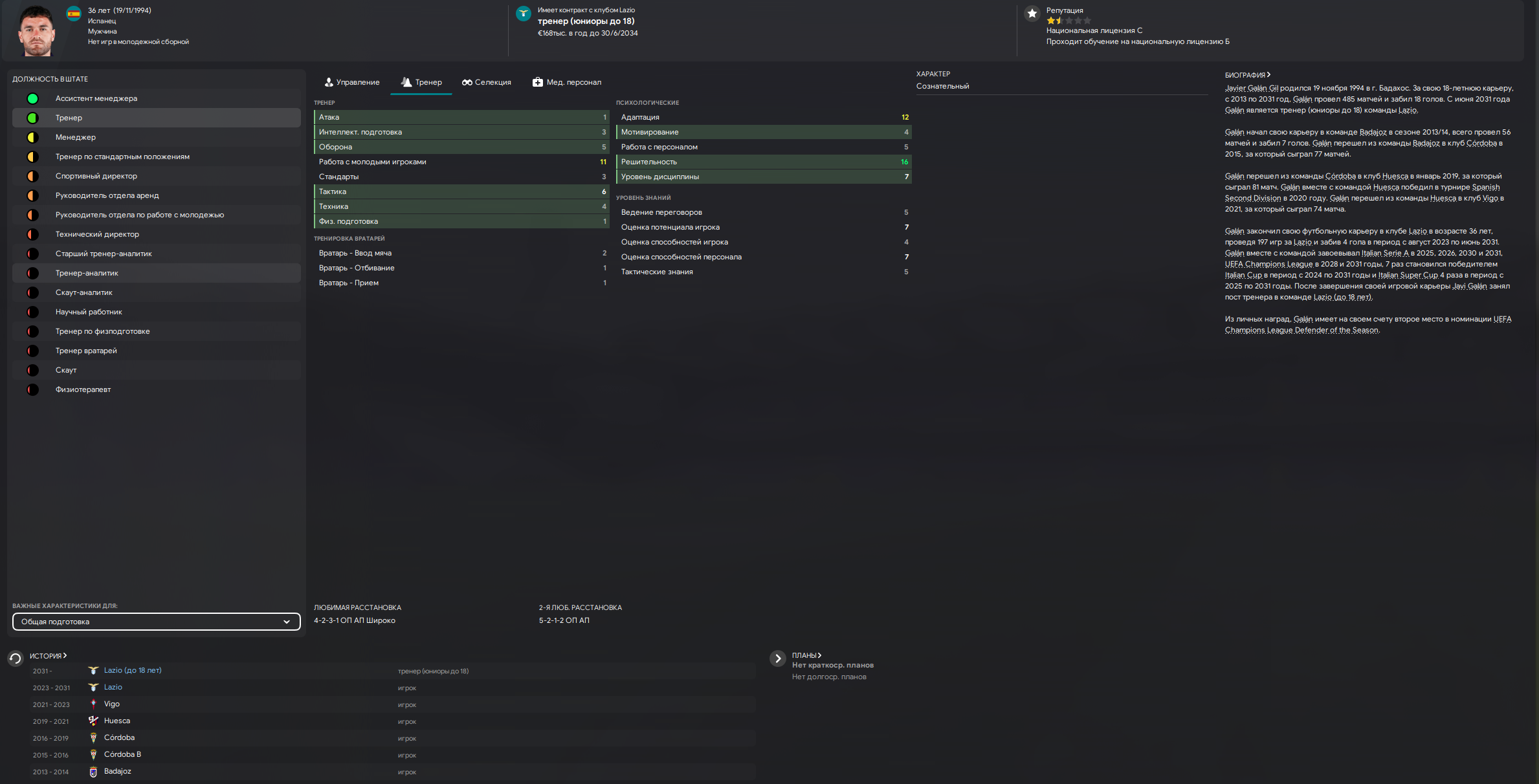 Я же решил перезапустить карьеру Виктора Забуксовалова, отключив один файл из мода на реализм - дополнительную сложность. Я убеждён, что из-за этого дерьма даже после финала кубка, после двух лицензий и с 20 процентами репутации даже в самое нищее дерьмо не берут, отказывают в курсах. Идёт оно нахуй. Сложность - не равно реализм, тупо дурка какая-то.