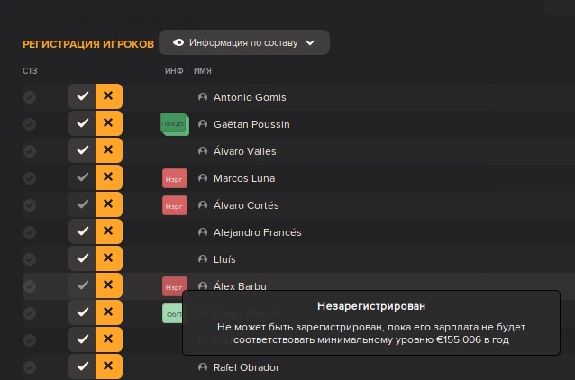 Что за фигня, почему не могу зарегистрировать игрока? Этот парень играл у меня в прошлом сезоне и всё было ОК, а теперь видите ли не могу. Почему? Остальные на скрине не регистрируются по той же причине. Какой нахуй минимальный уровень зарплаты, они сами настолько подписались, я то тут причём.