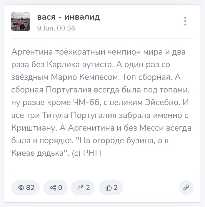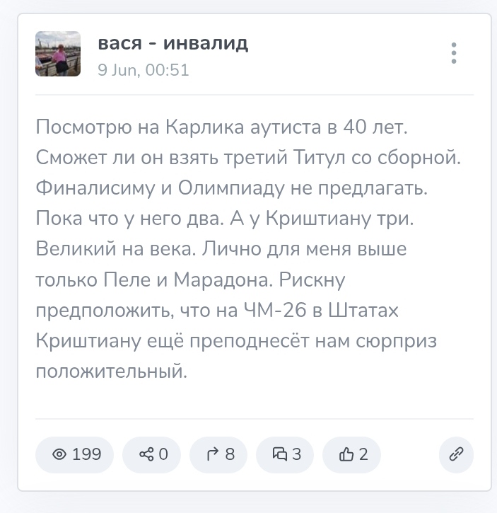 >>3377194 Будет примерно так: Роналду формляет дубль в ворота Германии, в финале забивает единственный гол и выигрывает лигу лиги наций в статусе лучшего бомбарбия кергуду. Месси жидко пернув понимает свою ущербность перед футбольным богом и завершает карьеру. Ебало школьников имагине?