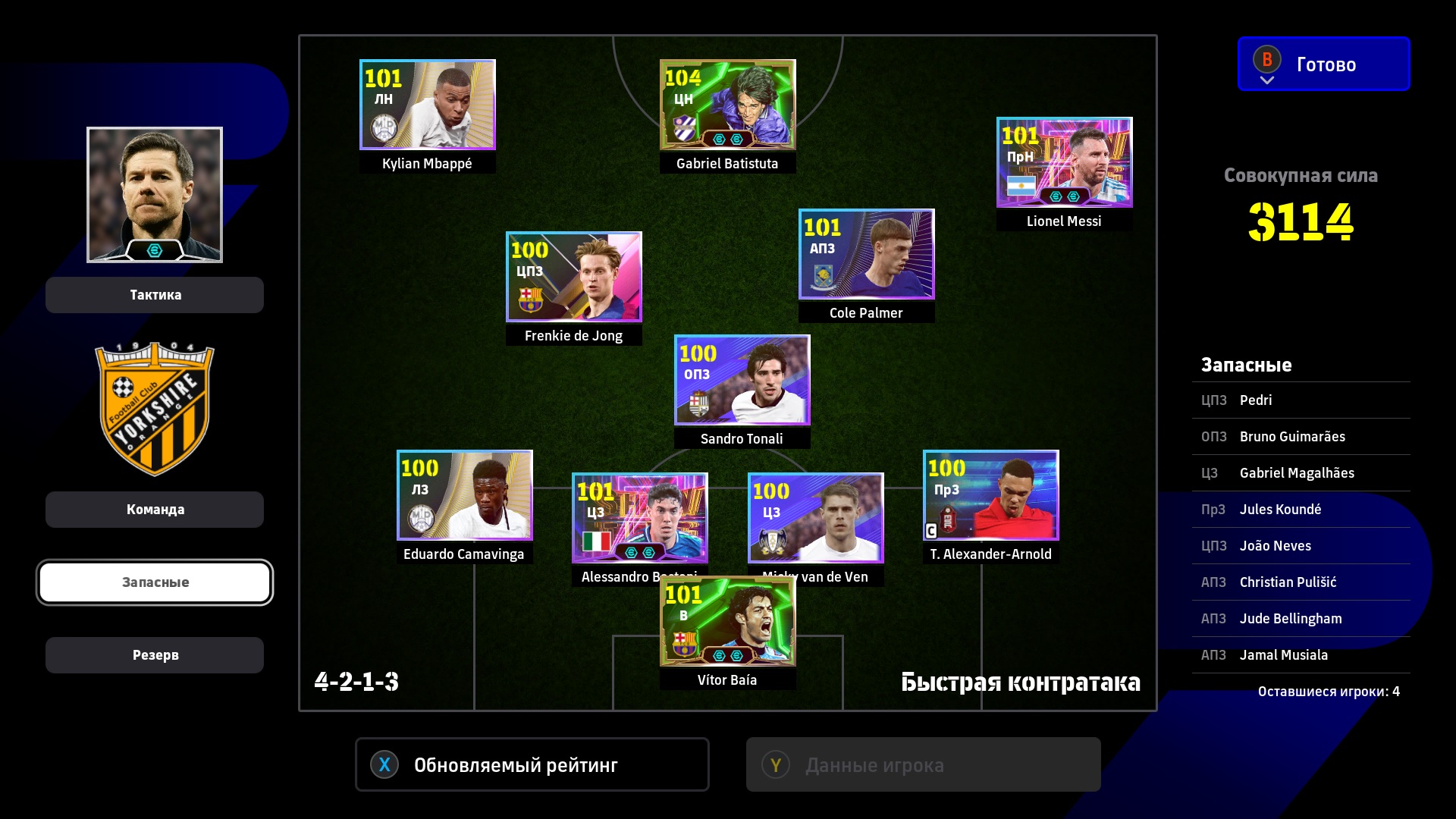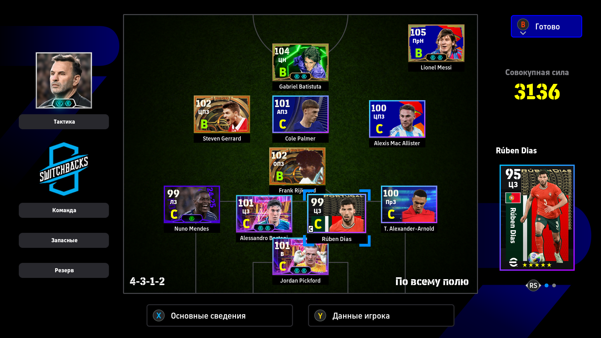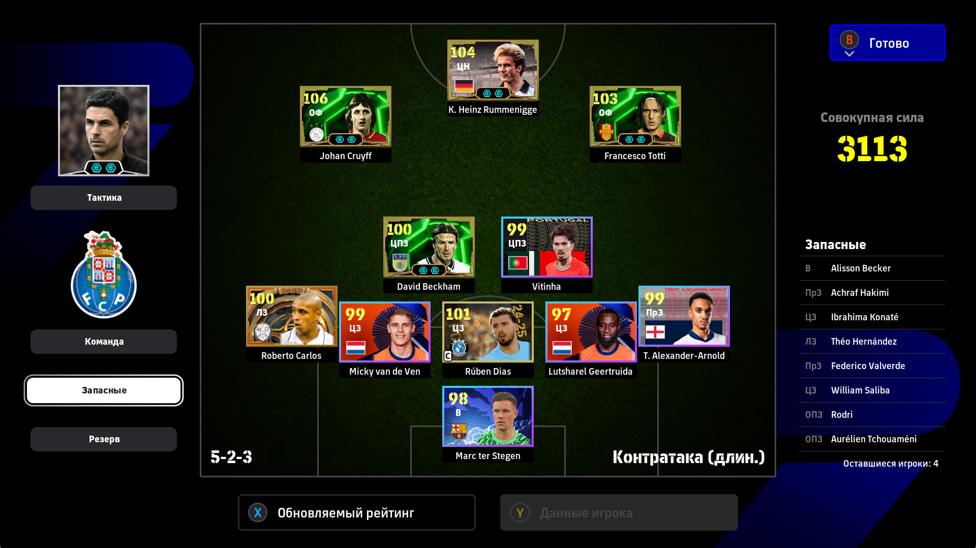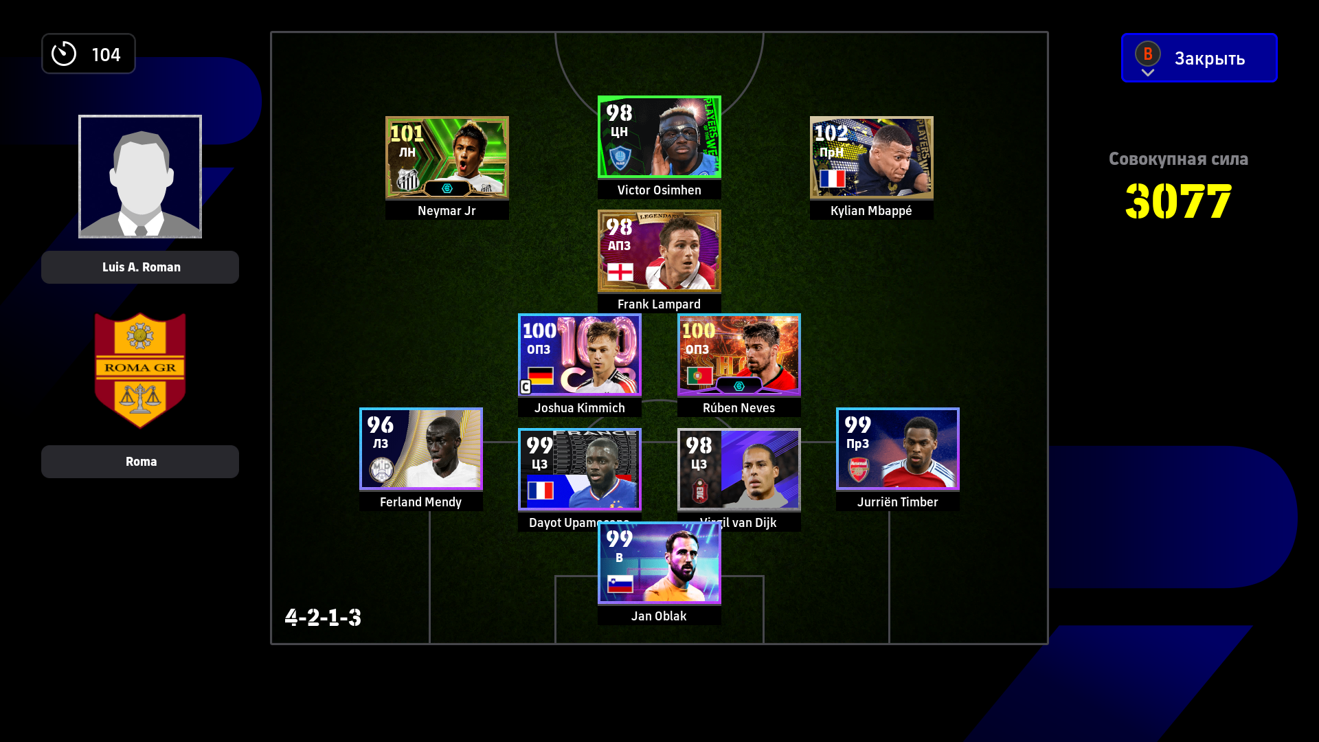1) Расстановка. Я дважды менял расстановку, адаптируя ее под ход игры. Начал с разведки 4-2-1-3, увидел, что двух опорников хватает на его орду в полузащите, которую он не использовал для игры в контроль (тогда зачем ему их столько нужно?). Также увидел, что мои три форварда расположены слишком широко для игры против этого соперника, поэтому перешел на 4-2-2-2. У меня остались все преимущества в центре поля + я смог сконцентрировать игру в атаке по центру. Противник больше стягивался к паре Адриано-Мбаппе, поэтому у того же Рафиньи стало чуть больше пространства. Затем, уже проигрывая, обновил нападение и заменил одного из опорников на Лэмпарда с перекачкой под АПЗ (107 рейтинг в игре на этой позиции не отображается). На 4-1-1-4 перешел для того, чтобы на одного моего форварда приходился один его защитник, то есть он был с уставшими игроками обороны и остался бы без подстраховки. После этого в начале атаки я старался играть выносами на своих нападающих, чтобы не страдать со своей оголенной полузащитой. Голы пришли именно благодаря тому, что теперь у меня появились зоны за спинами его защитников и мои стеночки стали гораздо опаснее.