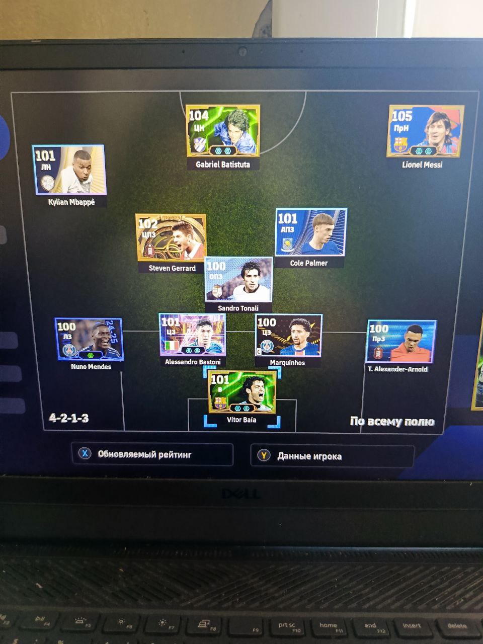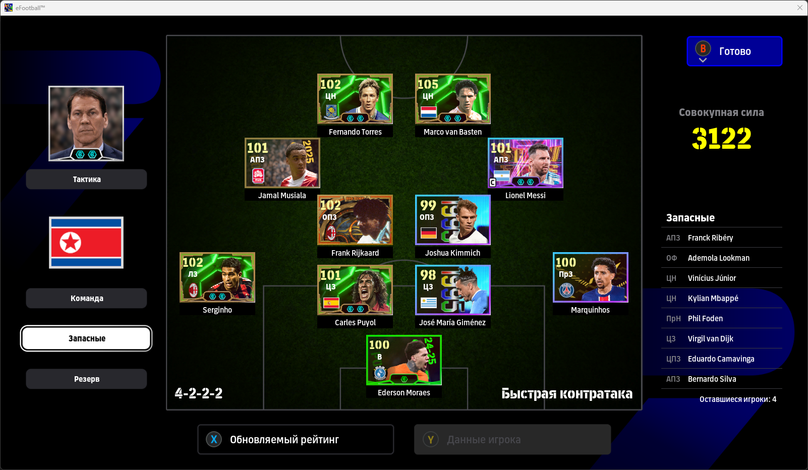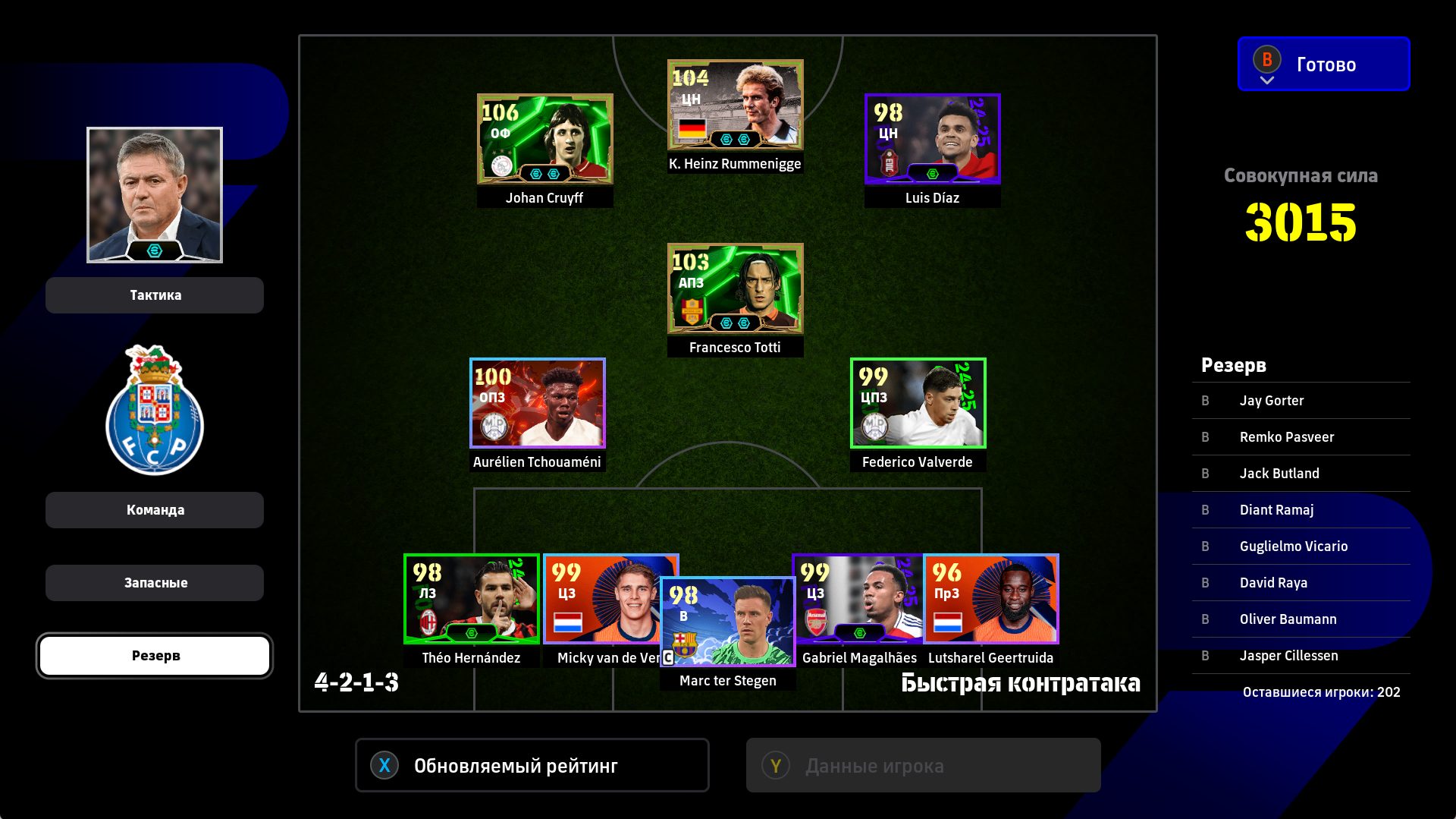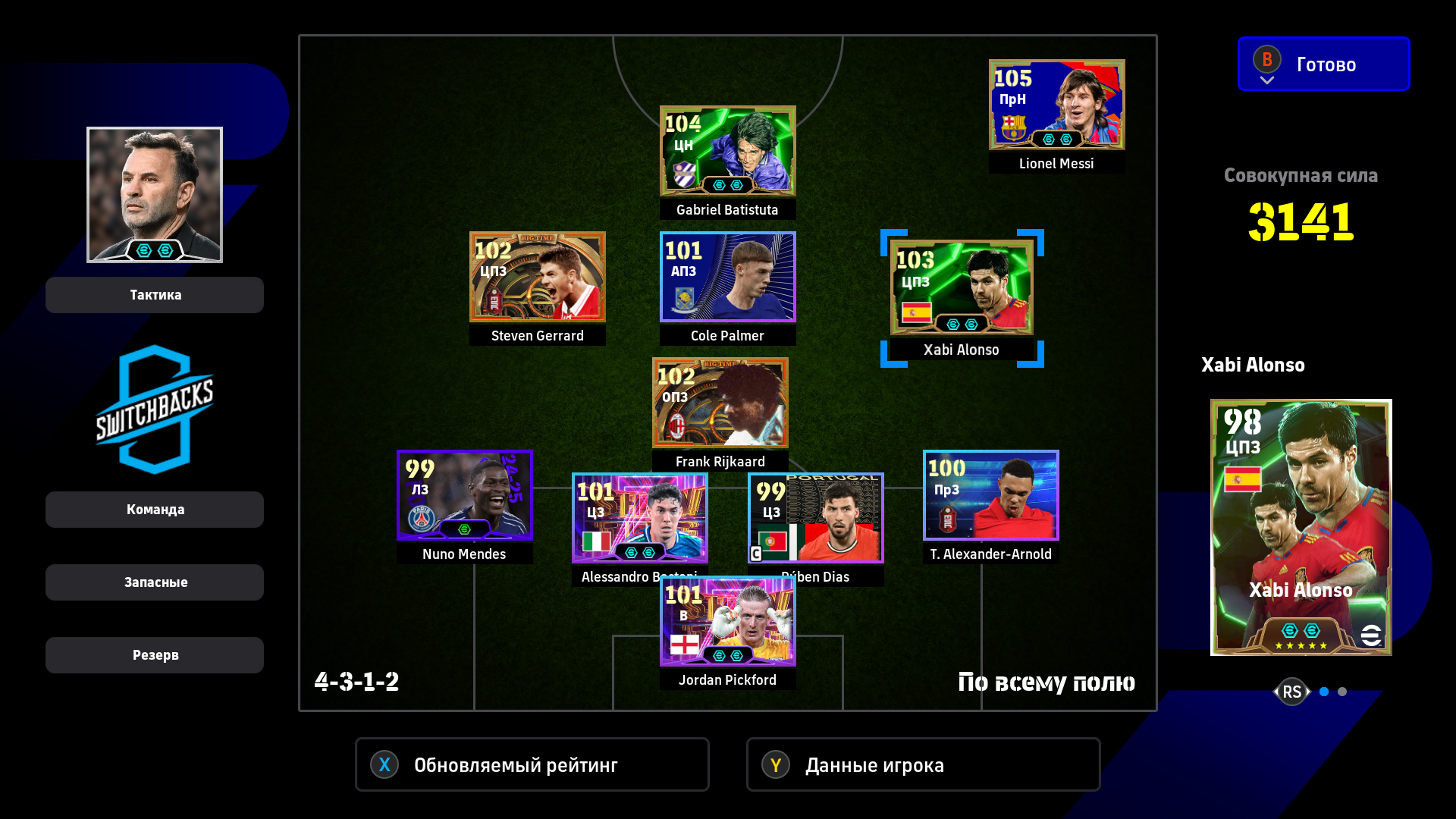 1) Расстановка. Я дважды менял расстановку, адаптируя ее под ход игры. Начал с разведки 4-2-1-3, увидел, что двух опорников хватает на его орду в полузащите, которую он не использовал для игры в контроль (тогда зачем ему их столько нужно?). Также увидел, что мои три форварда расположены слишком широко для игры против этого соперника, поэтому перешел на 4-2-2-2. У меня остались все преимущества в центре поля + я смог сконцентрировать игру в атаке по центру. Противник больше стягивался к паре Адриано-Мбаппе, поэтому у того же Рафиньи стало чуть больше пространства. Затем, уже проигрывая, обновил нападение и заменил одного из опорников на Лэмпарда с перекачкой под АПЗ (107 рейтинг в игре на этой позиции не отображается). На 4-1-1-4 перешел для того, чтобы на одного моего форварда приходился один его защитник, то есть он был с уставшими игроками обороны и остался бы без подстраховки. После этого в начале атаки я старался играть выносами на своих нападающих, чтобы не страдать со своей оголенной полузащитой. Голы пришли именно благодаря тому, что теперь у меня появились зоны за спинами его защитников и мои стеночки стали гораздо опаснее.