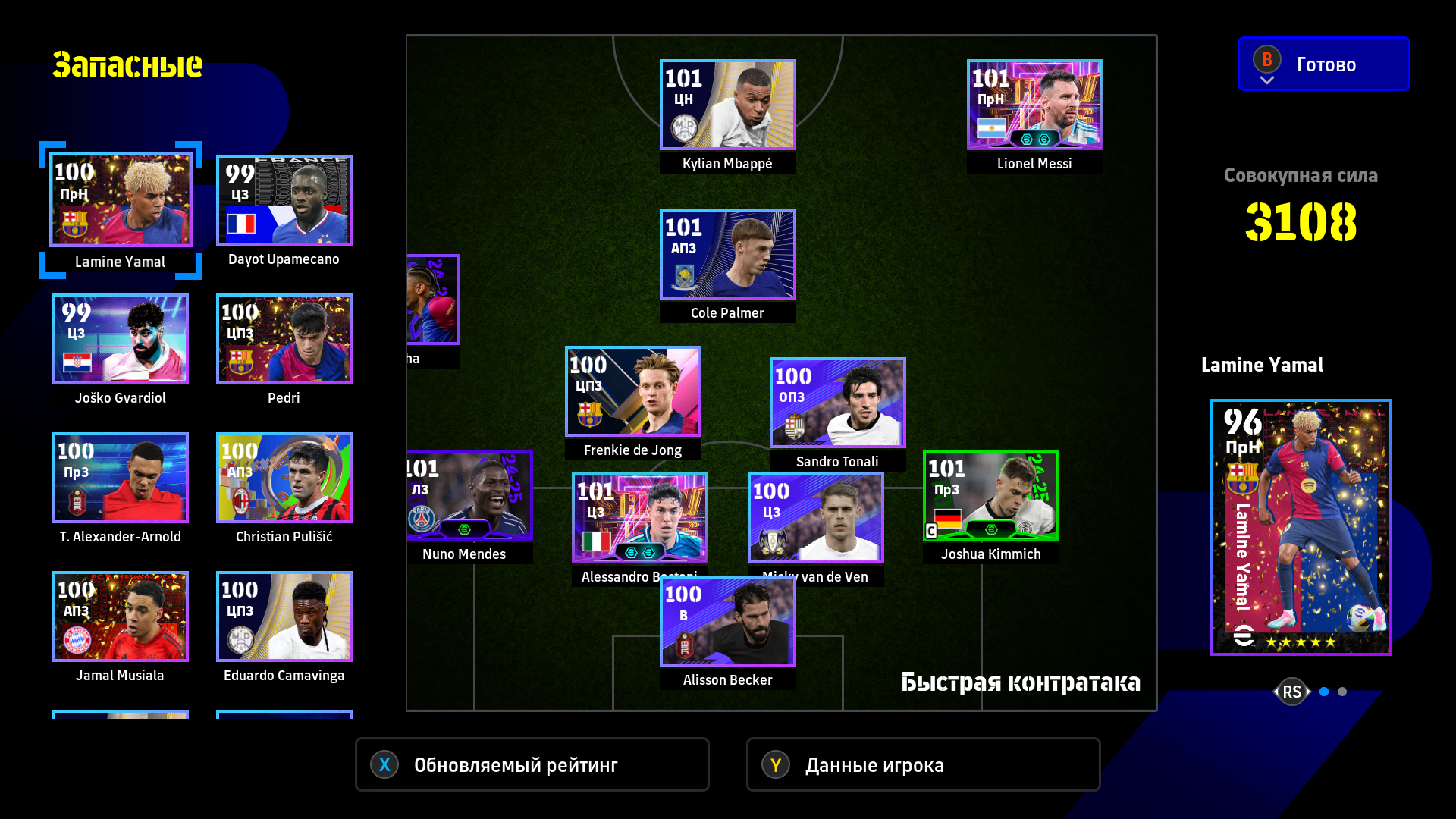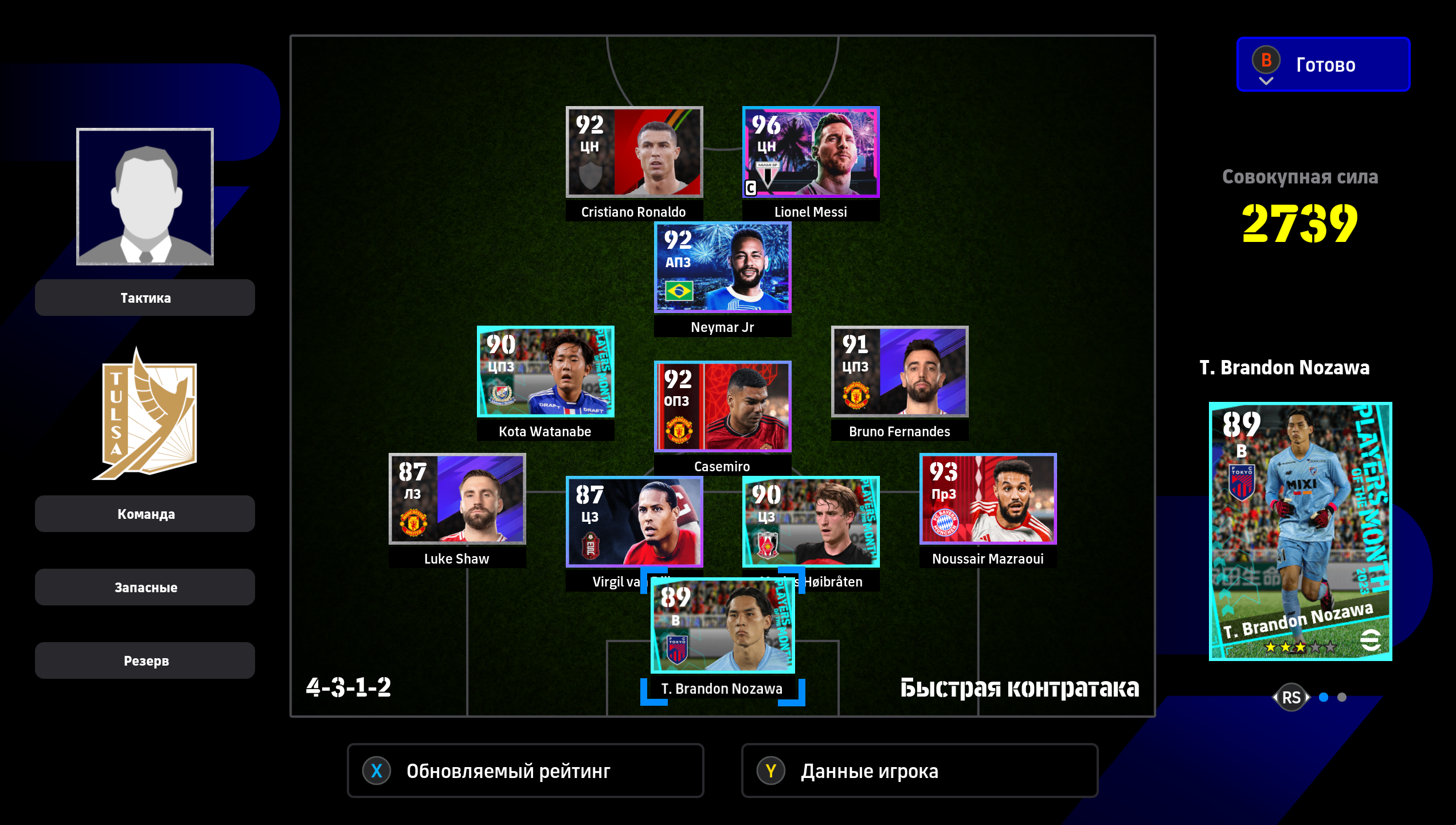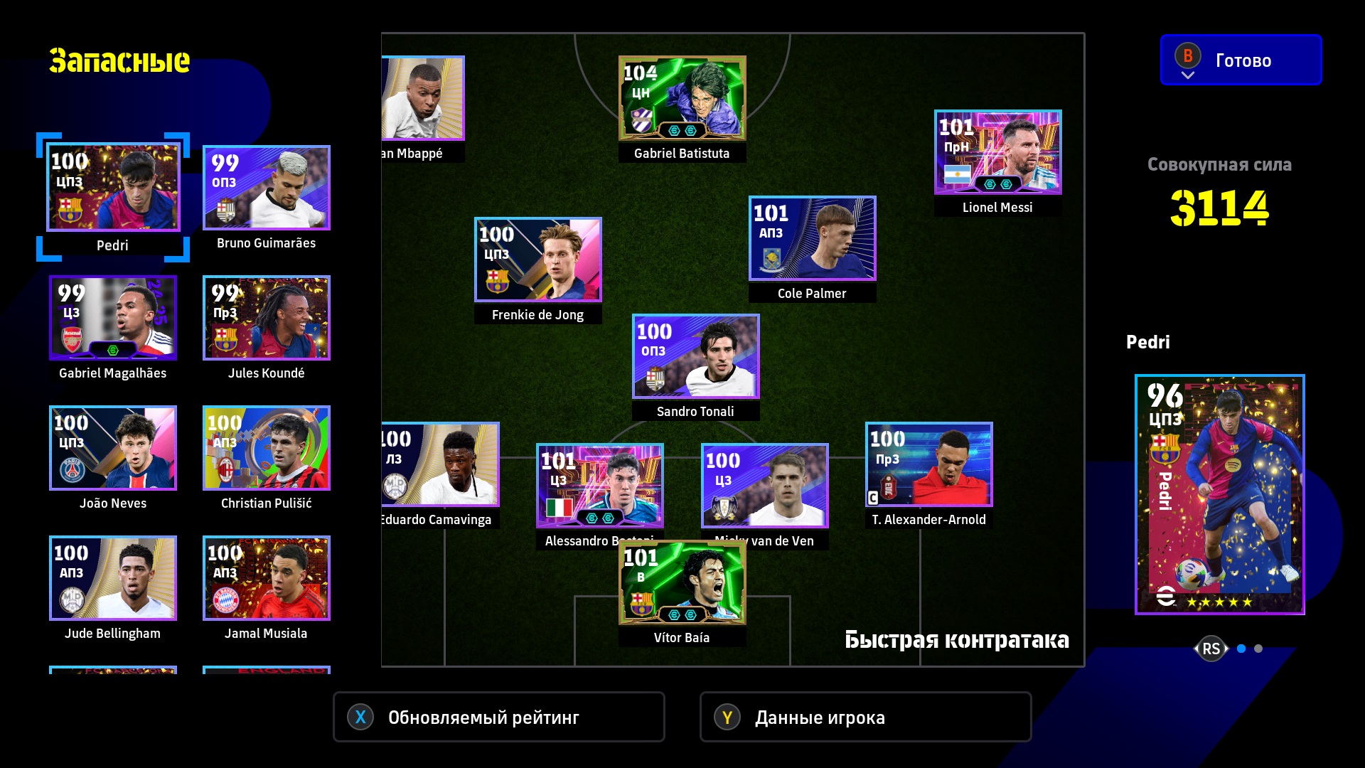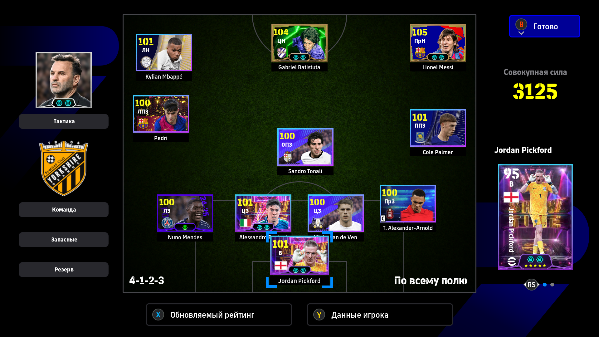 1) Расстановка. Я дважды менял расстановку, адаптируя ее под ход игры. Начал с разведки 4-2-1-3, увидел, что двух опорников хватает на его орду в полузащите, которую он не использовал для игры в контроль (тогда зачем ему их столько нужно?). Также увидел, что мои три форварда расположены слишком широко для игры против этого соперника, поэтому перешел на 4-2-2-2. У меня остались все преимущества в центре поля + я смог сконцентрировать игру в атаке по центру. Противник больше стягивался к паре Адриано-Мбаппе, поэтому у того же Рафиньи стало чуть больше пространства. Затем, уже проигрывая, обновил нападение и заменил одного из опорников на Лэмпарда с перекачкой под АПЗ (107 рейтинг в игре на этой позиции не отображается). На 4-1-1-4 перешел для того, чтобы на одного моего форварда приходился один его защитник, то есть он был с уставшими игроками обороны и остался бы без подстраховки. После этого в начале атаки я старался играть выносами на своих нападающих, чтобы не страдать со своей оголенной полузащитой. Голы пришли именно благодаря тому, что теперь у меня появились зоны за спинами его защитников и мои стеночки стали гораздо опаснее.