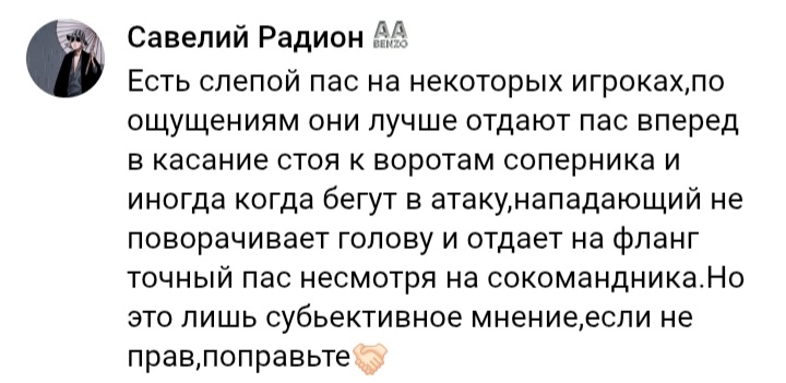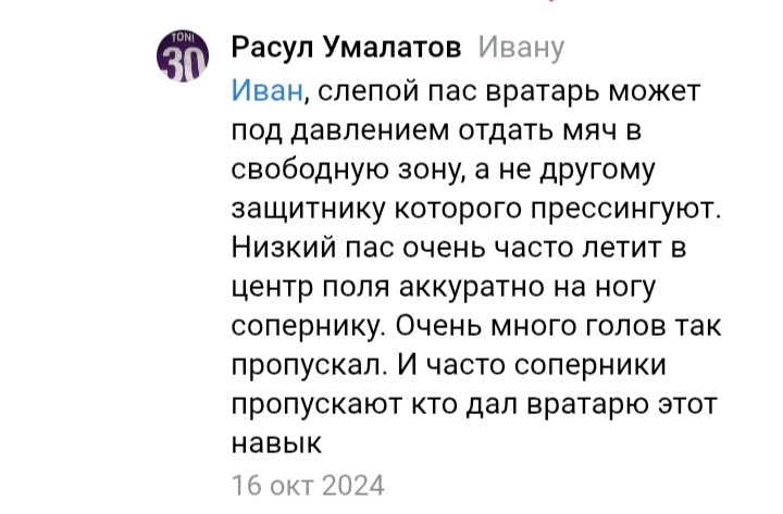 >>3383564 В описании навыка сказано, что с помощью слепого паса можно обманывать соперника, типа смотреть в одну сторону, а отдавать в другую. Что-то я сомневаюсь, что это так работает, но видел рекомендации давать этот навык вратарям. Они с этим навыком должны лучше пасовать защитникам. Но надо тестить, по этой теме инфы крайне мало. У меня есть один игрок с таким навыком, Денилсон эпик, как-то давали бесплатно. Как раз хочу поиграть схемой 4-4-2, поставлю его на лпз и посмотрю. Но в любом случае этого бомжа оставь, навык редкий и может пригодится.