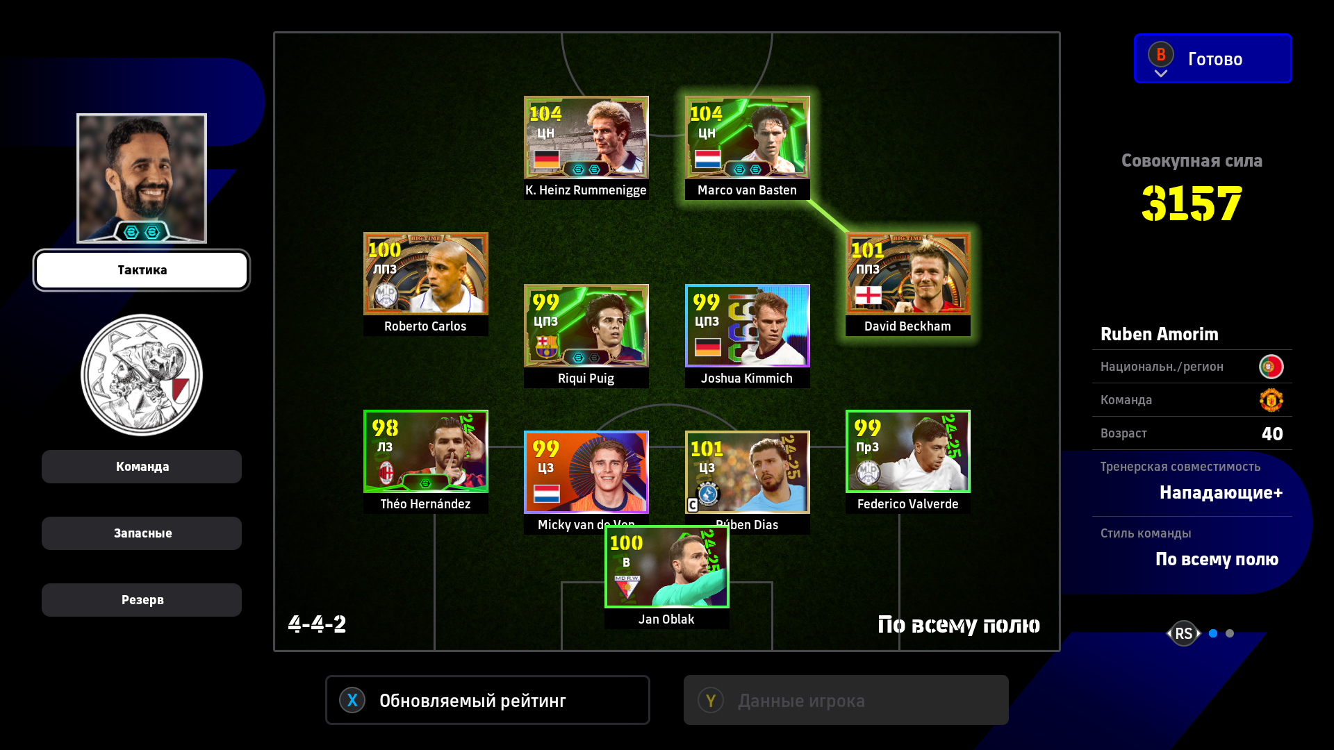 Вчера ночью записал хайлайт одного из матчей на втором аккаунте, но делал это в окне и с ненастроенным OBS, так что качество говно, надо будет все настроить. Записывал для демонстрации игры со связкой Сержиньо-Ван Бастен под Аморимом. Выводы и сами можете сделать даже по этим хайлайтам, а я вернусь к Руди Гарсии и схеме 4-2-2-2.