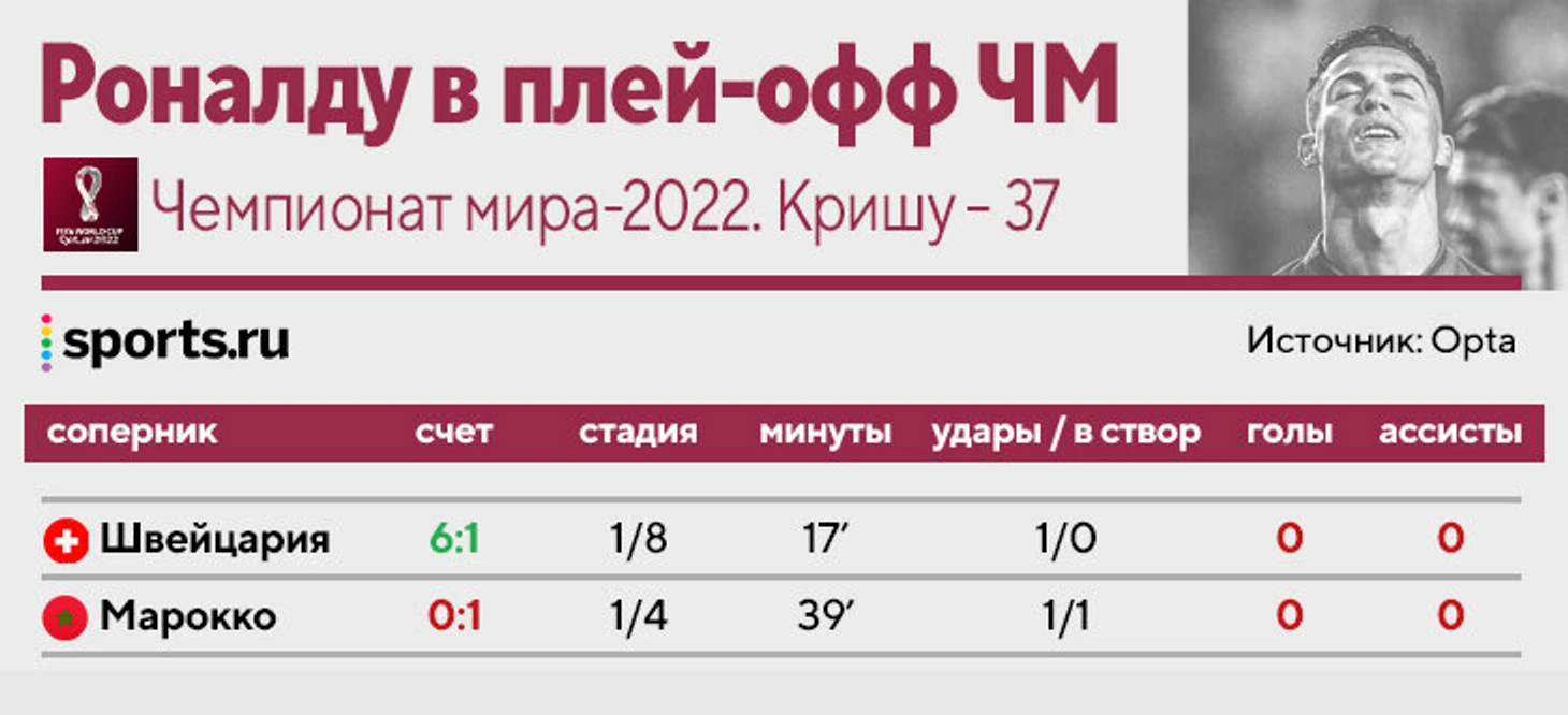 Португалия проиграла Марокко (0:1) и вылетела с чемпионата мира – кажется, в трофейном шкафчике Криштиану Роналду так и останется пустое место, заготовленное под кубок. А в статистике останется ноль напротив голов в плей-офф.