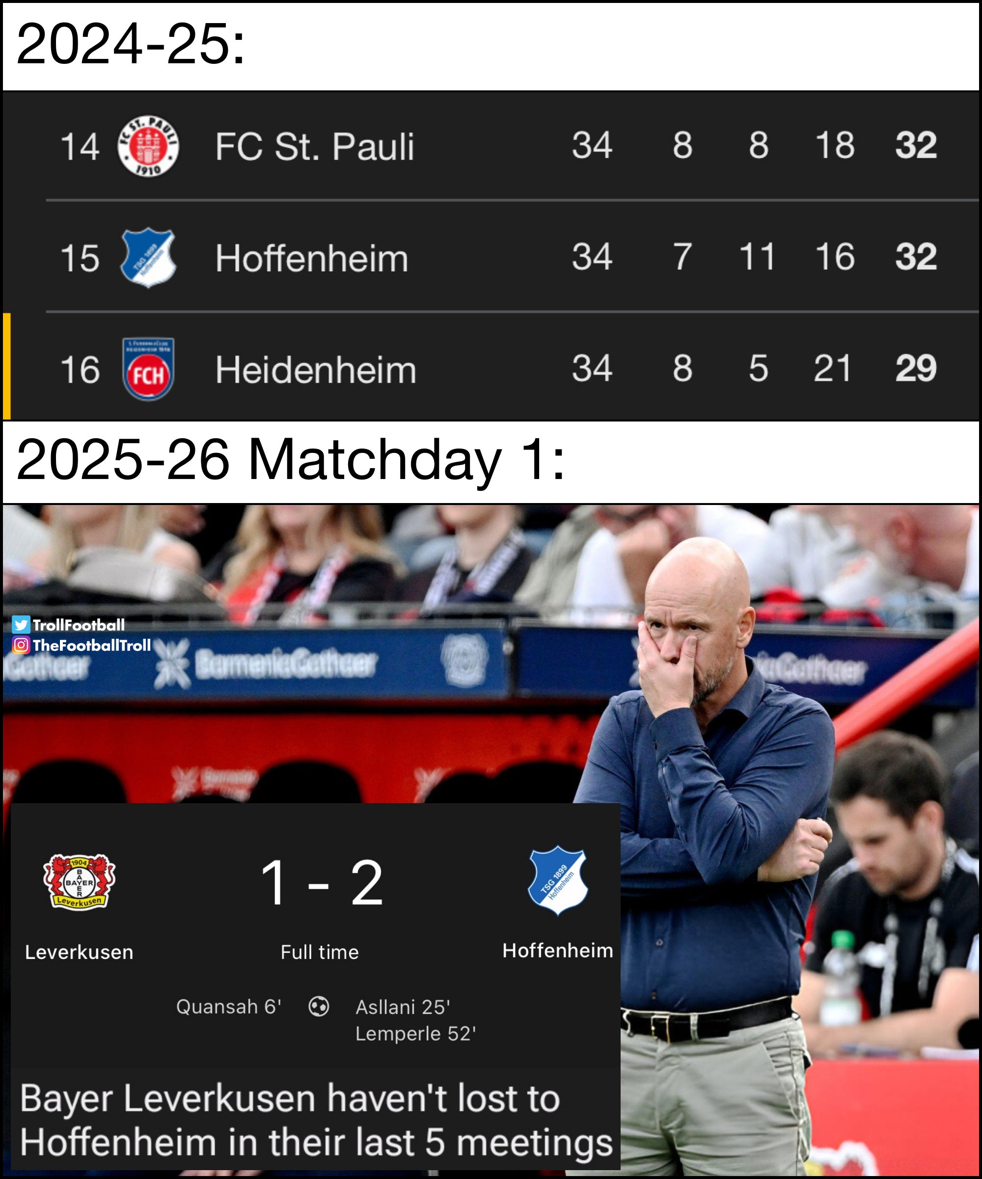 Ноунейм колхозники давят 7Хага. Унион насрал в рот Вольтемаде и всем швабам. Посмотрим обосрётся ли Ковач. Кароч с сезоном всё ясно. В еврокубках ёбка будет дикая. Опять только Баварии всех на горбе тащить.