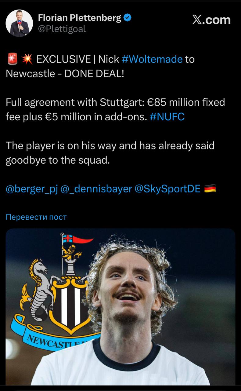«Сороки» решились на покупку Ника Вольтемаде из «Штутгарта» – суммарная стоимость сделки может достичь 90 млн евро. Немец считается заменой Исаку, поэтому теперь в «Ньюкасле» открыты для продажи шведа, на которого претендует «Ливерпуль», сообщает Sky Sports. Ожидается, что трансфер 25-летнего форварда станет самым дорогостоящим в истории английского футбола.