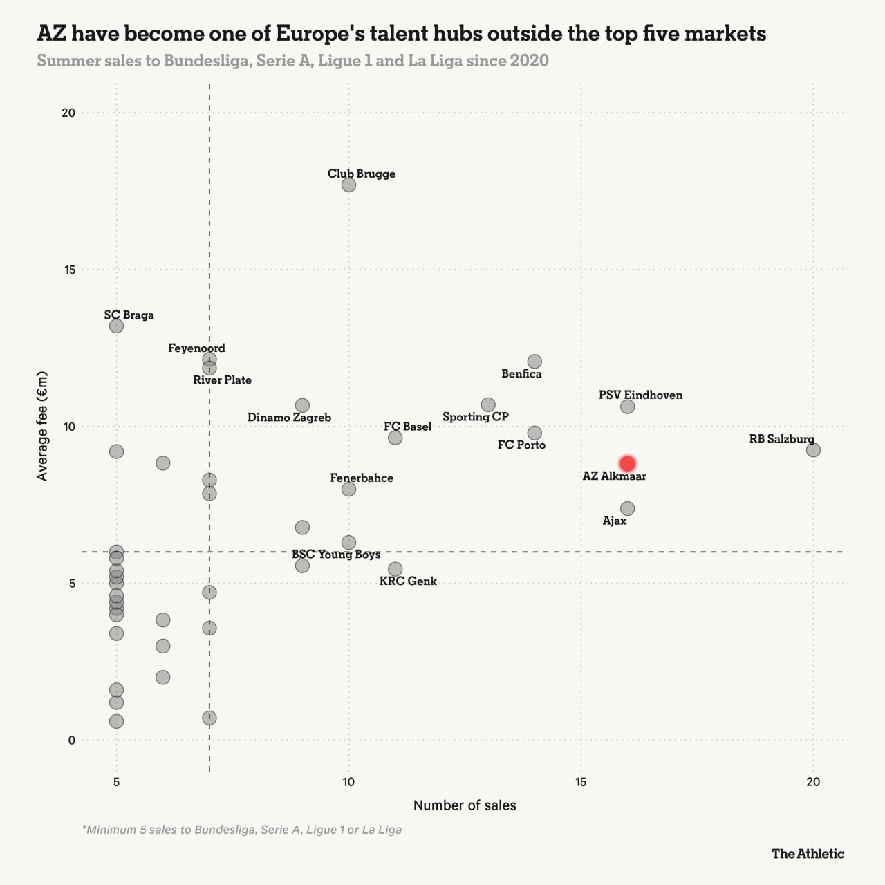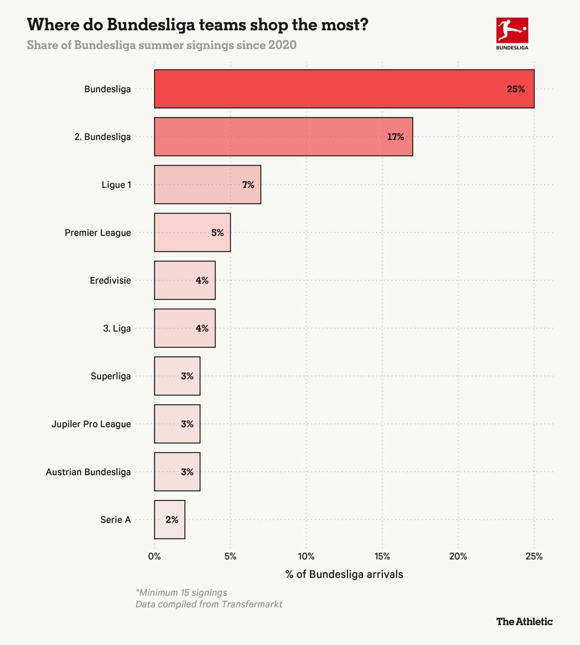 У The Athletic вышел материал про особенности трансферных кампаний в топ-лигах (АПЛ за скобками). Например, в Германии часто закупают талантливых проспектов из стран с родственной футбольной школой (Нидерланды, Австрия), а у итальянских команд наблюдается тесная связь с французским и (внезапно) английским рынками.