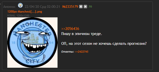 КОРОЧЕ На рубеже девяностых, в начале нулевых я приходил домой со школки, включал мультики по кабельному. Никелодион, Фокскидс, но смотрел их ровно до пол шестого вечера, потом из своей спальни, аки медведь из спячки, вываливался дед, а потом и батя с работы подкатывал на своей пятидверной Форд Сиерра, доставал кучу пива из холодоса\багажника, и они вместе садились в гостиной, переключали канал на плоском но всё ещё ламповом телеке, и смотрели НТВ (тогда по кабельному в Одессе в 99% случаев тупо транслировались российские каналы). Они смотрели Манчестер Юнайтед под комментарии Елагина и всячески меня на это говно подначивая. Они каждый раз восхищались игрой класса 92, дрочили на Фёргитайм, а я подмечал за этим другую сторону. Левые свистки, затяжку времени, пенальти не по делу и выступал контркультурщиком. Хуй знает в кого такой дебил уродился, но я терпеть не мог этот ебучий Юнайтед. Предки хайпуют, празднуют, а я постоянно подмечаю, то свисток не тот, то фол не туда дали, то Ховард Вэб откровенно топит за МЮ. В какой-то момент начал им на это указывать, "бороться", но от меня отплёвывались. Так я стал лютым хэйтером своих дедов. И Арсенал Венгера тоже терпеть не мог, потому что я тогда с подачки предков ходил "на футбол" и там все сверстники дрочили на Арсик. Это было какое-то массовое помешательство, как вирус блять. Деды дрочат на МЮ, Зумеры дрочат на Арсик. Мне не хотелось ни того, ни другого. И так... я пришел нихуя не к Сити, конечно же блять. Я некоторое время, дедам на зло, болел за Ливерпуль, с Ворониным в составе и божественным Торресом. Потом дед помер. Я притапливал за Челси с Дидье, и даже Шевченко и Торресом (лол). Было такое время, что за кого угодно, лишь бы против МЮ. Года, сезоны, составы и даты могут смешиваться в памяти, я точно не помню. Но я точно помню, что в Сити я вкатился с закупкой Сильвы, Туре и Коларова. Вот тогда я почувствовал, что щас сука будет командочка, то самое дерби над которым они смеялись — обретает новую силу. И батя мой, глор ебаный, потерпит хуев. Так и было. Сити взлетел, 1:6 на Олд Траффорде было атомной бомбой. Я влюбился в тот состав. В этот клуб. А чемпионство 2012, золотой гол 93:20 Агуэро, с криком комментатора АгуэээрооООО! Навсегда запал в душу. И кстати я не люблю Пепа. Мне кажется он гений, который страдает горем от ума. Его идеи его пленят. Я видел много важных матчей, когда его идеи проваливались, и команде приходилось играть без него, просто играть на фланг и подавать в штрафную. Те самые 1\8 против лионов и монако. Когда было сделано 75 навесов на 175 см Агуэро. И Пеп, тогда, своей команде нихуя не помогал, он думал, бляьть, три года, как ей помочь. Но базару ноль, он придумал. Потратил миллиард, и взял требл. Последние годы, я болею скорее за персоналии в сити, мне хотелось и хочется чтобы у КДБ, чтобы у Холланда, чтобы у Сильвы-2 было всё хорошо, чтобы молодняк играл. За Палмера очень горькие слёзы, за Маккейти, за Бобба держу кулачки. За Фодена очень обидно. Когда я первый раз приехал в Манчестер, мне в первую очередь бросилось в глаза, и даже в какой-то мере поразило, но тогда это было актутально, что в Манчестере все остановки поделены на два типа. Они либо красные, либо голубые. Ну и соответственно на одних празднует Рэшфорд и написано "вэлком ту манчестер", а в другой половине города, празднует Фоден, и там так же само, таким же шрифтом 