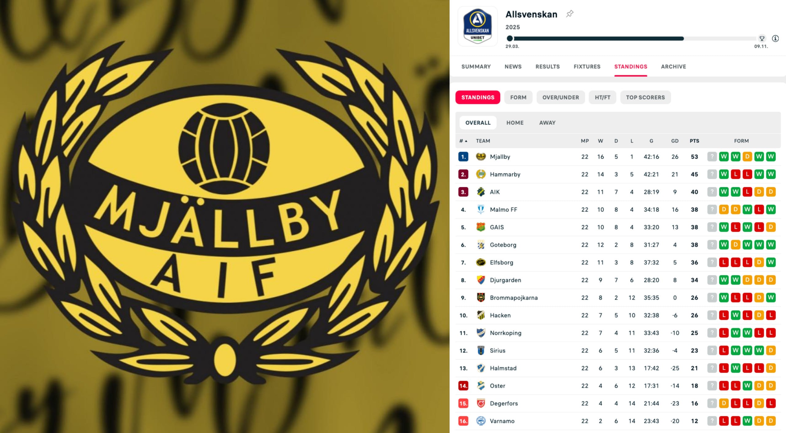 В шведской лиге Аллсвенскан назревает сенсация: впервые в истории чемпионом может стать скромный «Мьёльбю», лидирующий в таблице за восемь туров до финиша