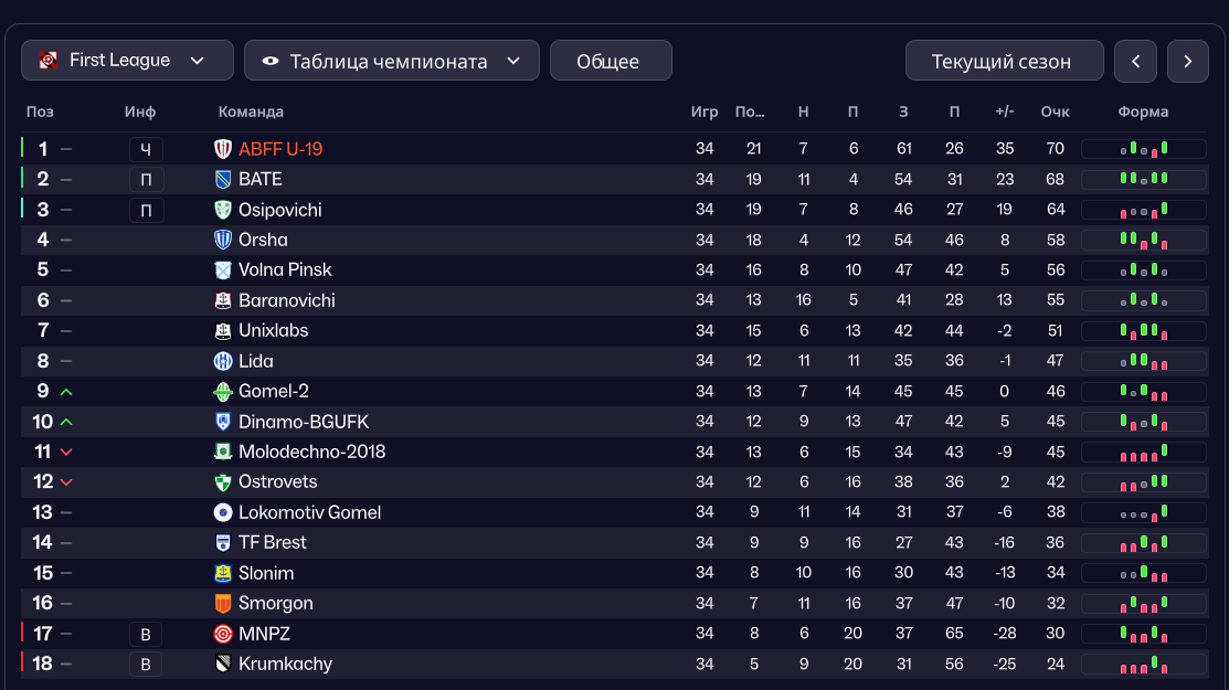 >>3410513 Ну что, закончил второй сезон Не смотря на то, что ёбаная борда распродала три четверти состава я точечно прикупил несколько игроков, подтянул моложёшь и выиграл вторую лигу, опередив БАТЭ Вы просто посмотрите, например, на этого бистяру, Дмитрия П. Денисенко миддлнейм у белоруса, ват?! 16 голов, 10 голевых пасов, охуеть! Да это ж четверть забитого всей командой! Особый кек в том, что только после этого сезона руководство решило сделать клуб профессиональным. А я-то думал, как меня позвали без лицензии тренировать.