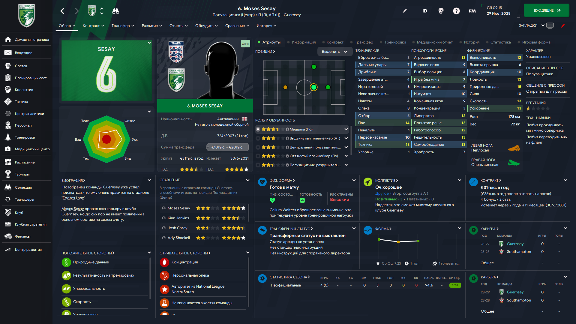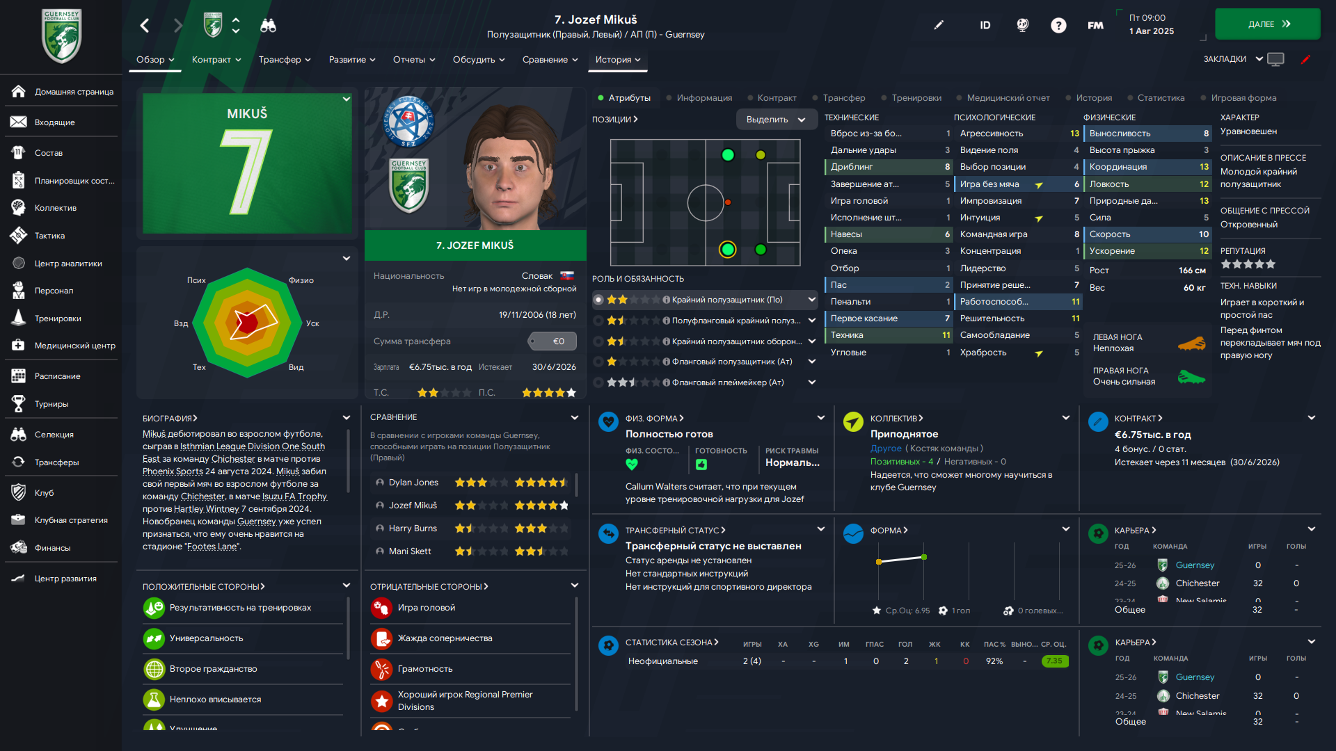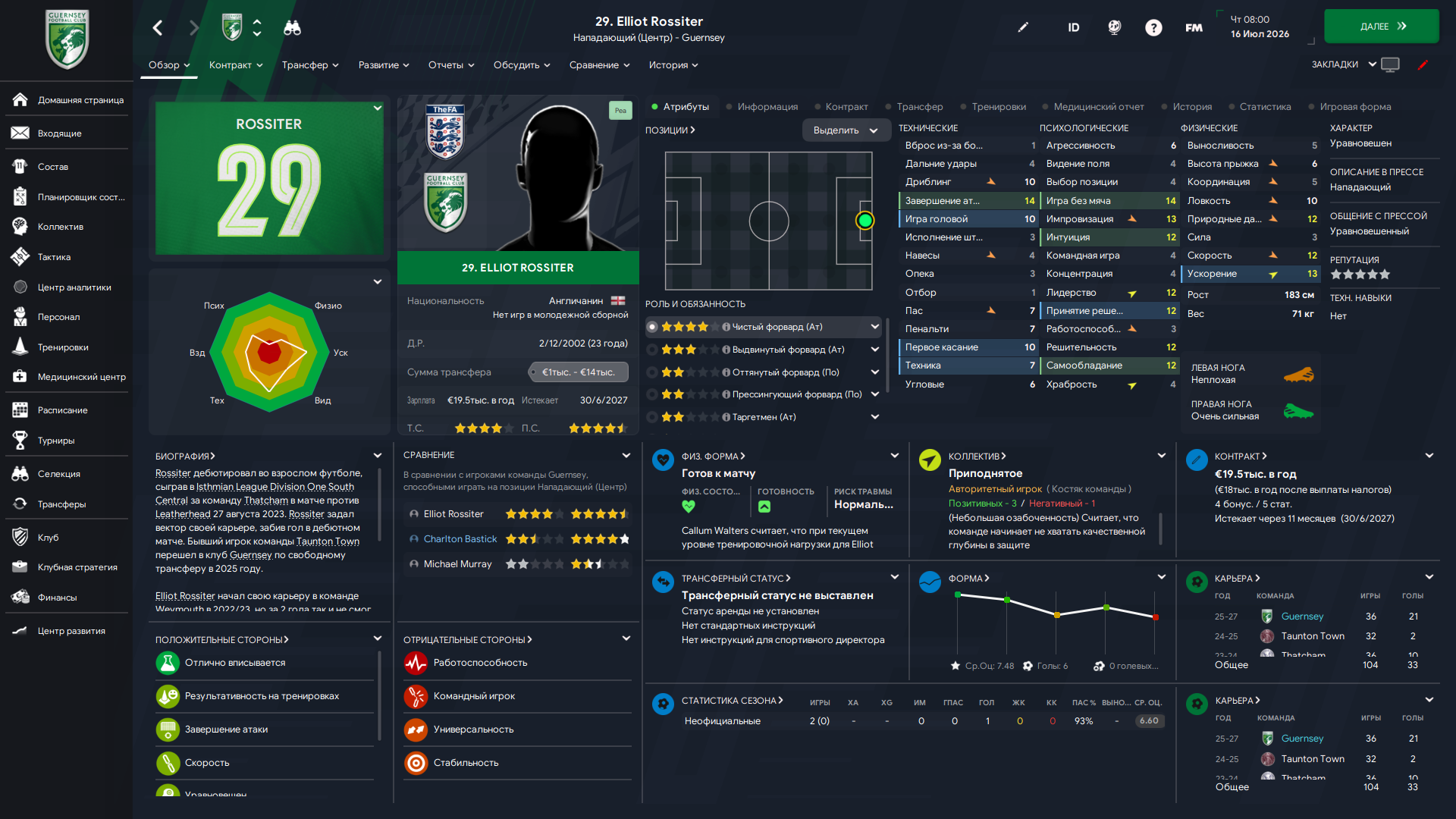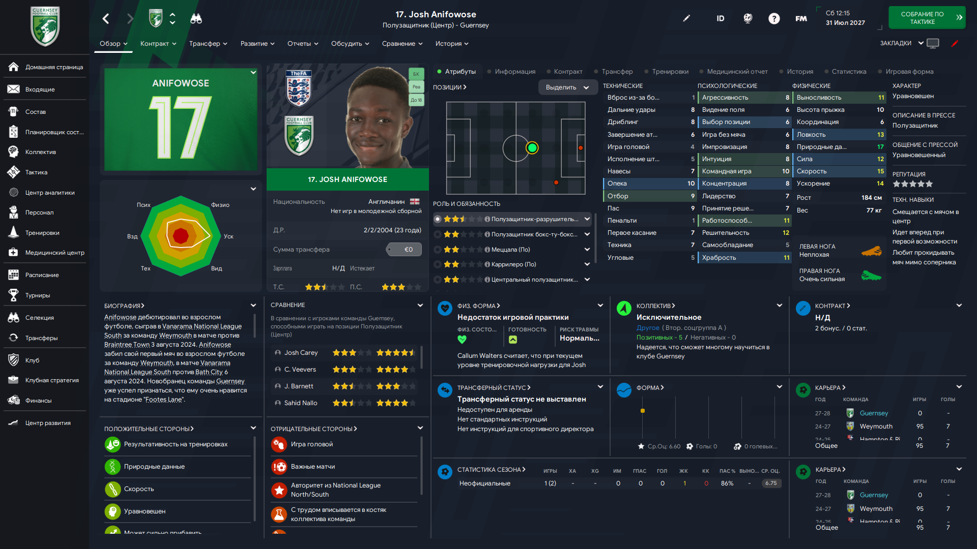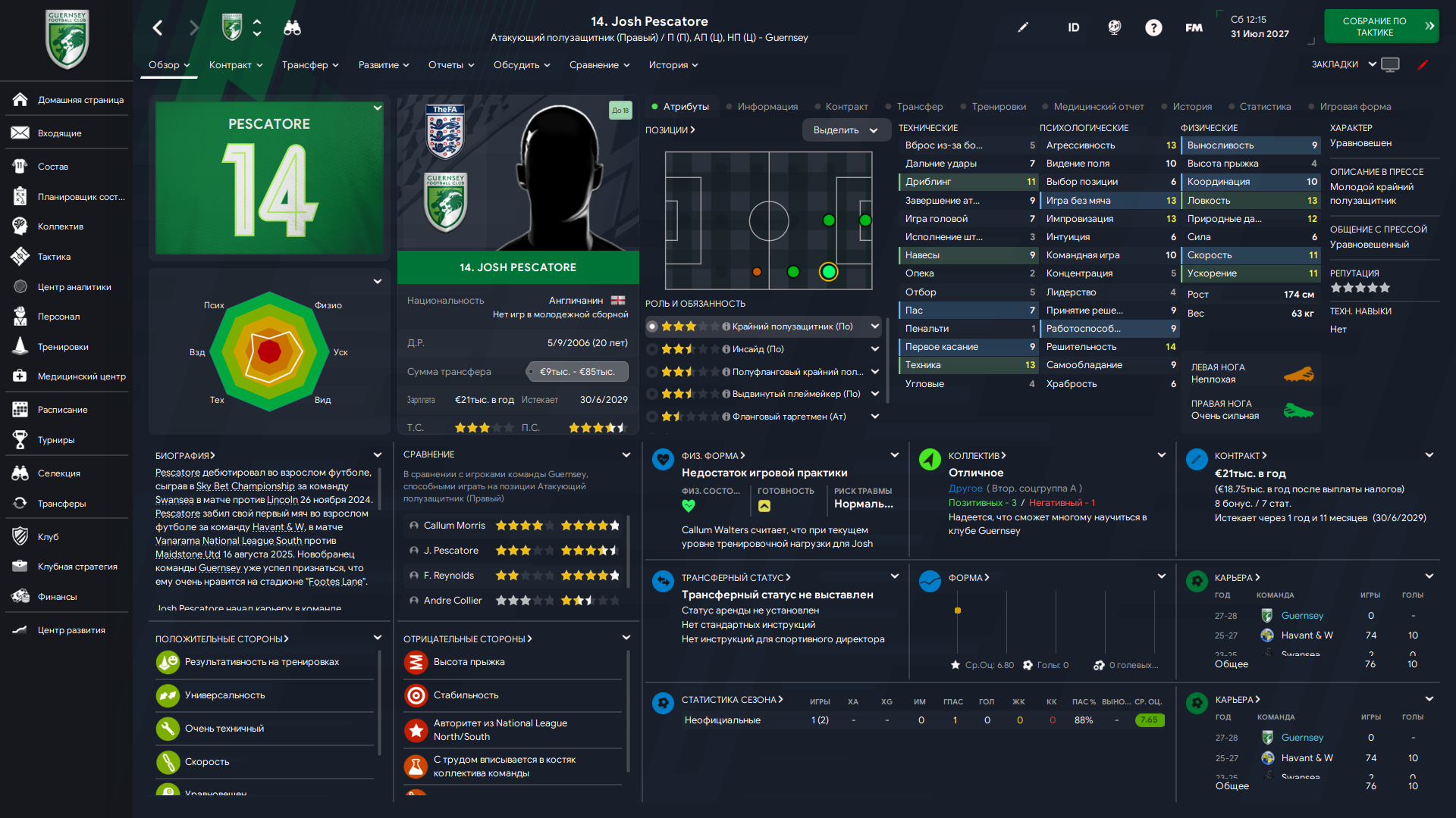 Физически развит, остальное наработаем, надеюсь. Сделал 14 ассистов в 7 дивизионе, к нам перешёл почти за 6 тысяч евро.