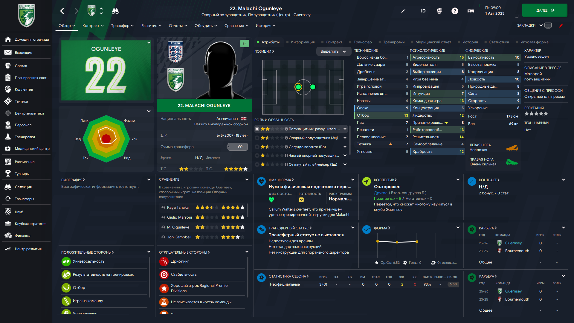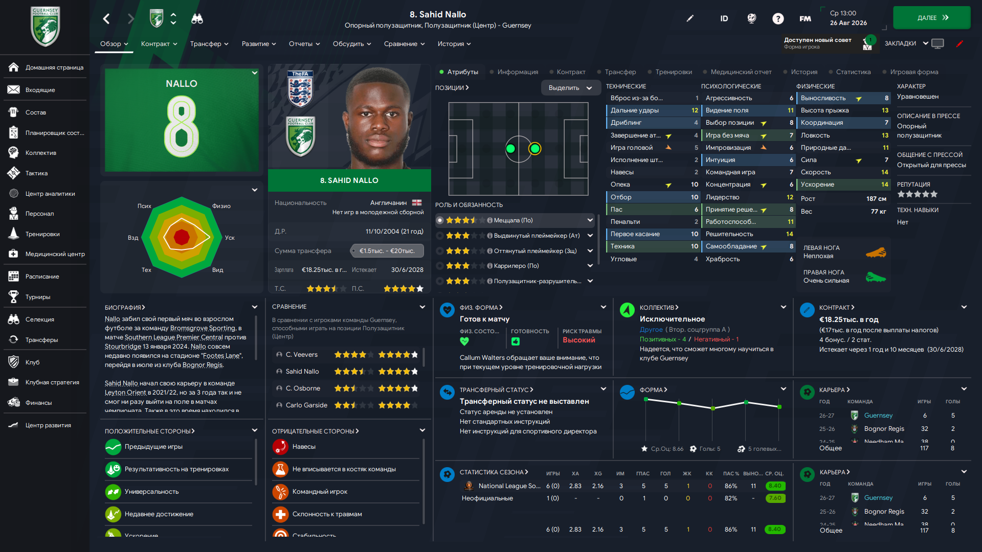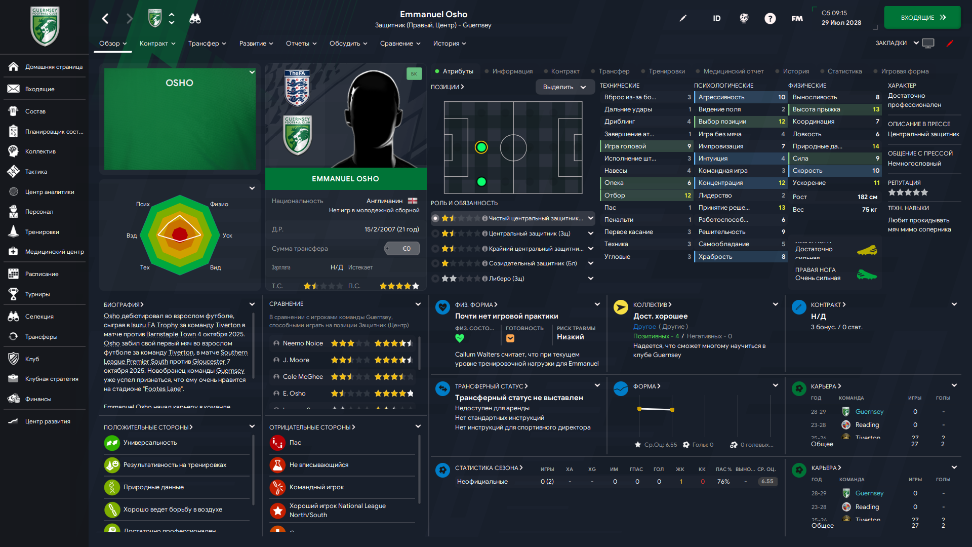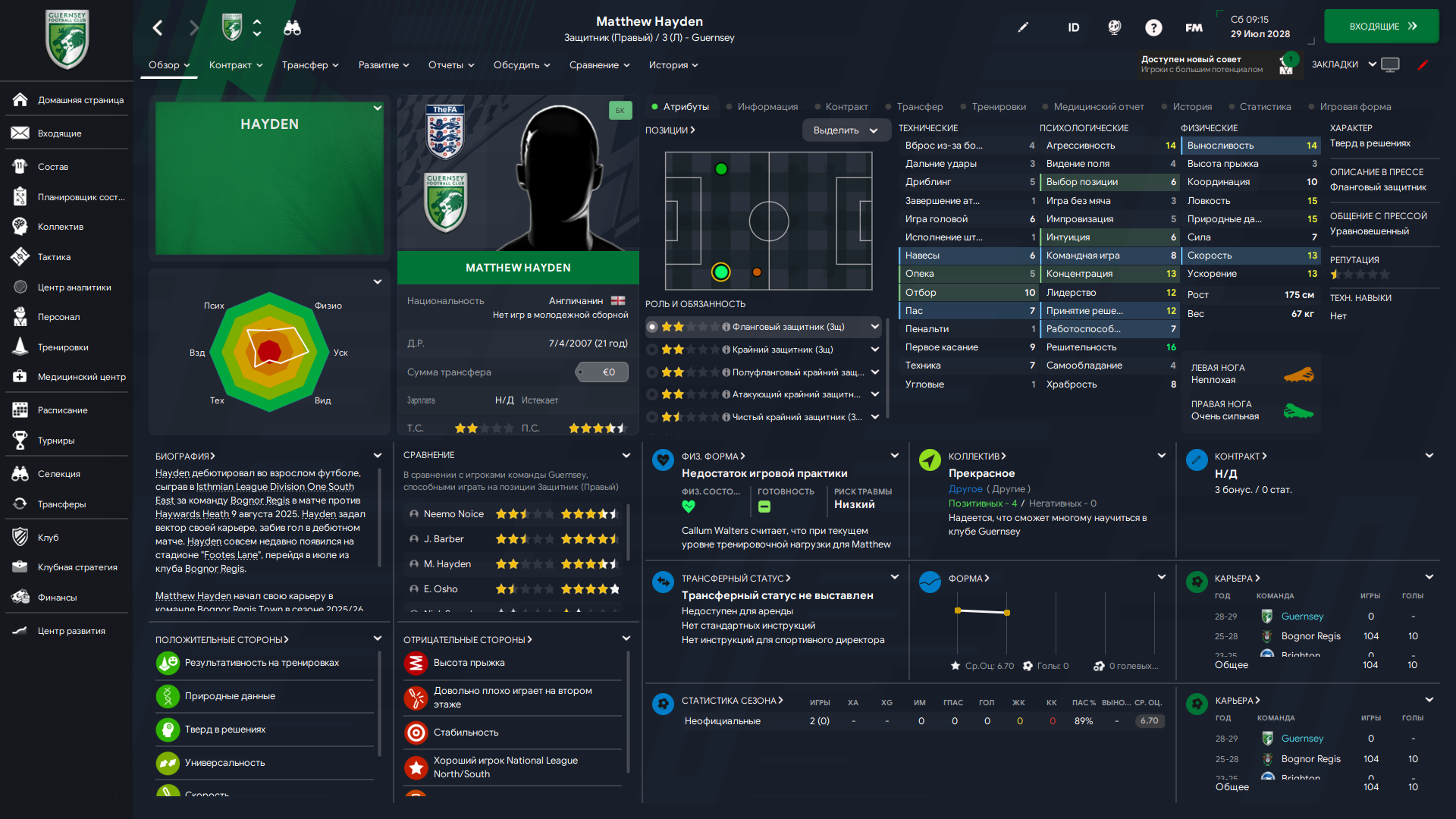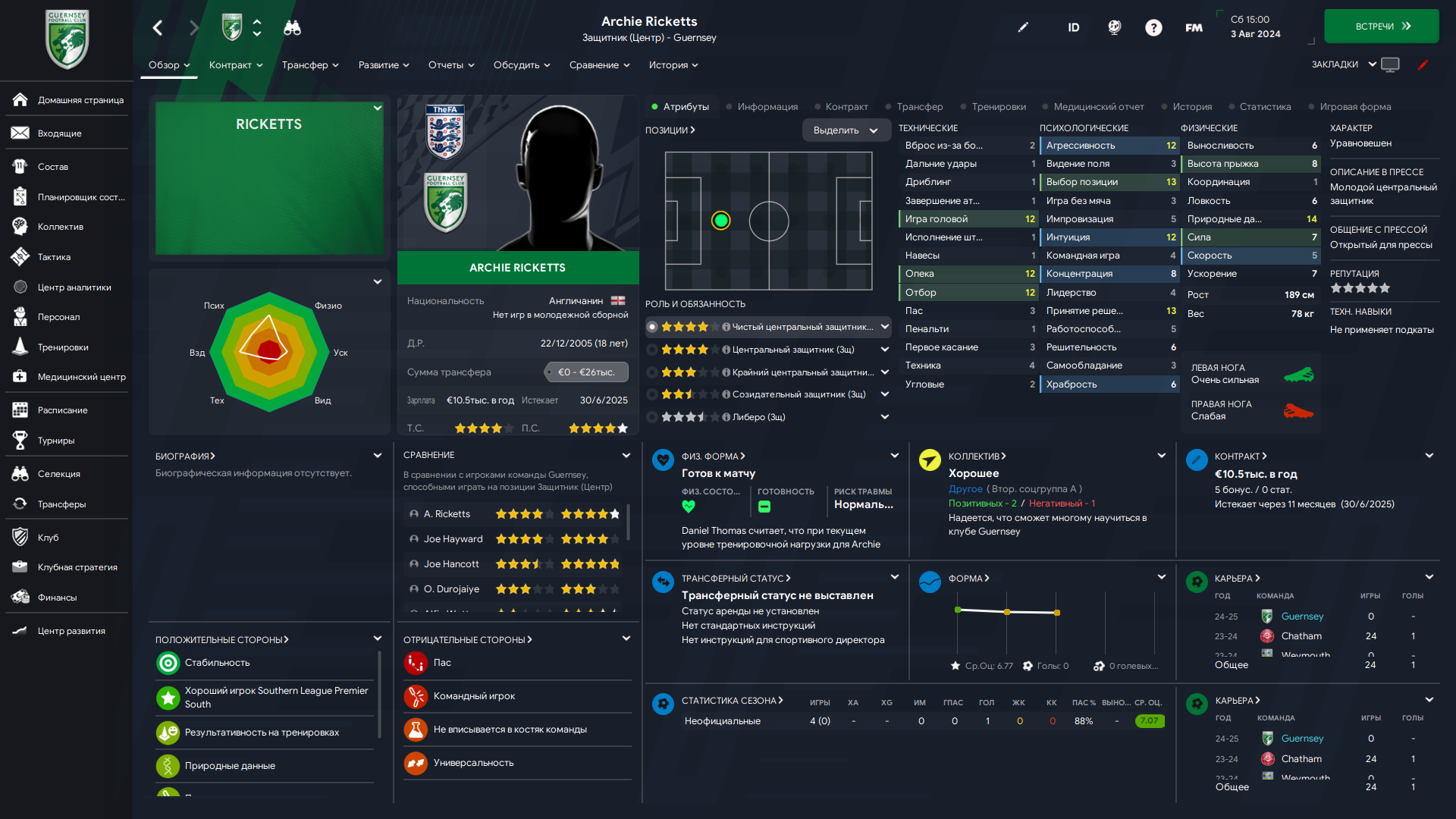 Физически развит, остальное наработаем, надеюсь. Сделал 14 ассистов в 7 дивизионе, к нам перешёл почти за 6 тысяч евро.