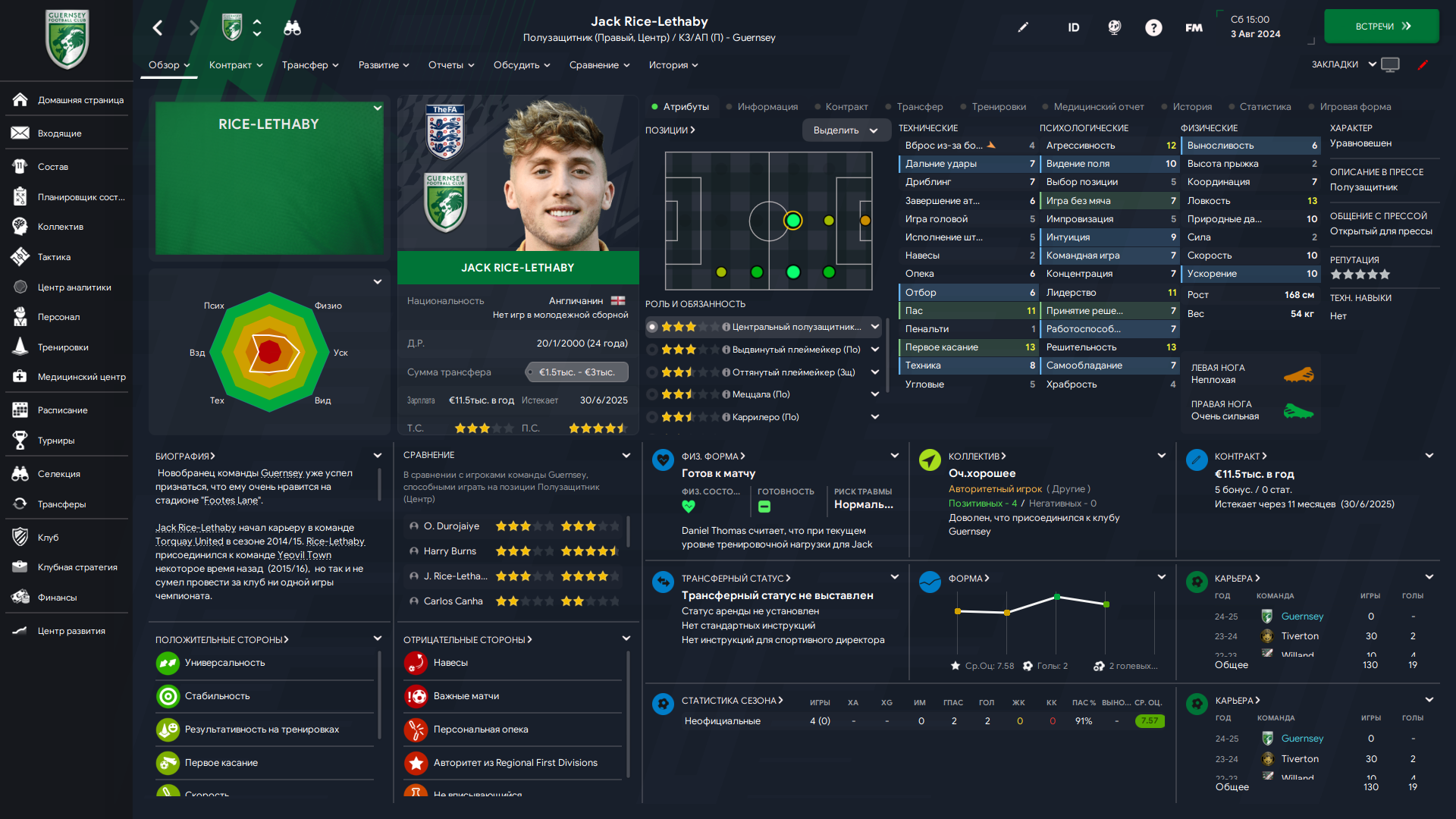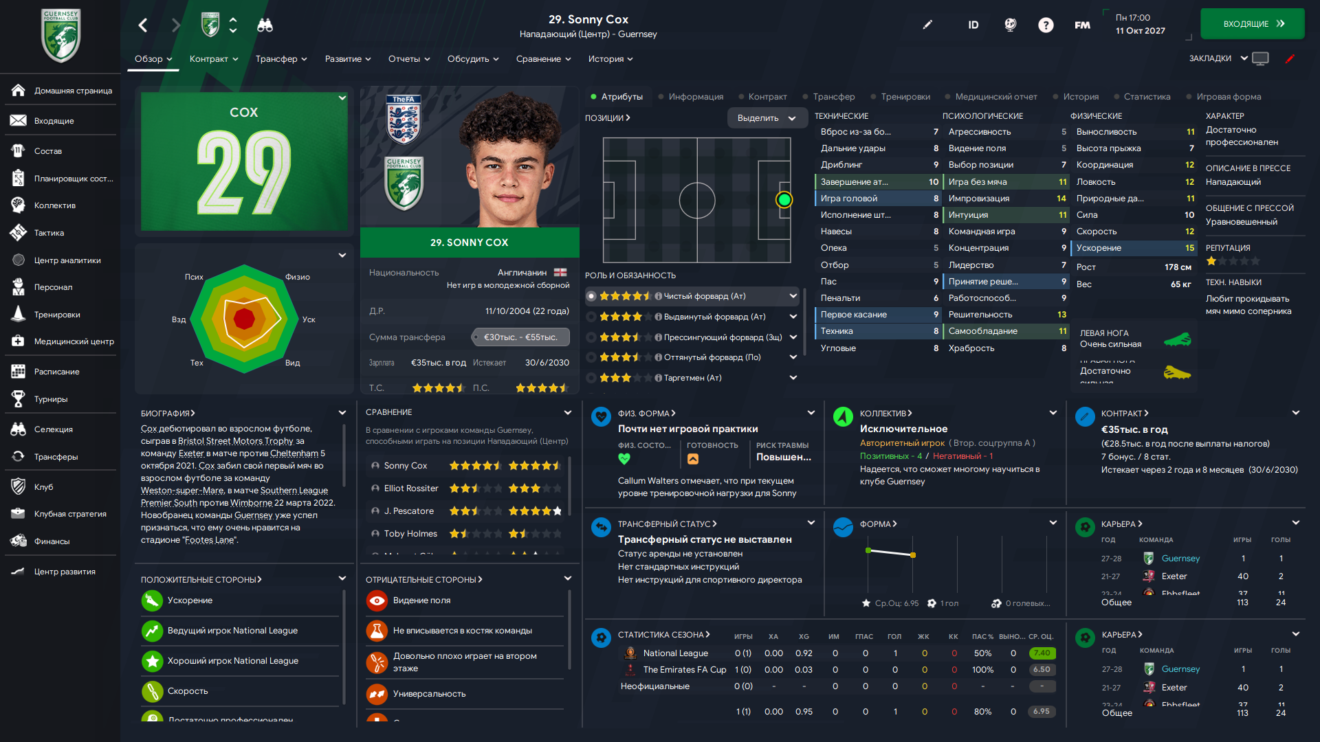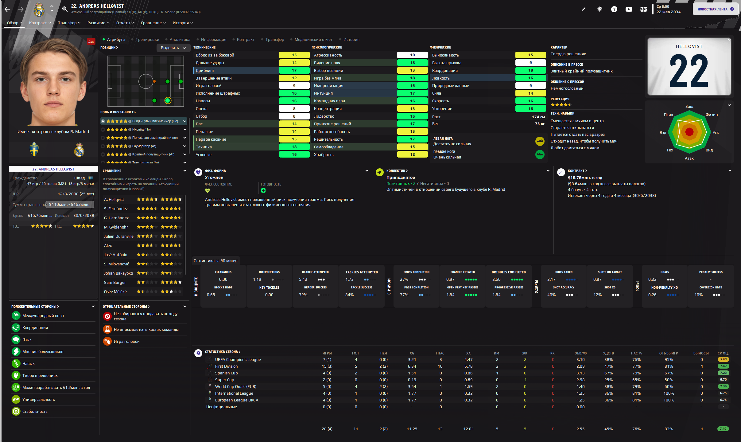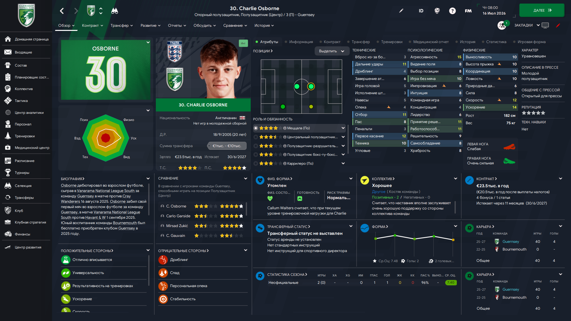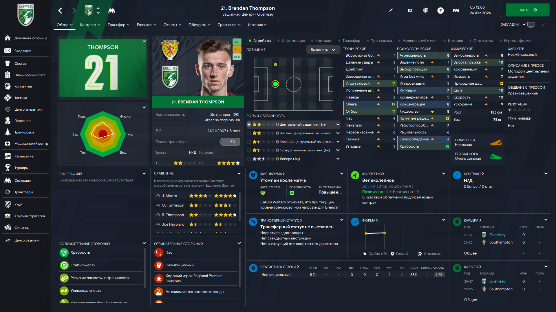 Физически развит, остальное наработаем, надеюсь. Сделал 14 ассистов в 7 дивизионе, к нам перешёл почти за 6 тысяч евро.