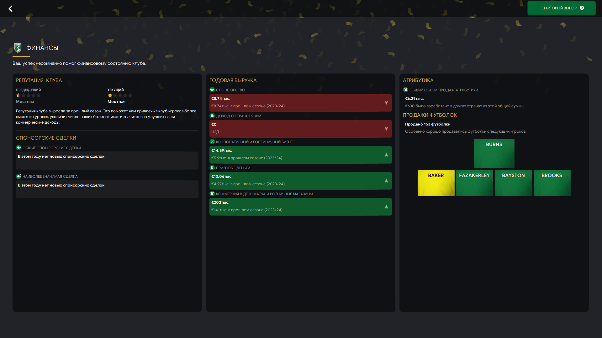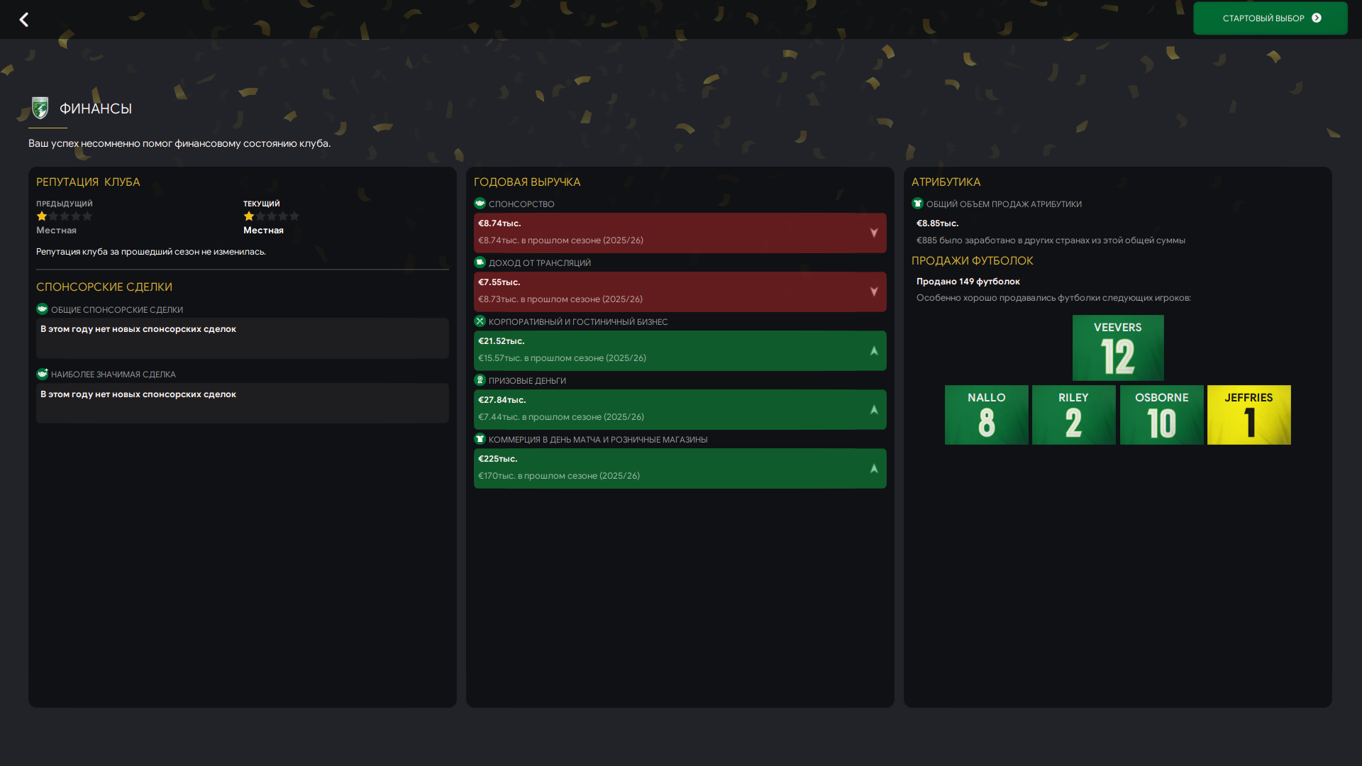 Много игроков осталось с прошлого сезона в основе, добавили фланги и сейчас пытаемся остатки бюджета закинуть в кого-то околотопового, но никто не идёт. Ждём, пока они отчаются без клуба и согласятся идти к нам.