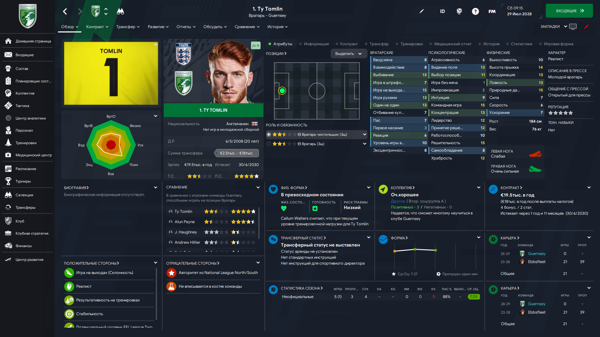 По скиллам лучше прошлого вратаря, но приехал из Эбсфлита, где занял последнее место, пропустив 34 мяча. Другое дело, что Джефрис, занявший с нами 7 место, пропустил аж 58, плюс скауты кипятком писались. Ну что могу сказать, пока получше предыдущего, надеюсь разыграется и раскачается.