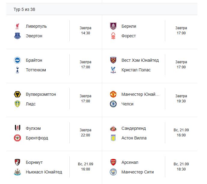 ● Фактически недоступными для прямых трансляций остались только субботние матчи в 15:00. В Англии действует блэкаут – запрет транслировать футбол в субботу с 14:45 до 17:15. Проводить игры в этот день и в это время можно, но увидеть по ТВ – невозможно. То есть сегодняшний матчи в 15-00 (например, «Вест Хэм» – «Кристал Пэлас») не покажут, а вот «МЮ» – «Челси» (17:30) и «Фулхэм» – «Брентфорд» (20:00) будут транслировать