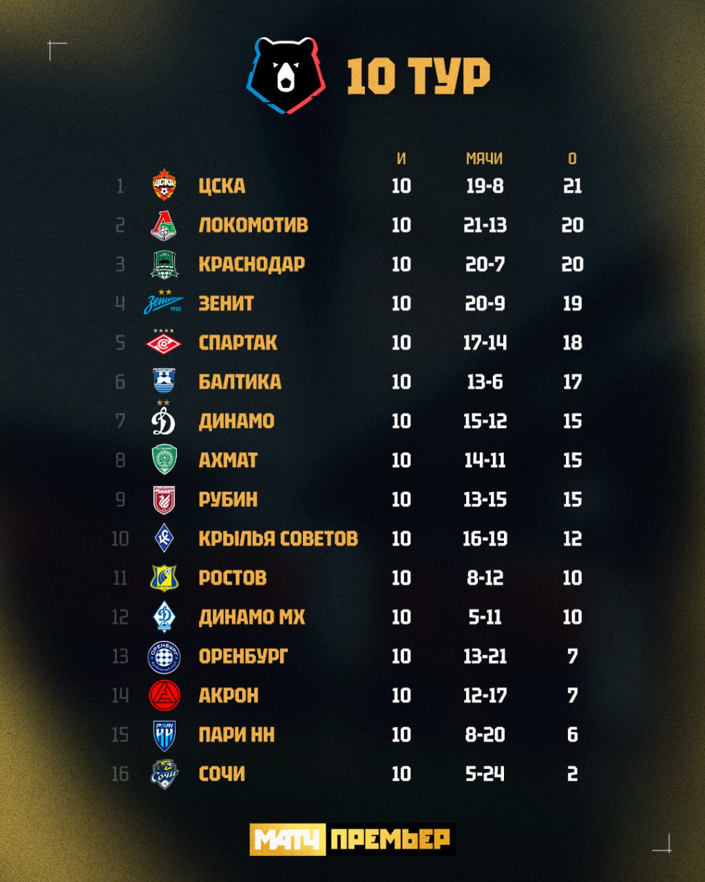 Суперкомпьютер Opta после 10-ти туров РПЛ пророчит Зениту чемпионство, а ЦСКА 2-е место по итогам сезона. На 3-ей строчке расположился Краснодар. Дристачок по традиции поборется с Балтикой и Динамо за шестую строчку.