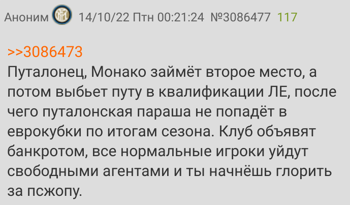 >>3409336 Ну мы точно разных взглядов. Скорее всего не смогу тебя понять. Меня всегда вела ненависть к МЮ, по семейным причинам. Потому вырос контркультурщиком-нитакусиком, поначалу в АПЛ болел в принципе за всех, лишь бы против МЮ Ферги, немного за Ливерпуль с Торресом, немного за Арсенал Венгера, немного за Челси с Дрогба. Но потом будто бог послал лучик света, МС купил шейхи, пришли Боатенг (лол) Коларов, Силва, Яя, (первый закуп с Робиньо и Жо не считаем))) Дальше были Агуэро, уже в клубе были Харт и Компани, Сабалета. Вот тут-то я понял, что это оно, это моё. И если честно, не особо люблю Гвардиолу, но не шиз, спорить с тем, что он великий тренер и живая легенда - не собираюсь. Просто мне не очень нравится. Но всё равно, хоть чёрт лысый, хоть Холанда продайте (лучик который радует пару лет с продажи Альвареза и КДБ), хоть Саутгейта поставьте, лишь бы МЮ сосал. А МЮ сосёт 10 лет. Я 10 лет доволен. Если сити будет 9, а мю 10, я всё равно буду доволен. Это база.