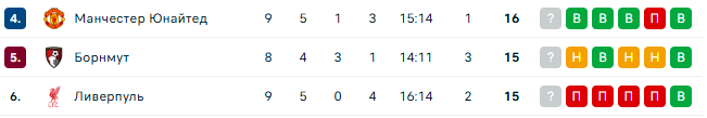 Ливерпуль: 1 тур забил первым (вин) 2 тур забил первым (вин) 3 тур забил первым (вин) 4 тур забил первым (вин) 5 тур забил первым (вин) 6 тур пропустил первым (луз) 7 тур пропустил первым (луз) 8 тур пропустил первым (луз) 9 тур пропустил первым (луз?)